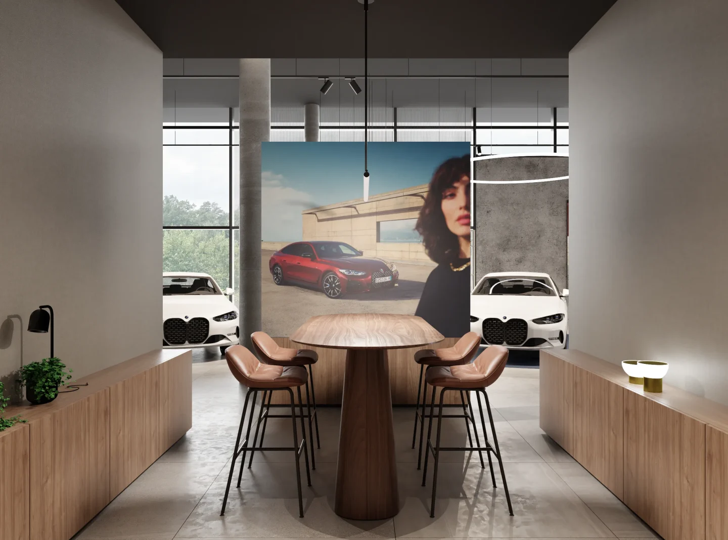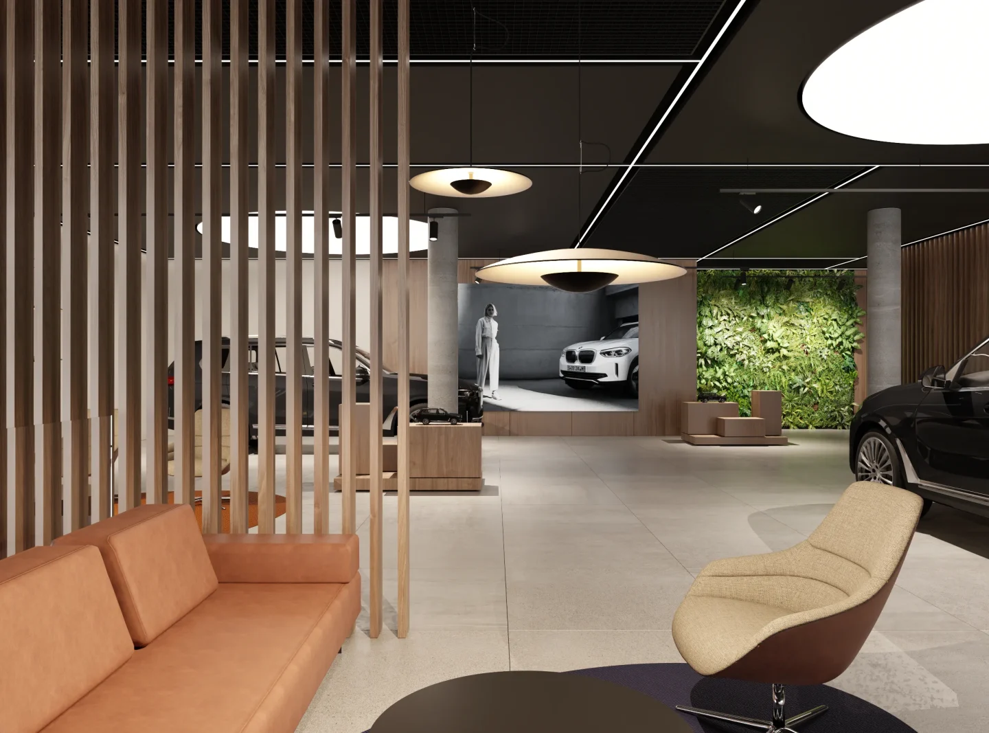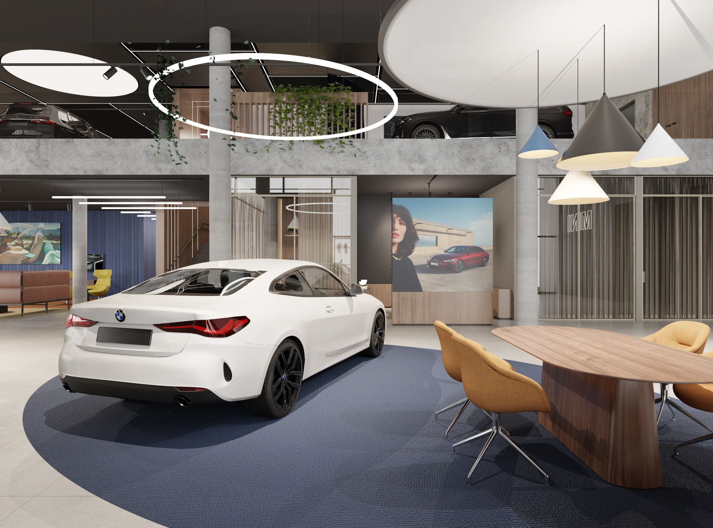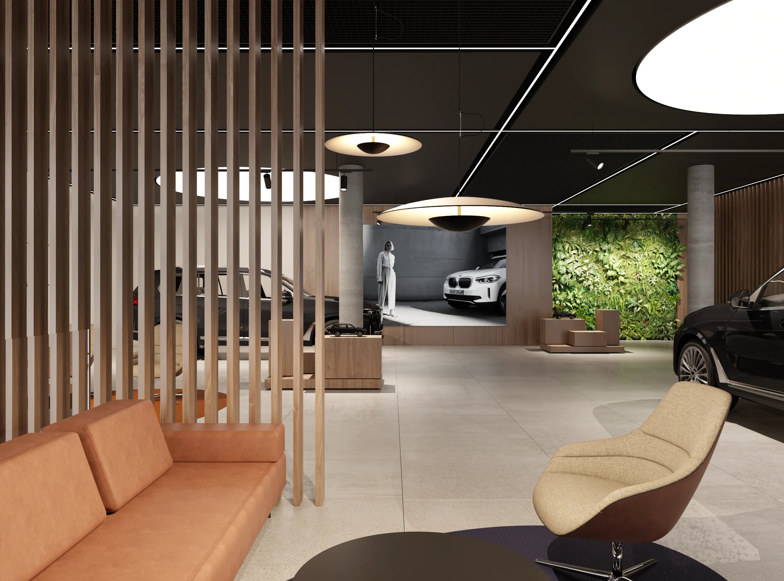 Na jego podstawie powstała adaptacja wnętrz salonu w Lubiczu Dolnym. Wnętrza utrzymane są w bardzo ciepłym, nowoczesnym, przytulnym klimacie. Strefy przeznaczone dla klientów wypełniają piękne, wygodne, designerskie meble oraz lampy. Tłem dla mebli są ciepłe, wzorzyste okleiny ścienne, oraz płyty o wzorze drewna. Nie mogło zabraknąć też akcentów natury w postaci zielonych ścian. Rośliny zawsze dodają pozytywnej energii we wnętrzach.
