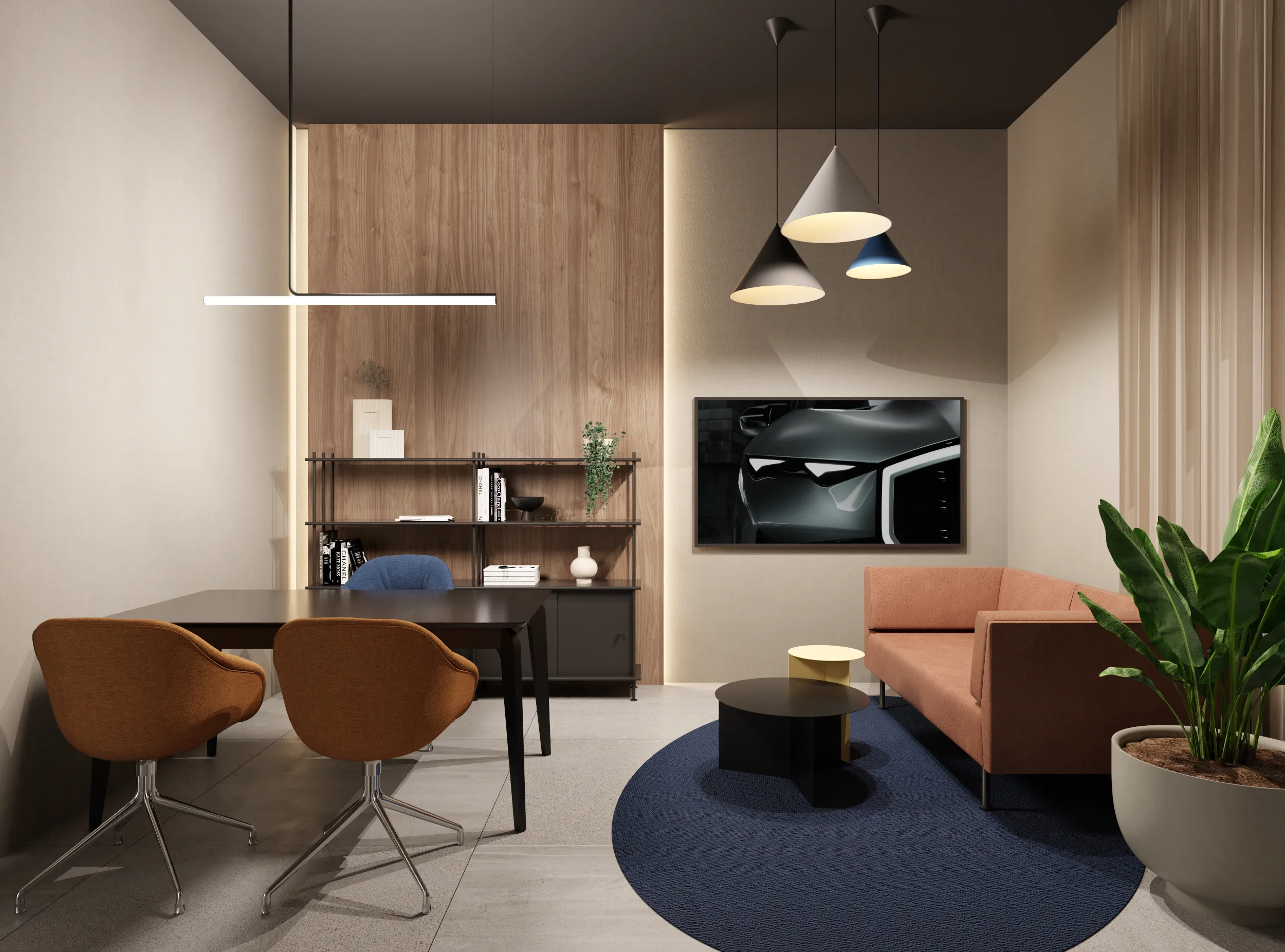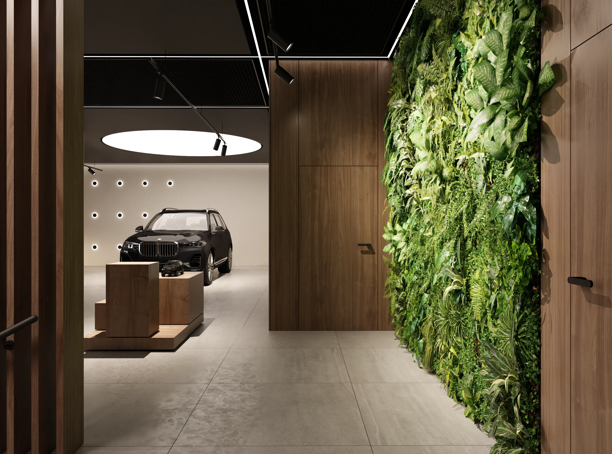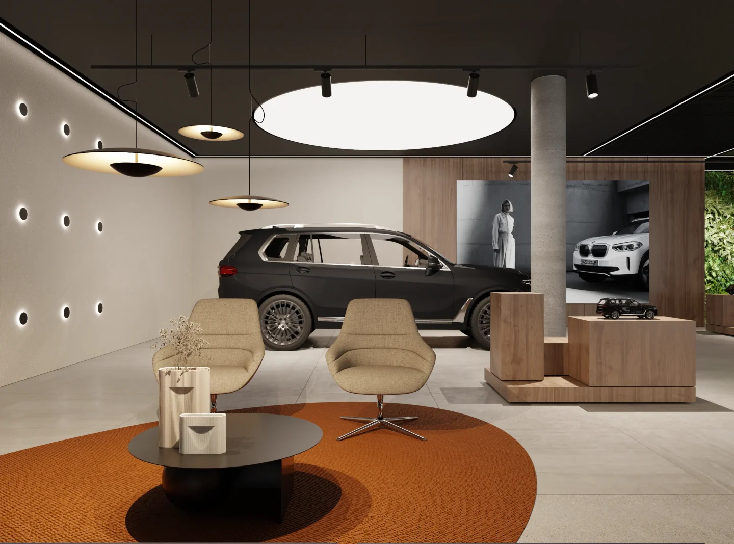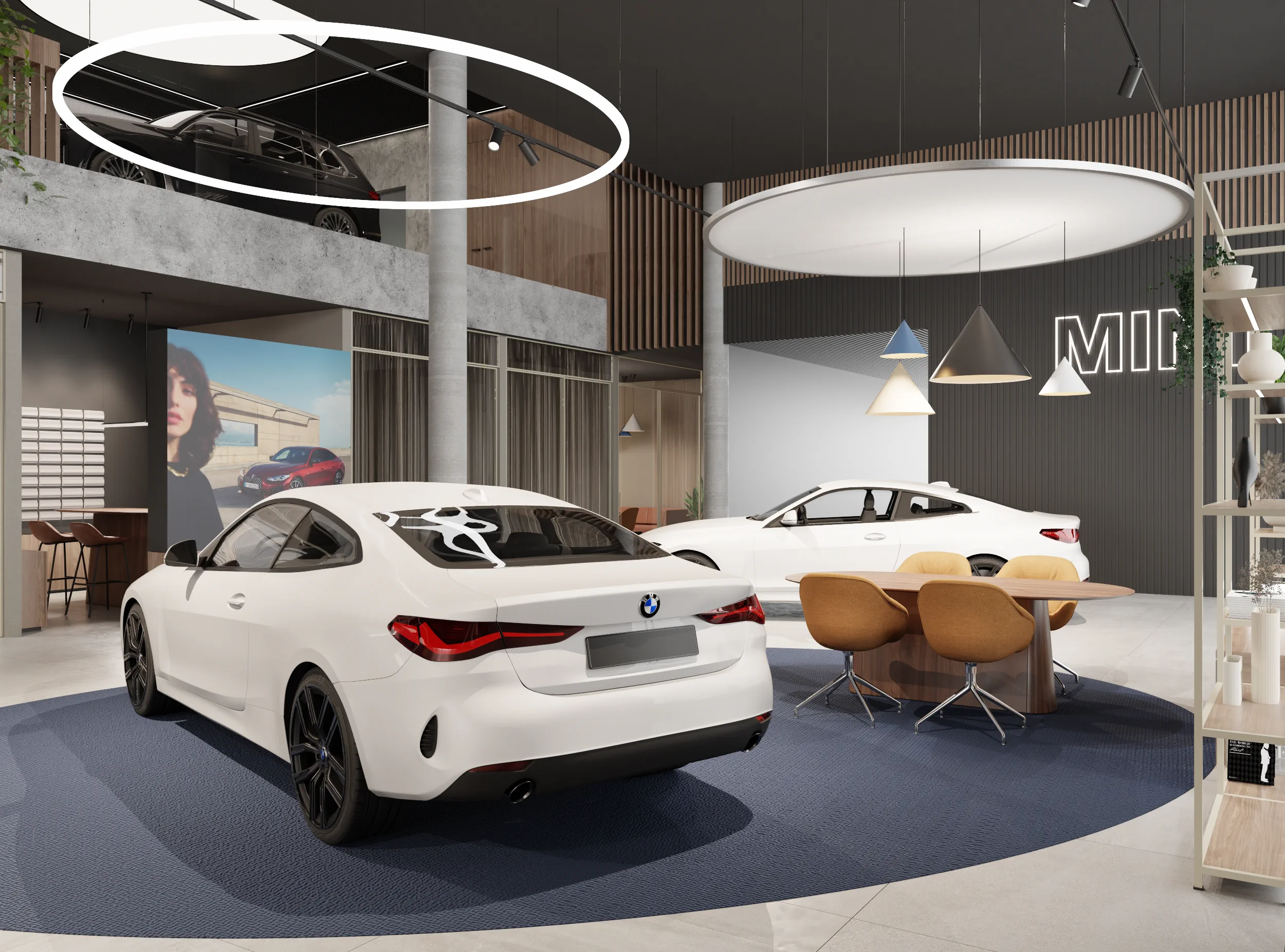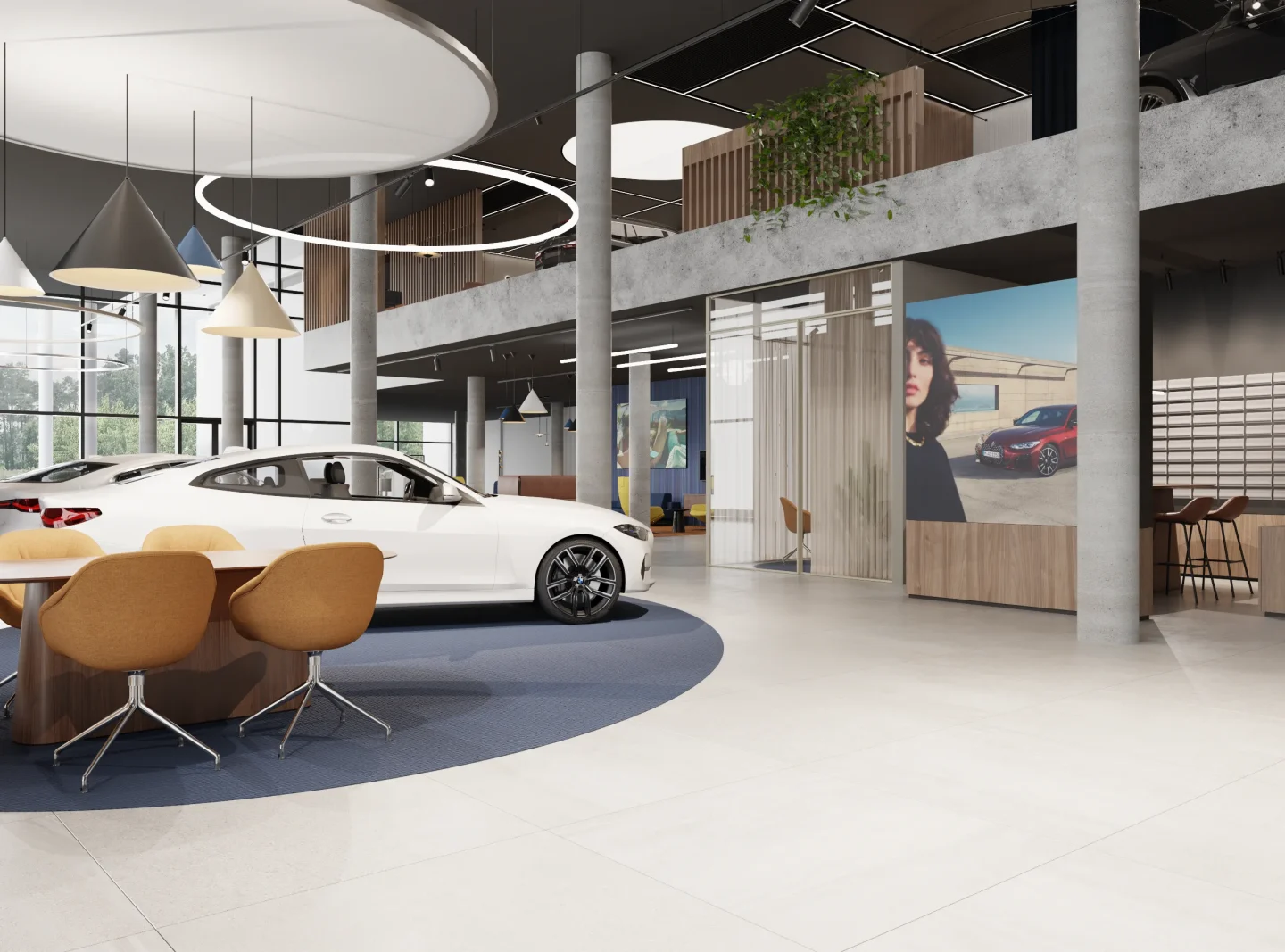 Na jego podstawie powstała adaptacja wnętrz salonu w Lubiczu Dolnym. Wnętrza utrzymane są w bardzo ciepłym, nowoczesnym, przytulnym klimacie. Strefy przeznaczone dla klientów wypełniają piękne, wygodne, designerskie meble oraz lampy. Tłem dla mebli są ciepłe, wzorzyste okleiny ścienne, oraz płyty o wzorze drewna. Nie mogło zabraknąć też akcentów natury w postaci zielonych ścian. Rośliny zawsze dodają pozytywnej energii we wnętrzach.
