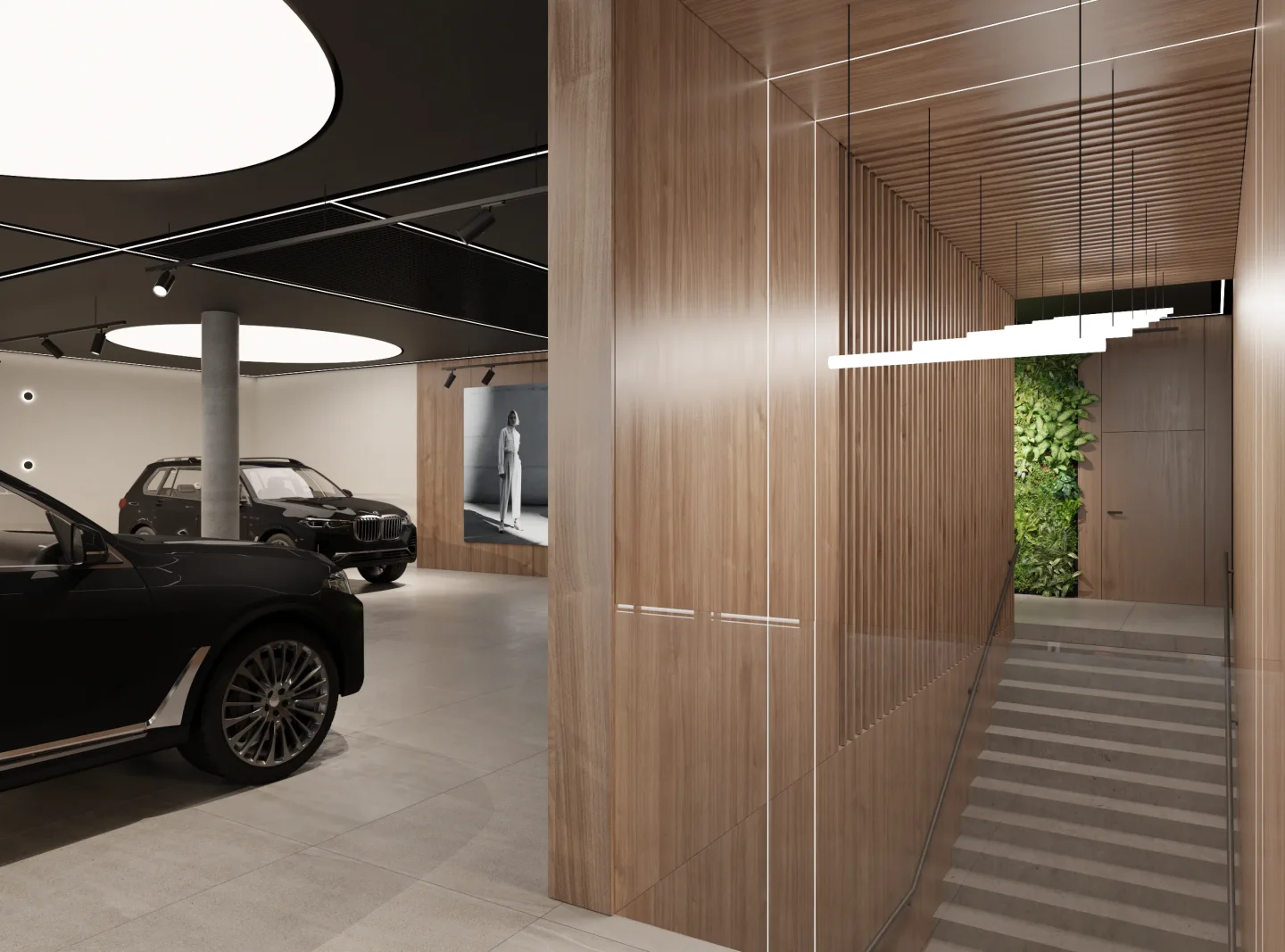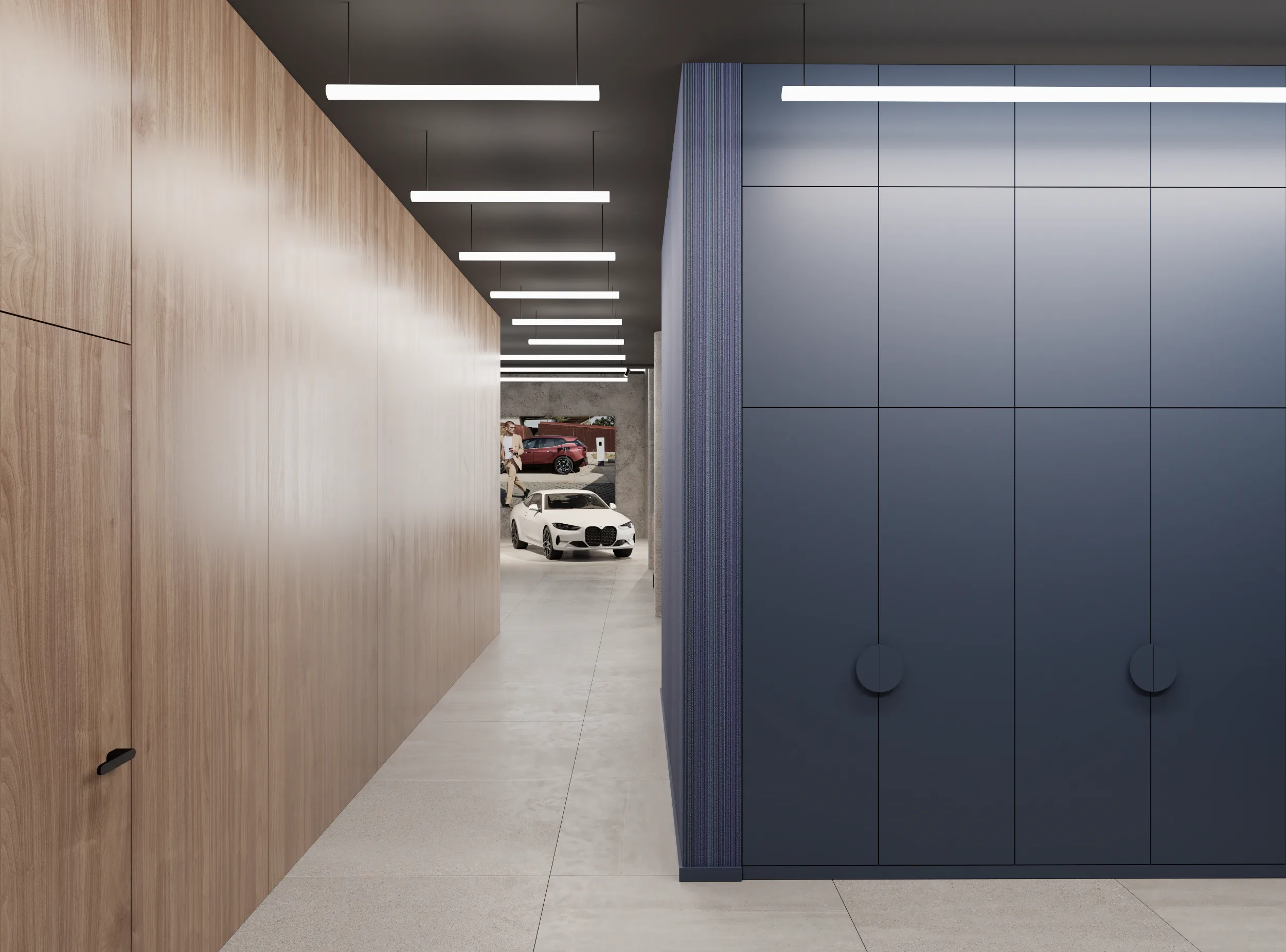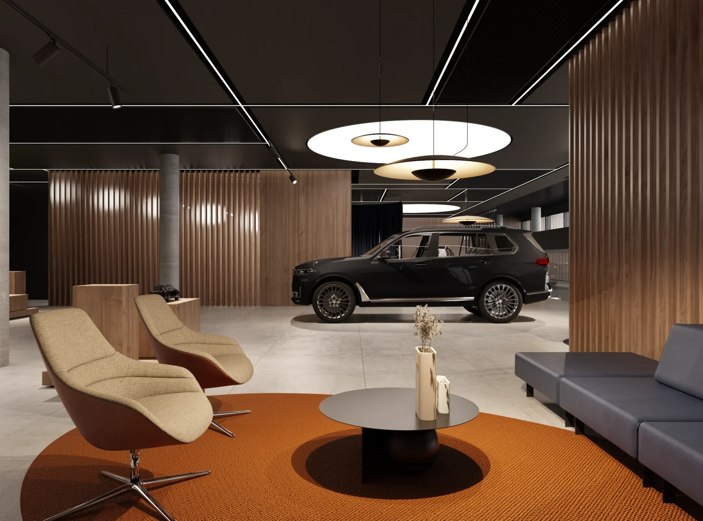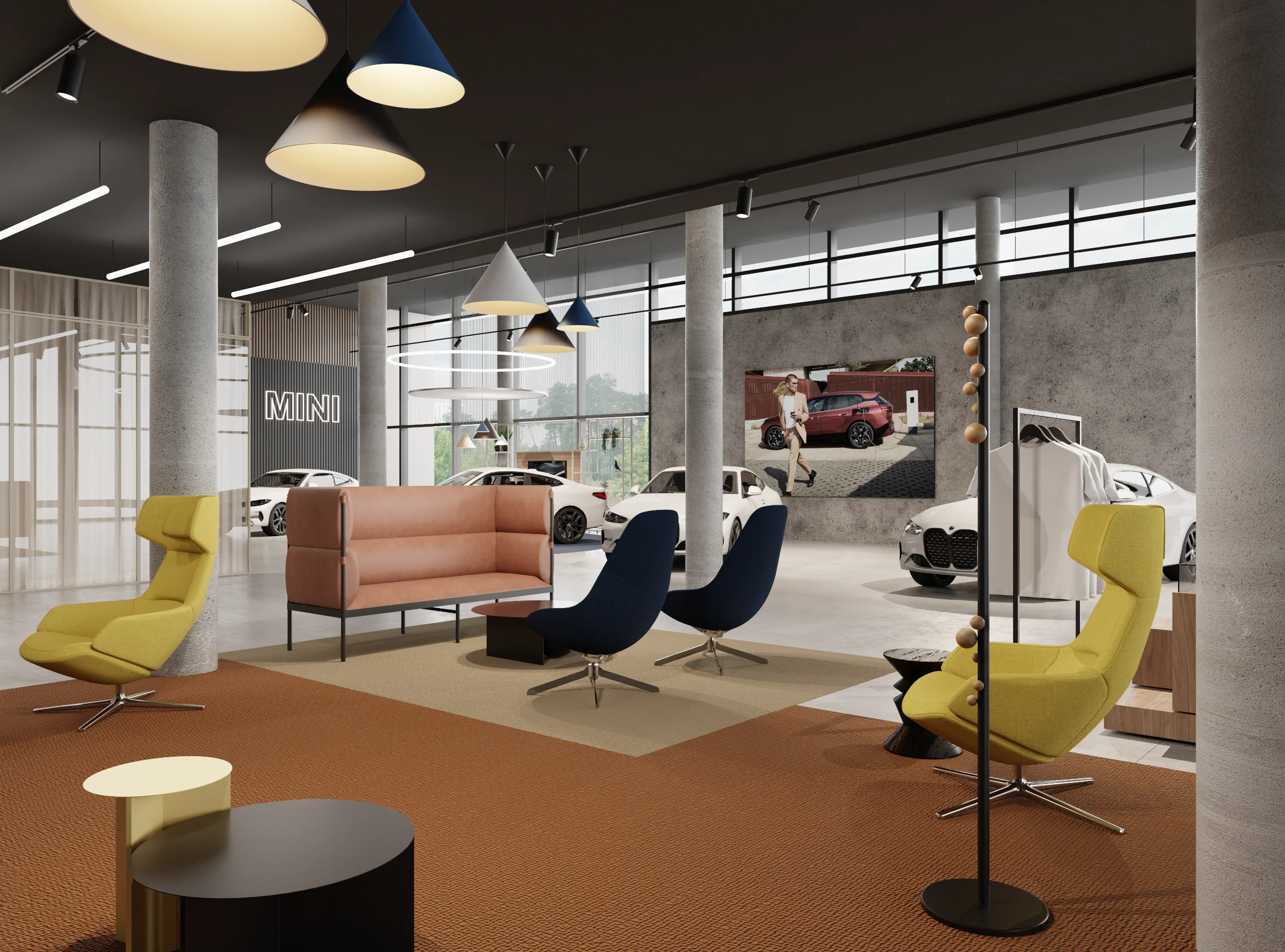 Na jego podstawie powstała adaptacja wnętrz salonu w Lubiczu Dolnym. Wnętrza utrzymane są w bardzo ciepłym, nowoczesnym, przytulnym klimacie. Strefy przeznaczone dla klientów wypełniają piękne, wygodne, designerskie meble oraz lampy. Tłem dla mebli są ciepłe, wzorzyste okleiny ścienne, oraz płyty o wzorze drewna. Nie mogło zabraknąć też akcentów natury w postaci zielonych ścian. Rośliny zawsze dodają pozytywnej energii we wnętrzach.