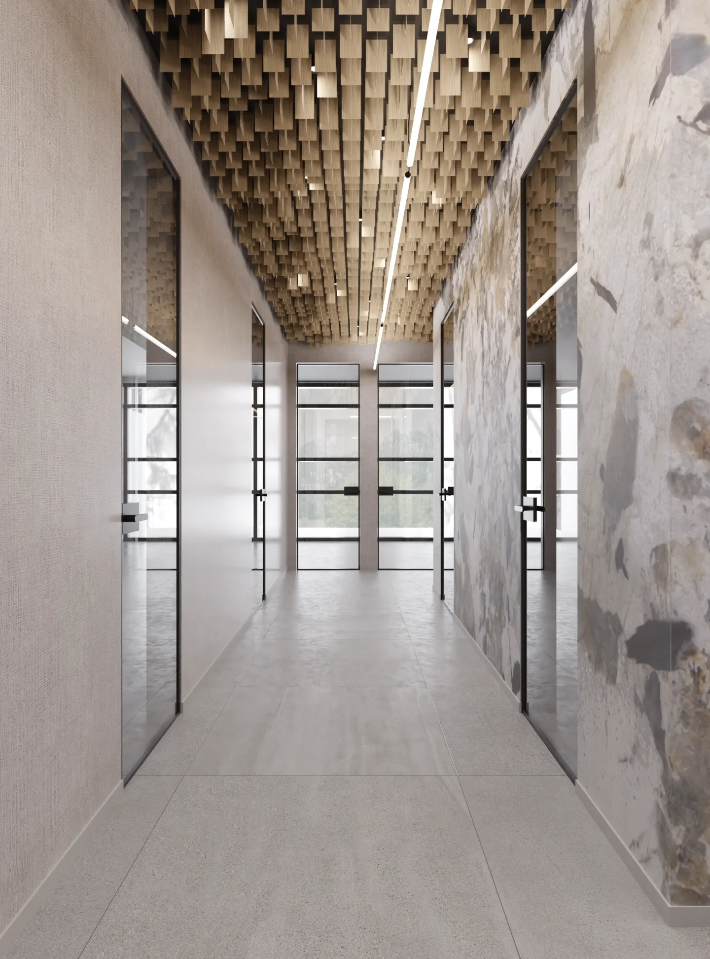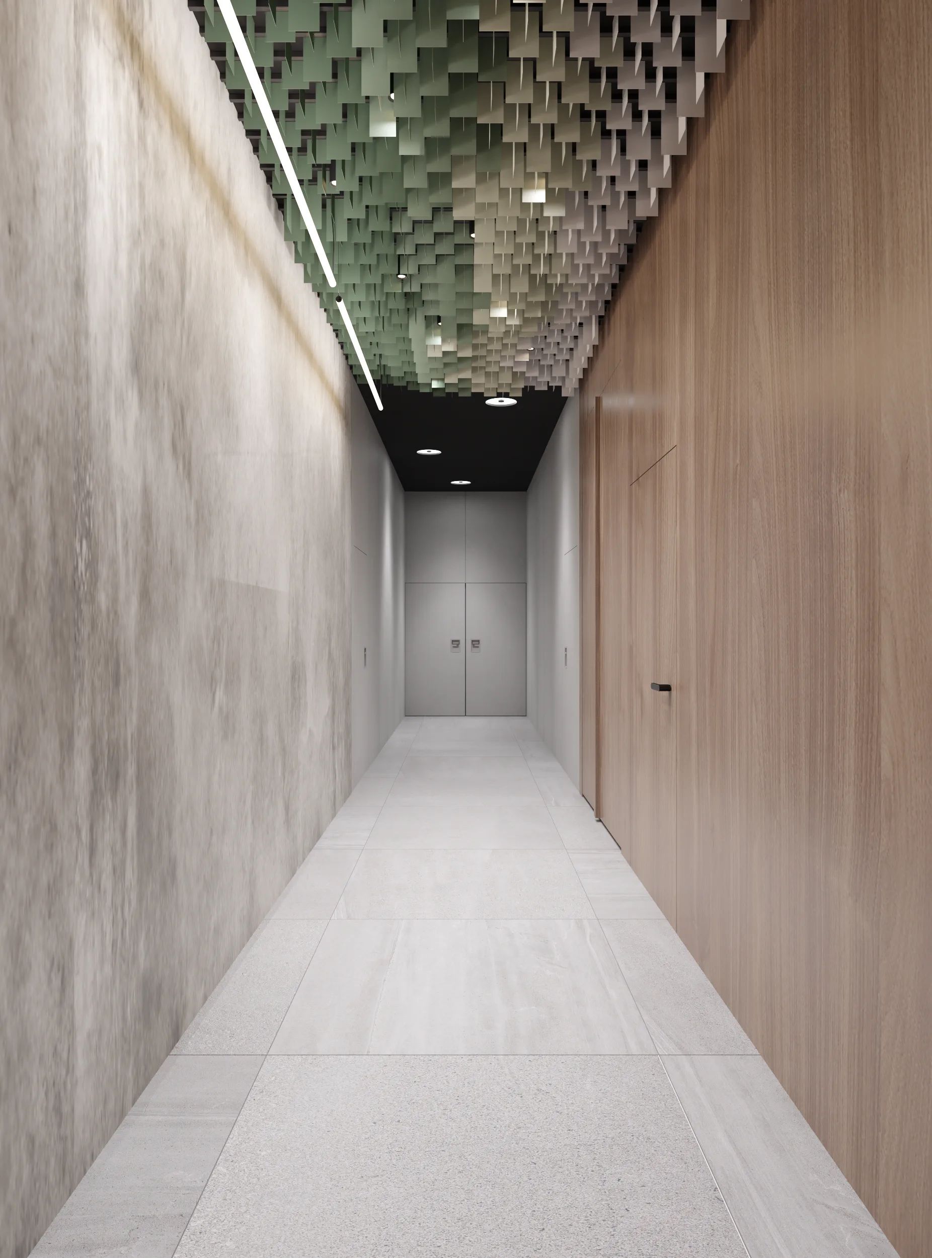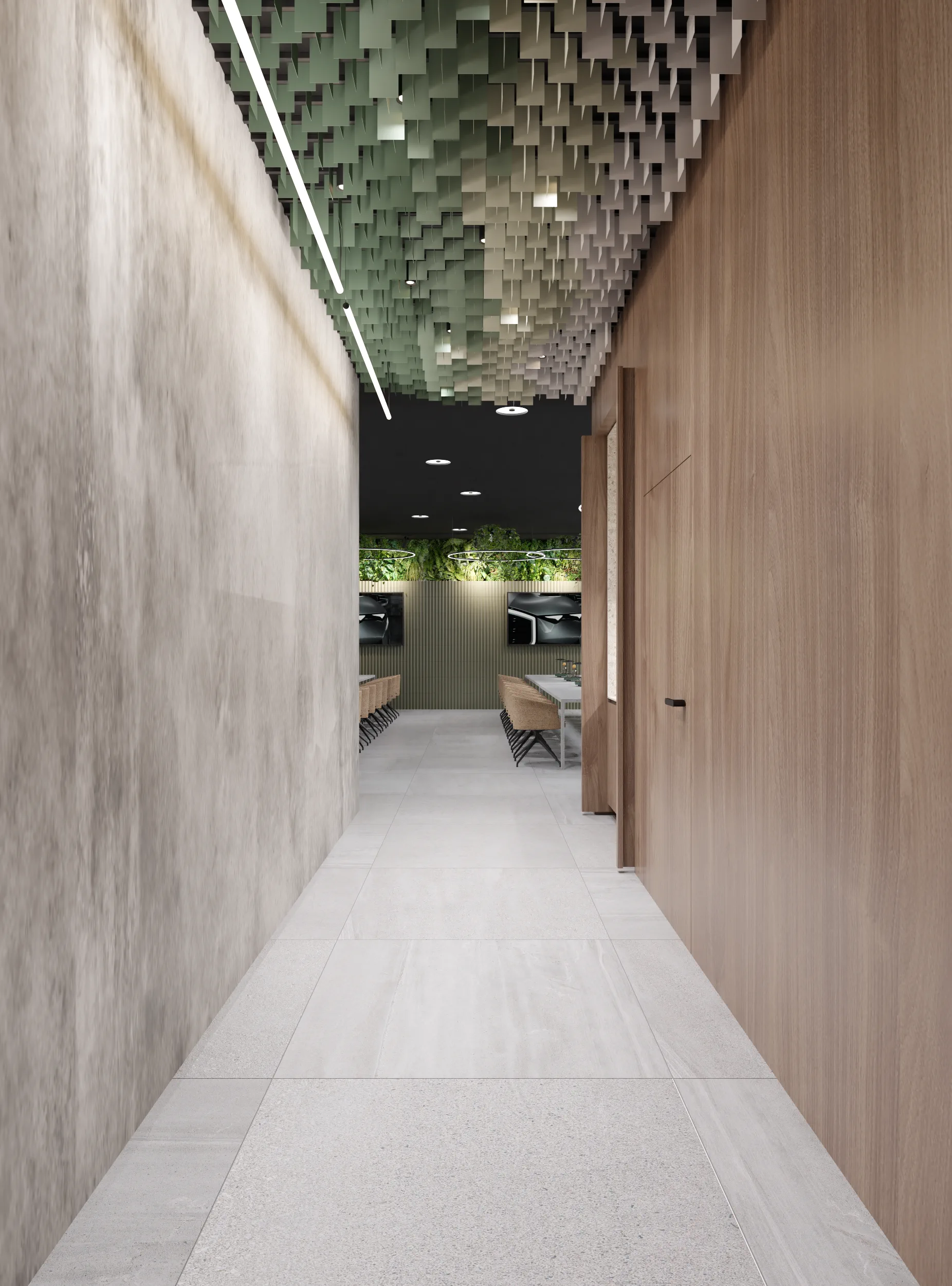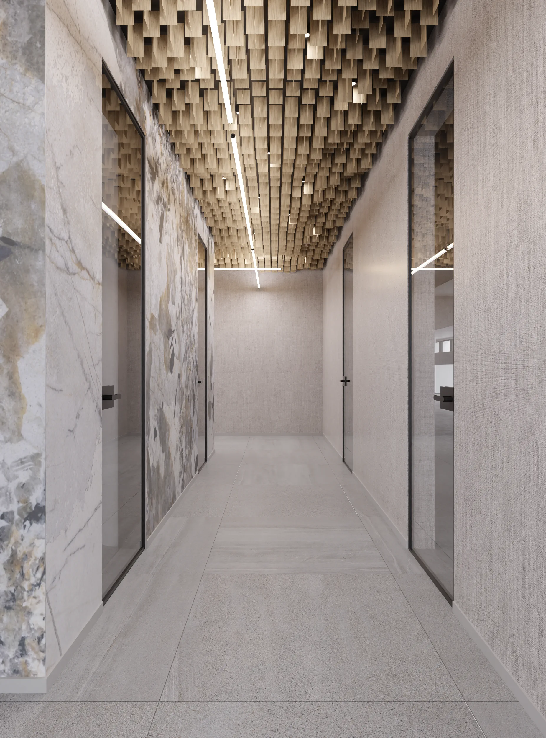 W tej przestrzeni najważniejszą rolę odgrywa sufit złożony z blaszek o różnej wysokości tworzących miękkie, falujące kształty. Korytarze do biur zostały utrzymane w tej samej stylistyce, jedynie drzwi są szklane, żeby na korytarz wpadało więcej światła z pomieszczeń.