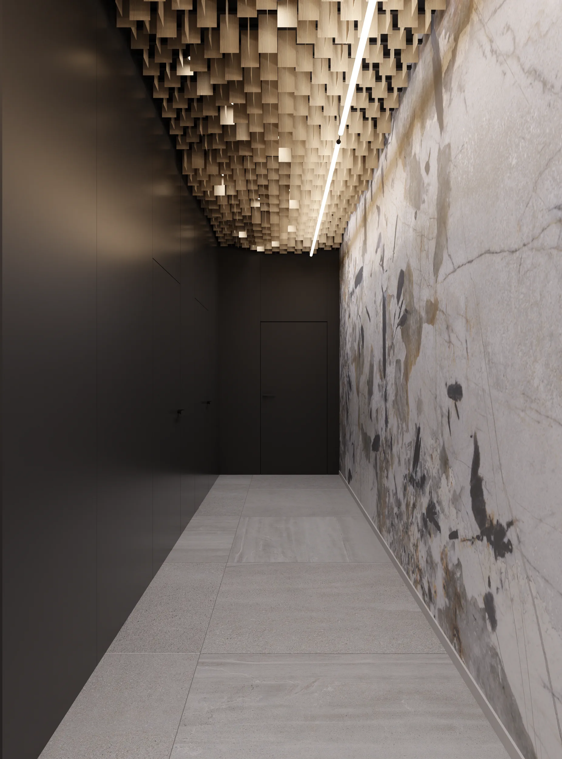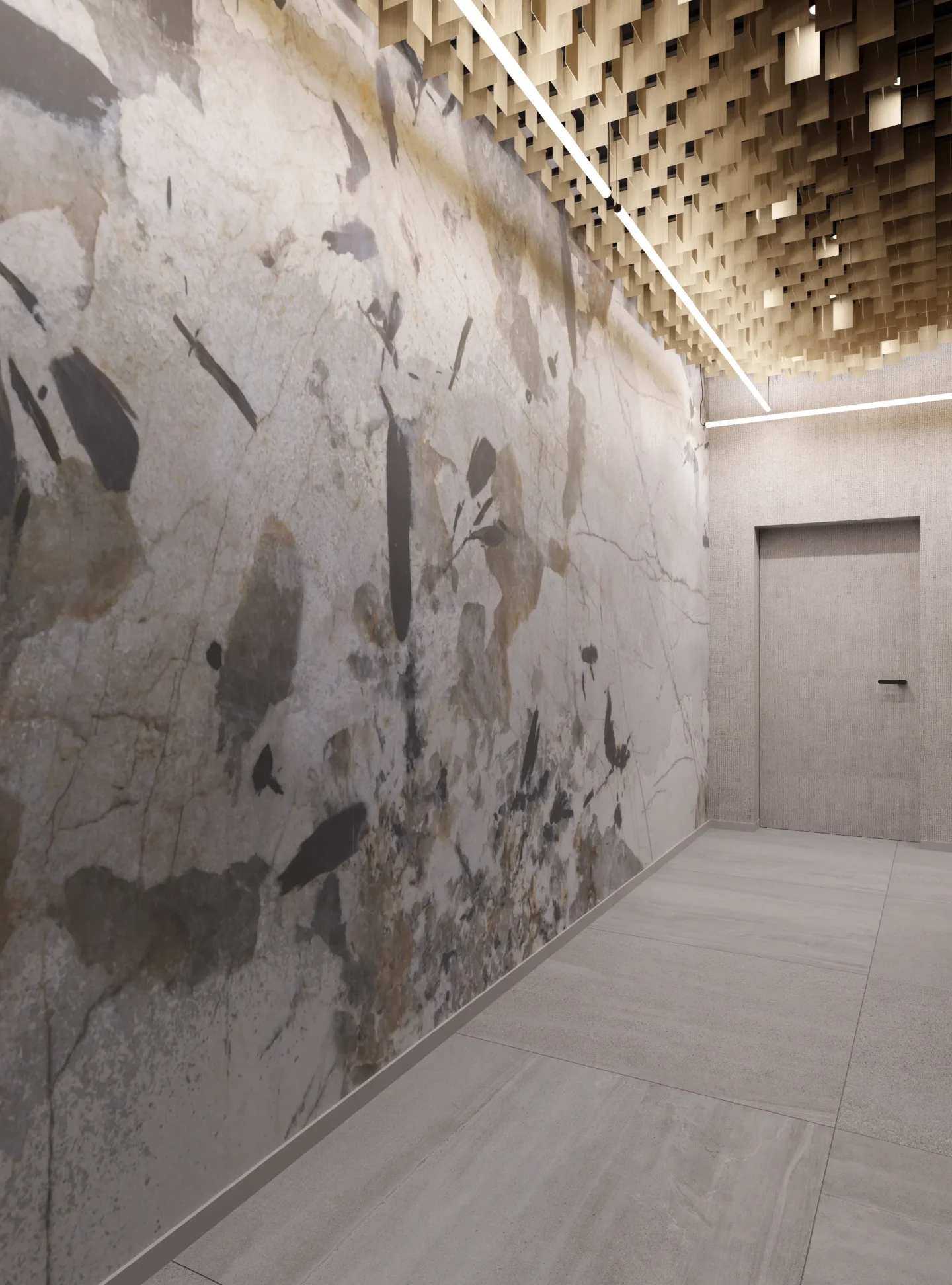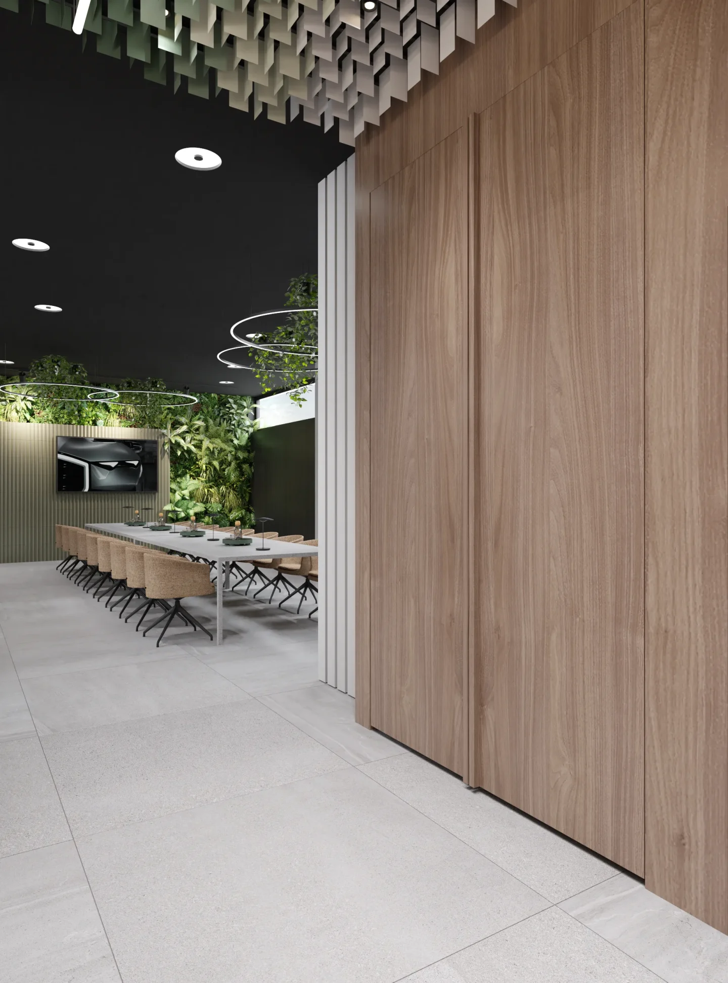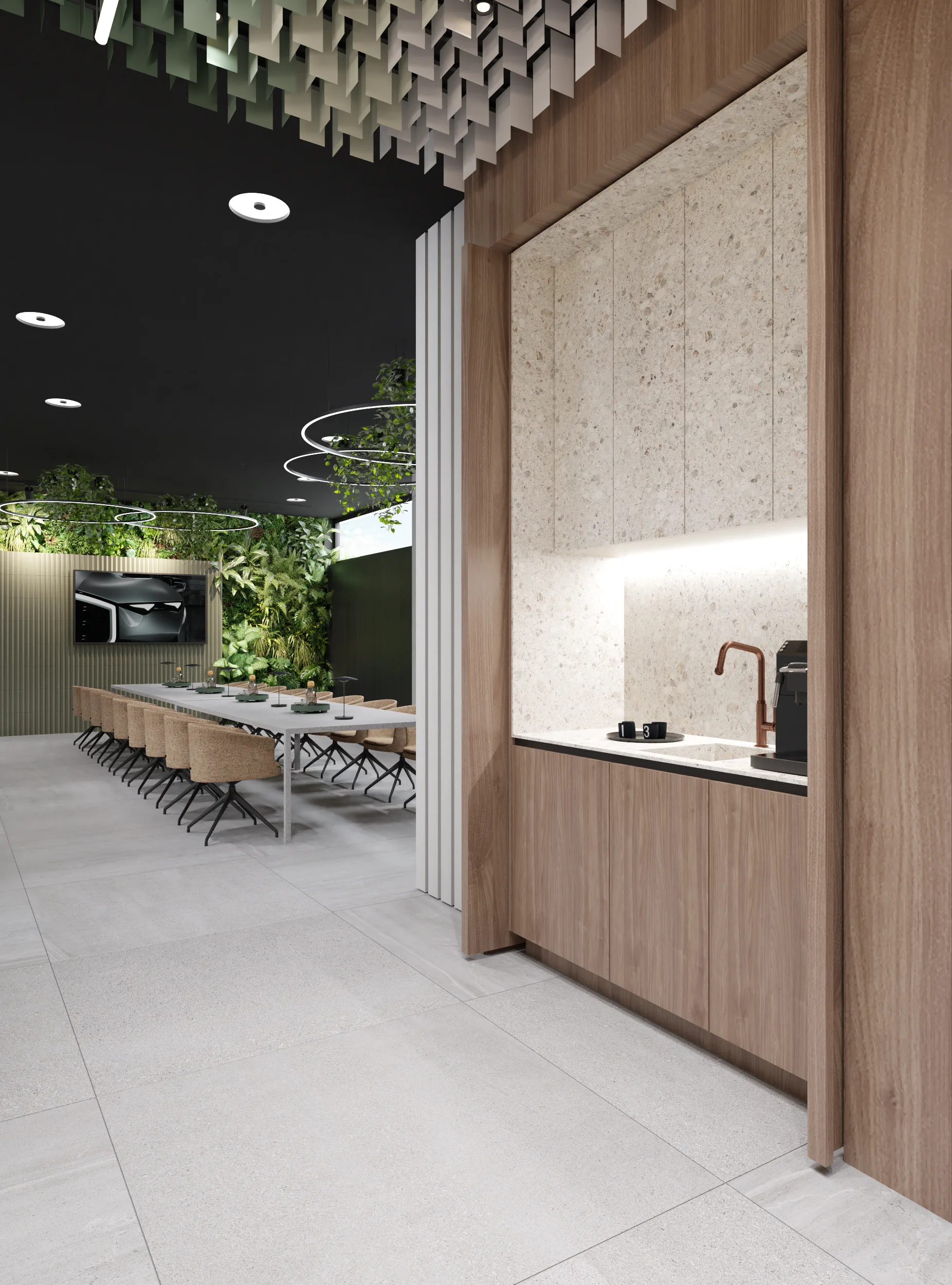 W tej przestrzeni najważniejszą rolę odgrywa sufit złożony z blaszek o różnej wysokości tworzących miękkie, falujące kształty. Korytarze do biur zostały utrzymane w tej samej stylistyce, jedynie drzwi są szklane, żeby na korytarz wpadało więcej światła z pomieszczeń.