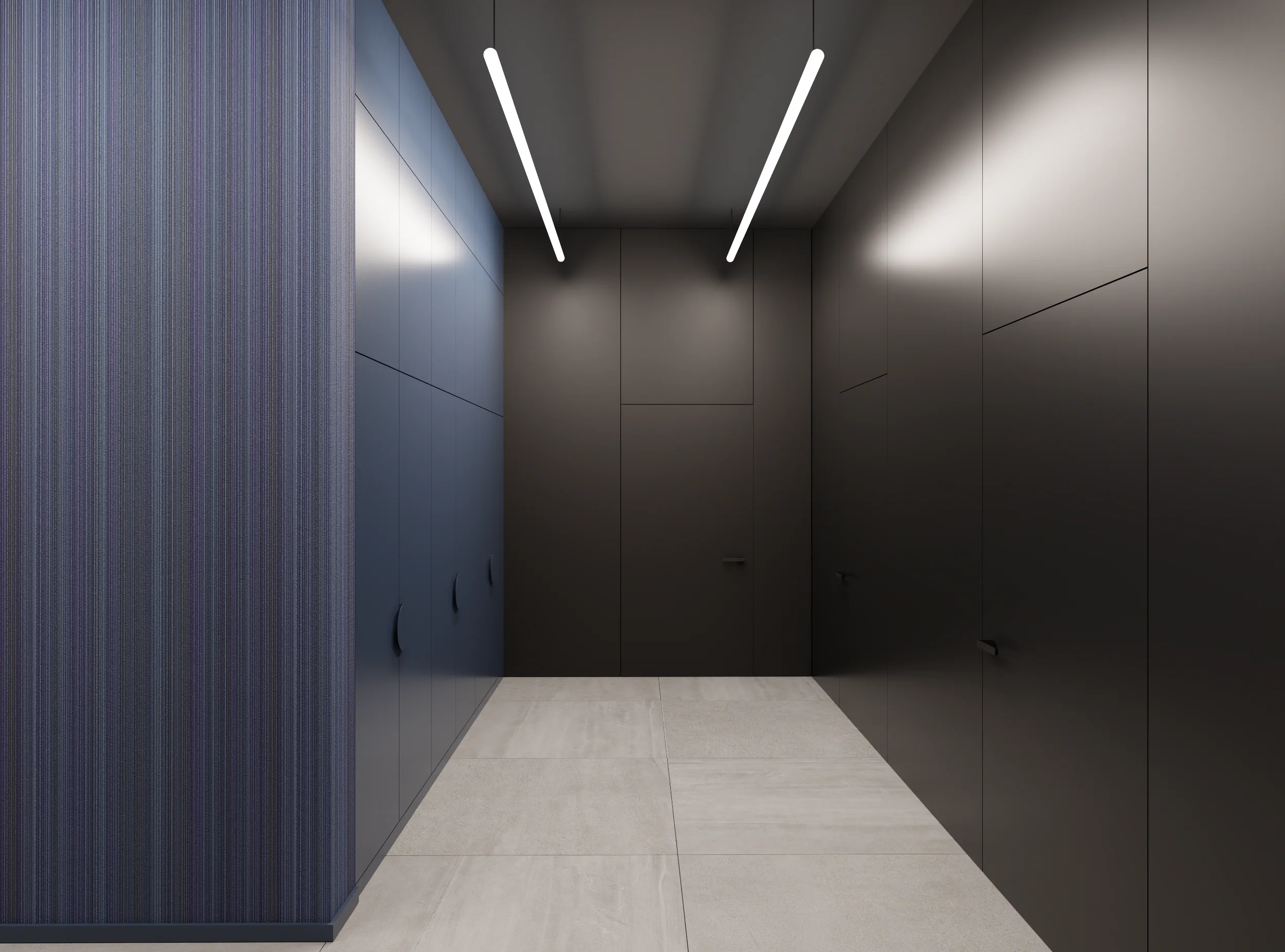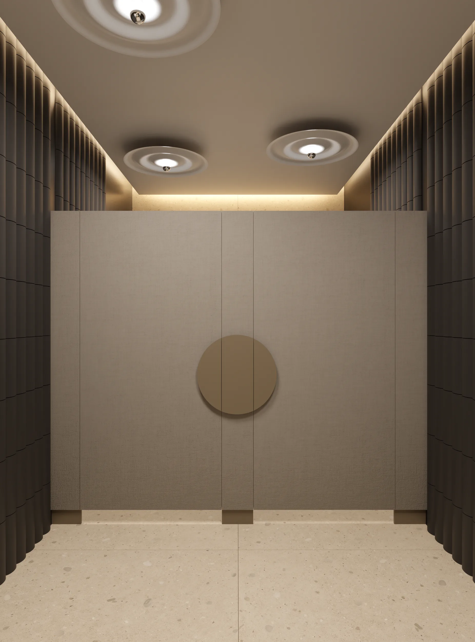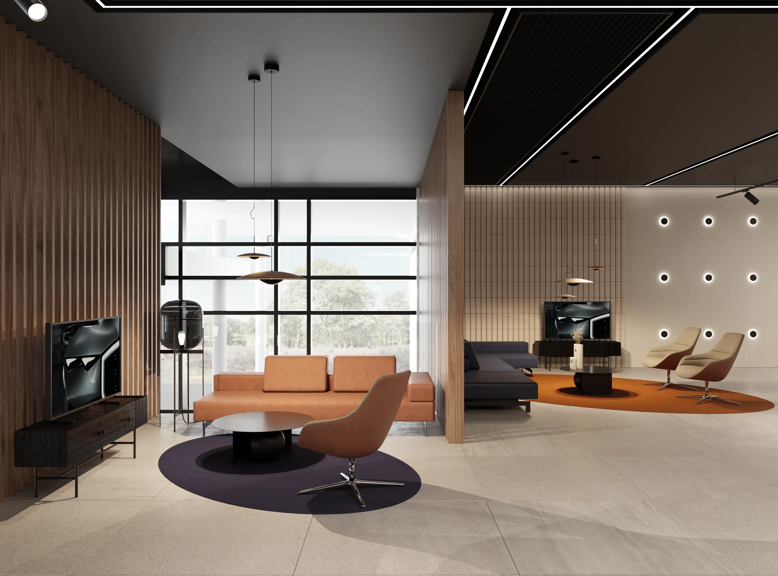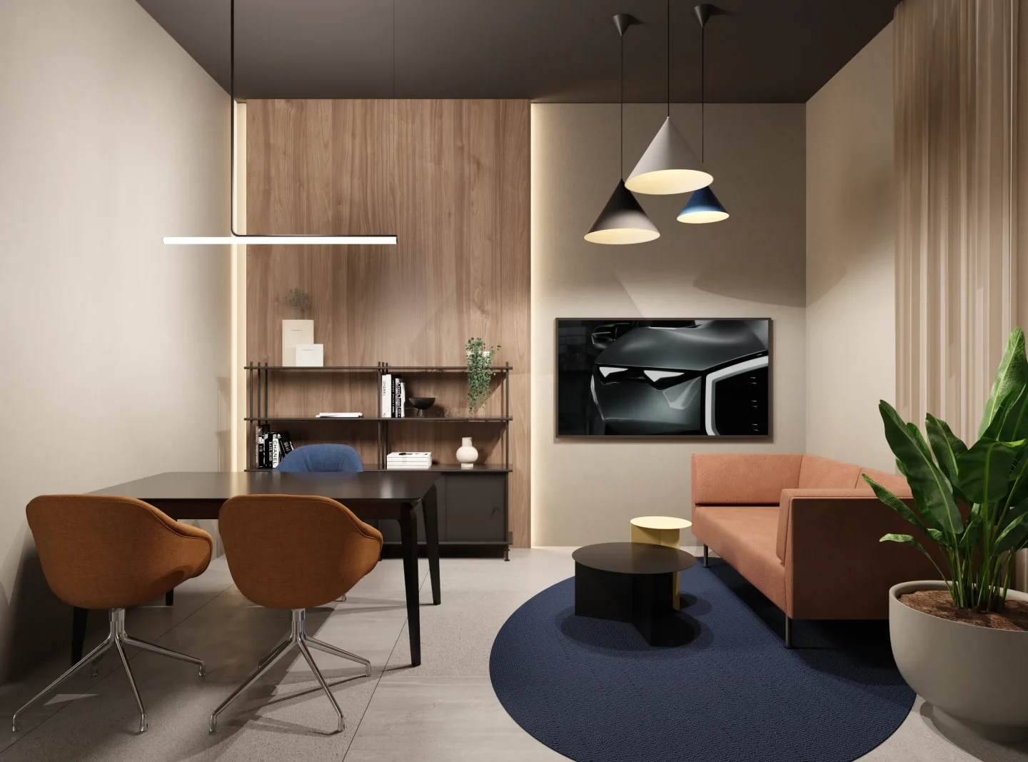 W tej przestrzeni najważniejszą rolę odgrywa sufit złożony z blaszek o różnej wysokości tworzących miękkie, falujące kształty. Korytarze do biur zostały utrzymane w tej samej stylistyce, jedynie drzwi są szklane, żeby na korytarz wpadało więcej światła z pomieszczeń.