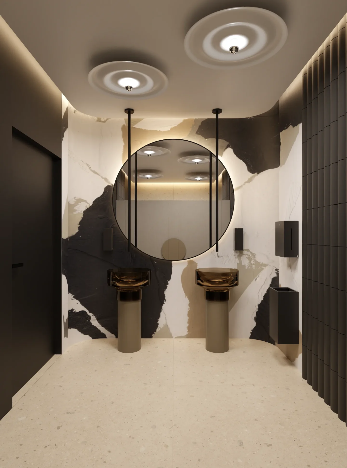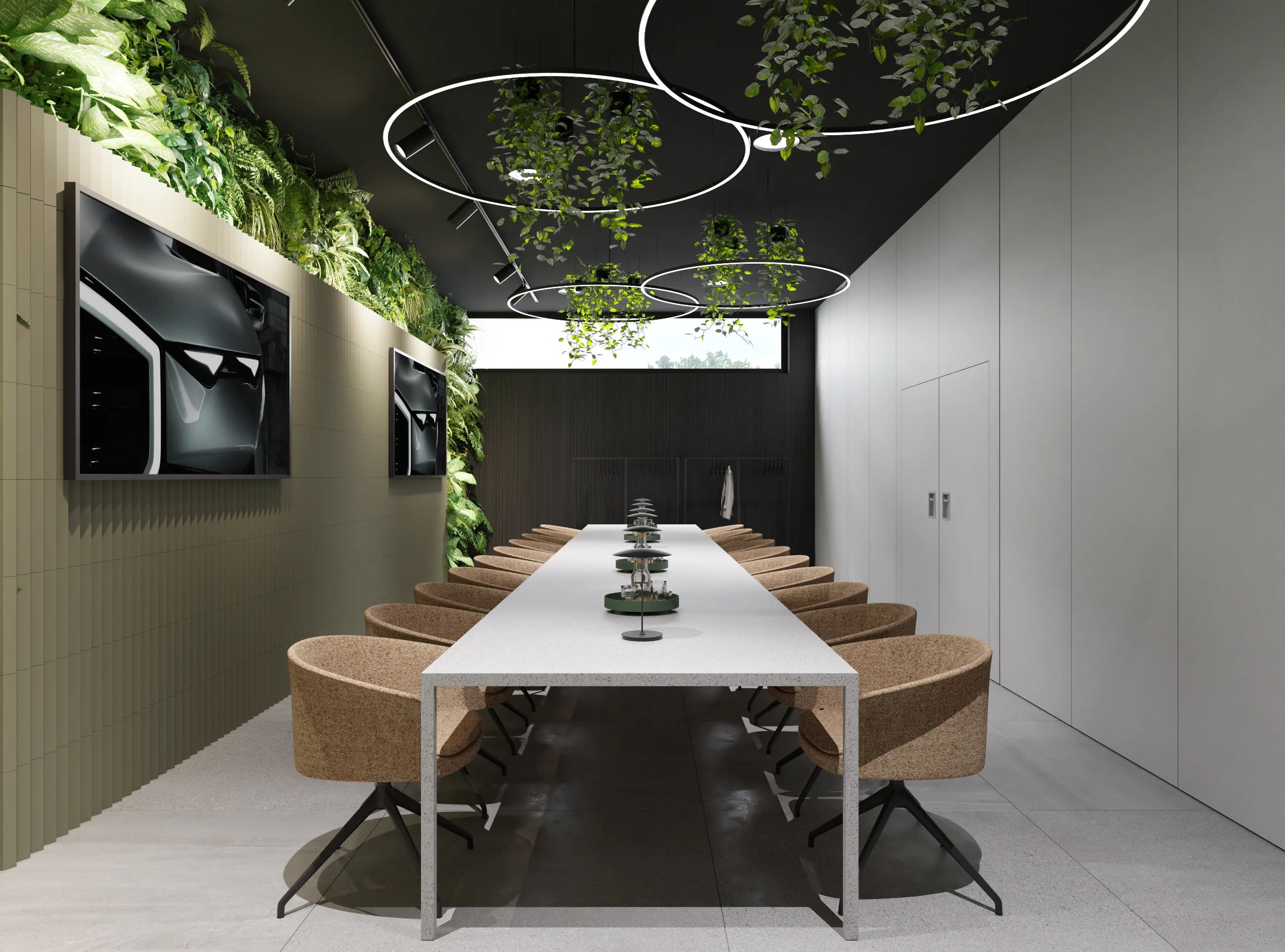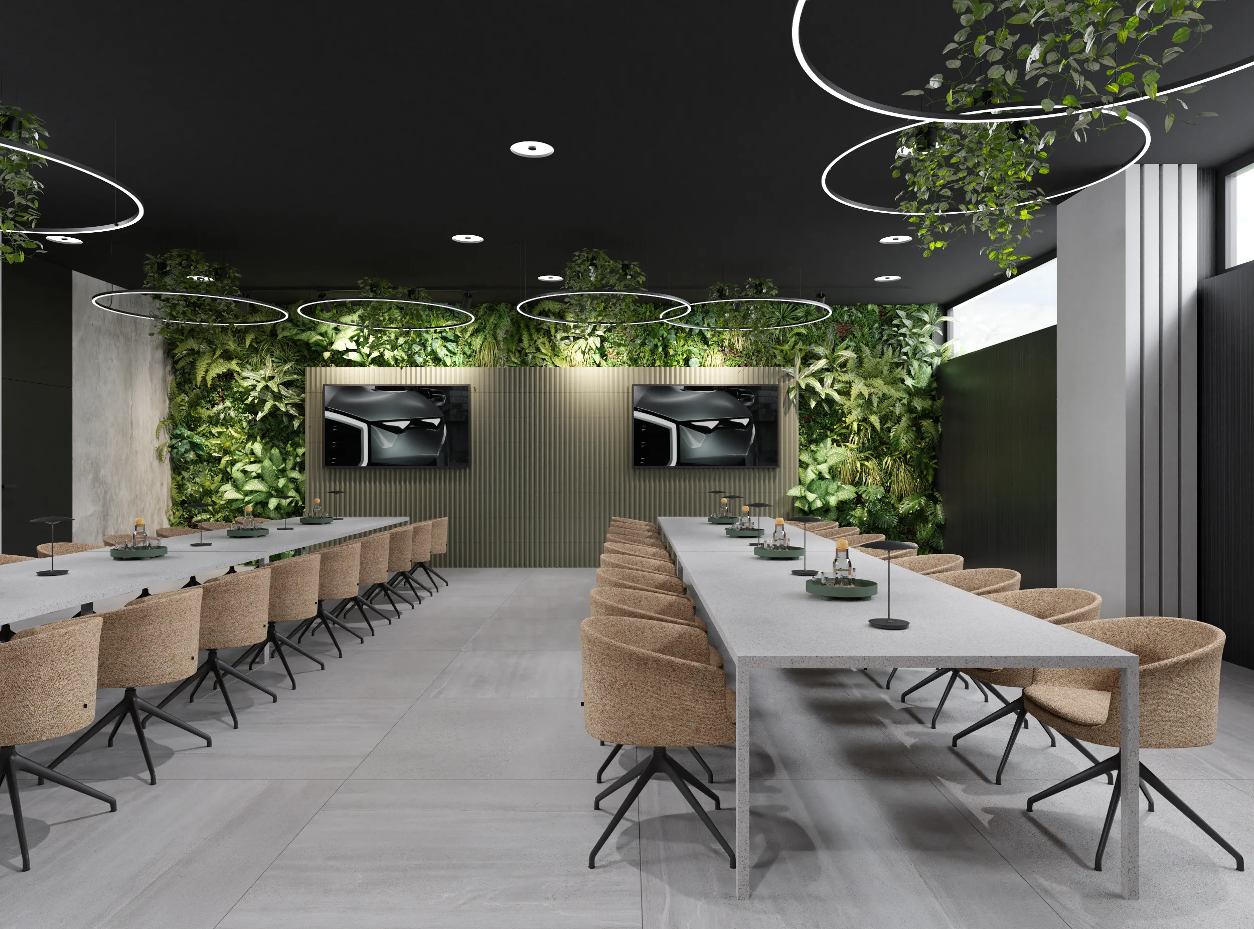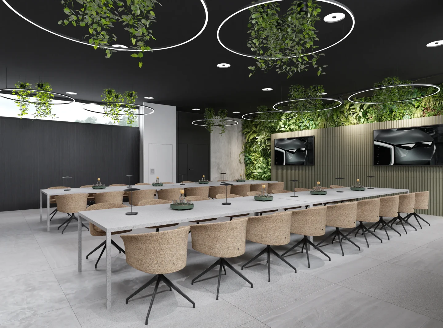 Tajemniczości i klimatu wnętrzom toalet nadają płytki wielkoformatowe w kolorze czerni. Sale konferencyjne podzielone są mobilnymi ścianami i w miarę możliwości można otwierać lub dzielić przestrzeń. W korytarzu do sali konferencyjnej ukryty został aneks kuchenny za wysokimi frontami, które licują się z płytami na ścianie i w razie potrzeby ukrywają całkowicie roboczą przestrzeń. Długą ścianę korytarza do toalet pokrywa wielkoformatowa grafika ścienna, drzwi do toalet ukryte są na ścianie wyłożonej płytkami wielkoformatowymi w kolorze czerni.