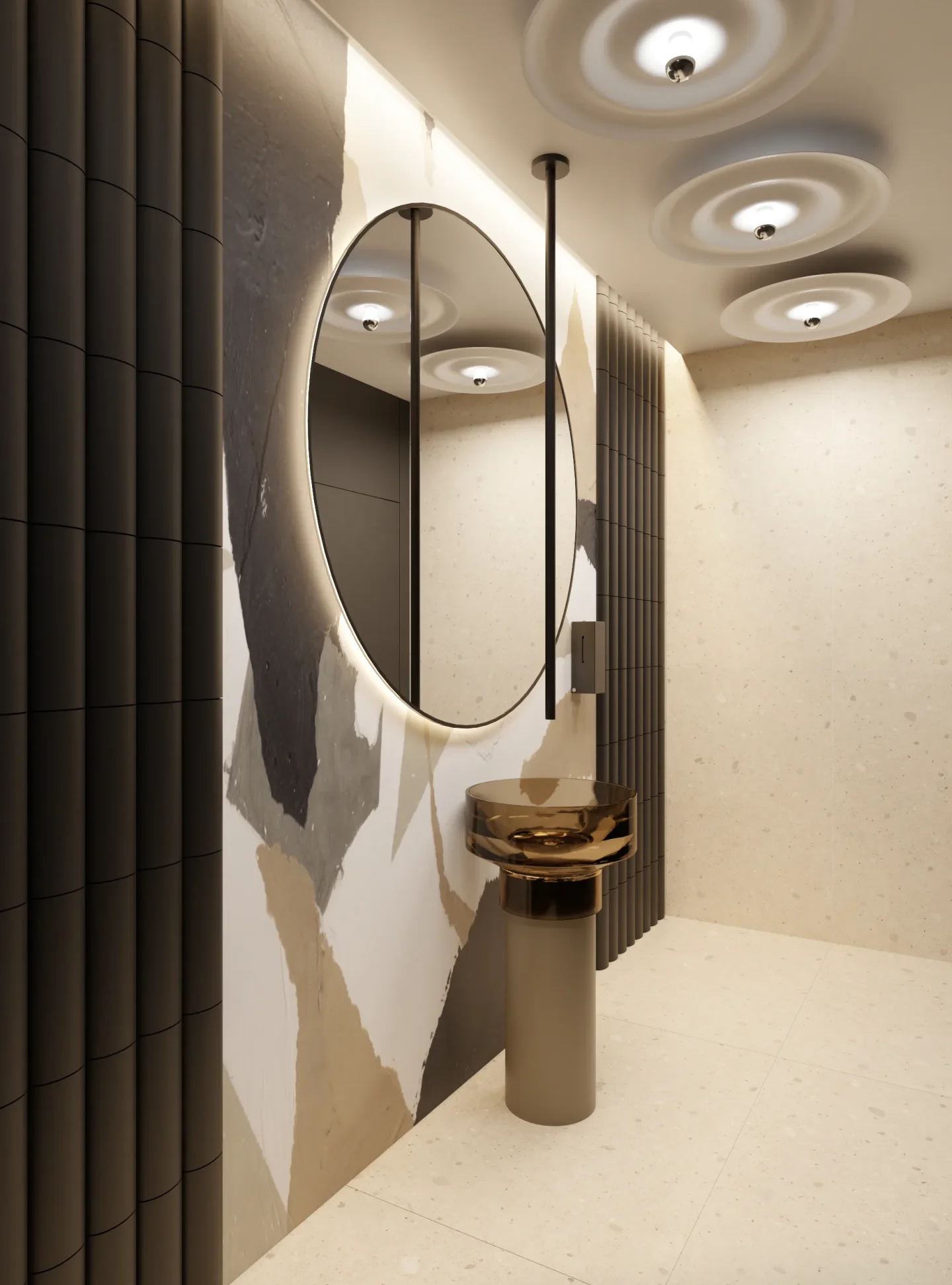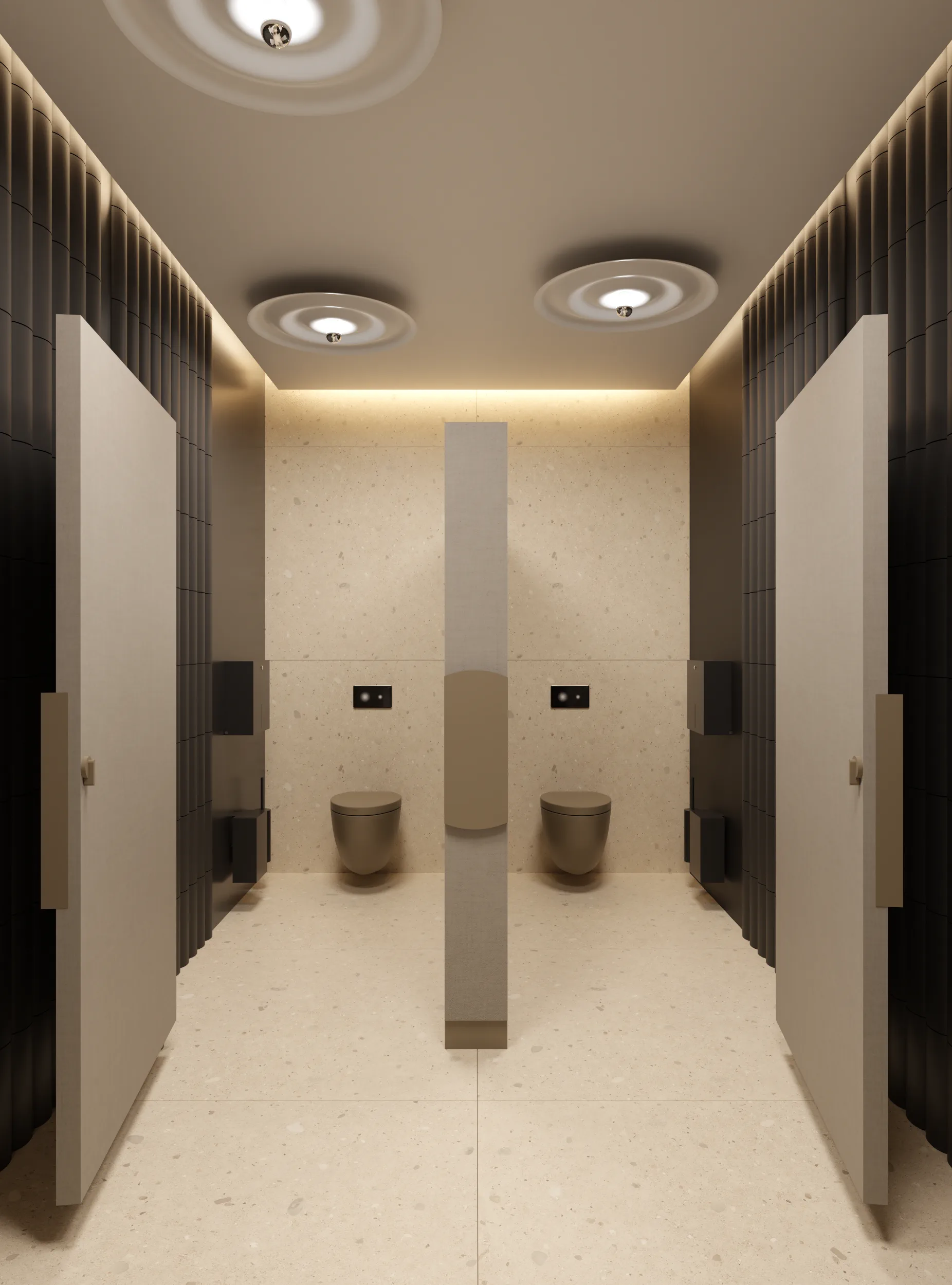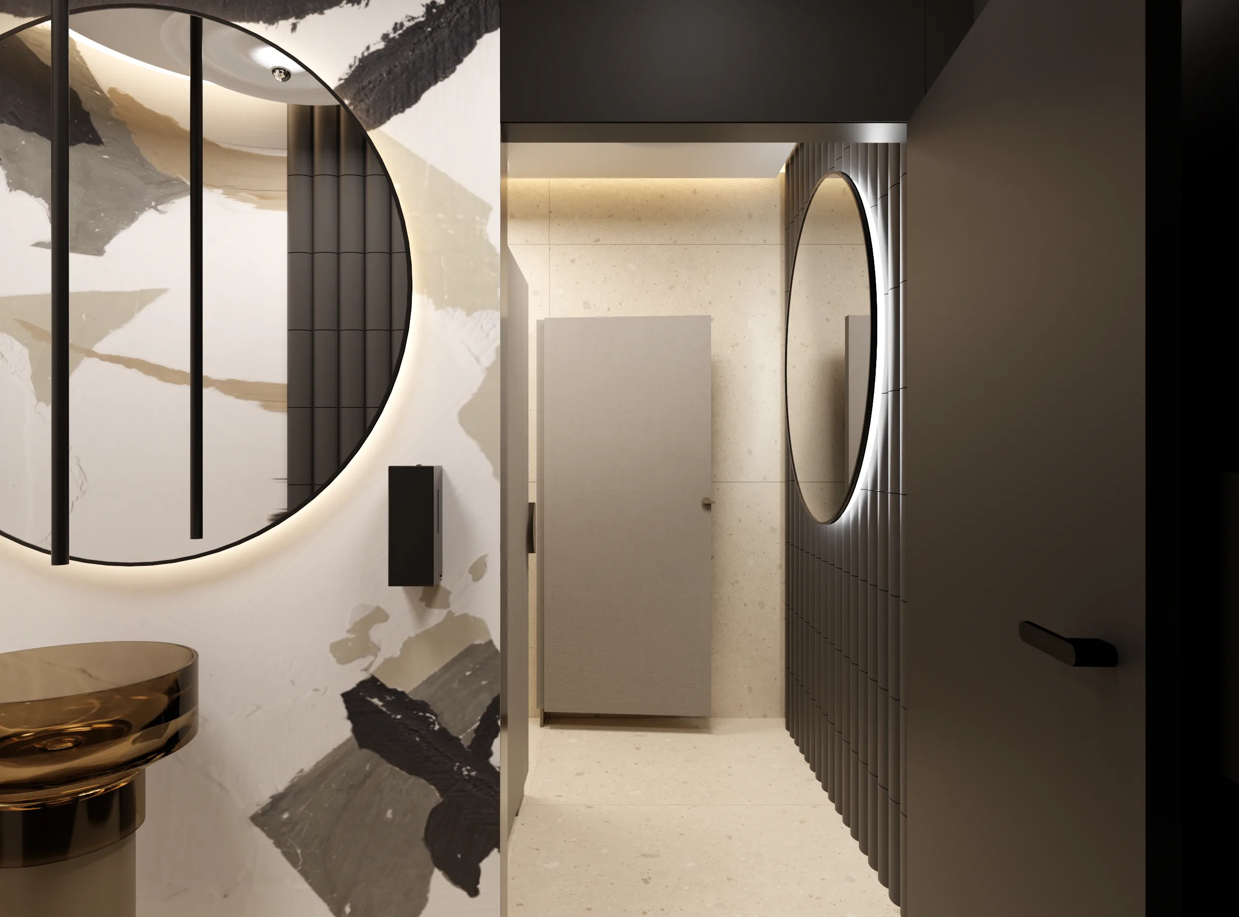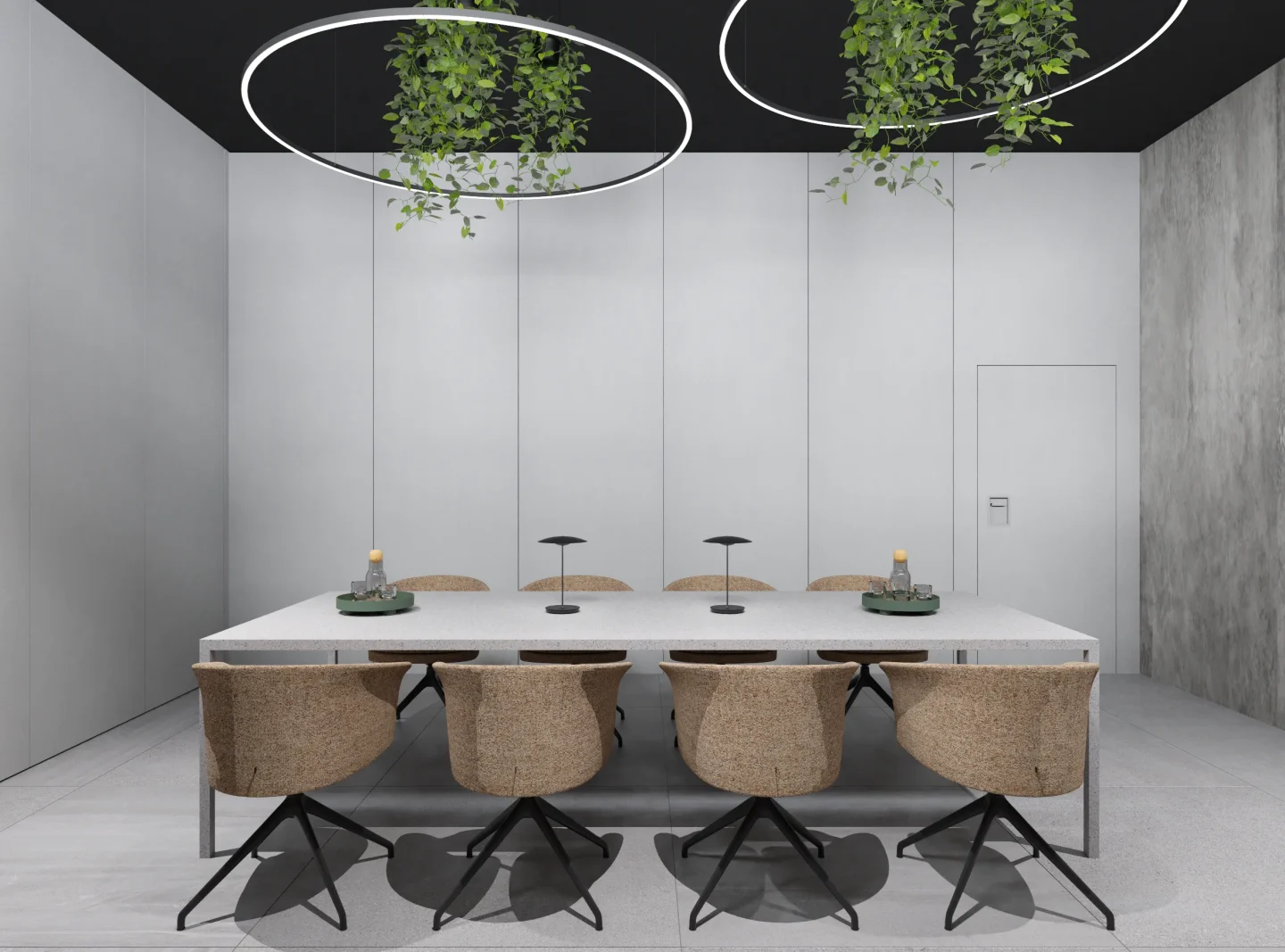 Tajemniczości i klimatu wnętrzom toalet nadają płytki wielkoformatowe w kolorze czerni. Sale konferencyjne podzielone są mobilnymi ścianami i w miarę możliwości można otwierać lub dzielić przestrzeń. W korytarzu do sali konferencyjnej ukryty został aneks kuchenny za wysokimi frontami, które licują się z płytami na ścianie i w razie potrzeby ukrywają całkowicie roboczą przestrzeń. Długą ścianę korytarza do toalet pokrywa wielkoformatowa grafika ścienna, drzwi do toalet ukryte są na ścianie wyłożonej płytkami wielkoformatowymi w kolorze czerni.