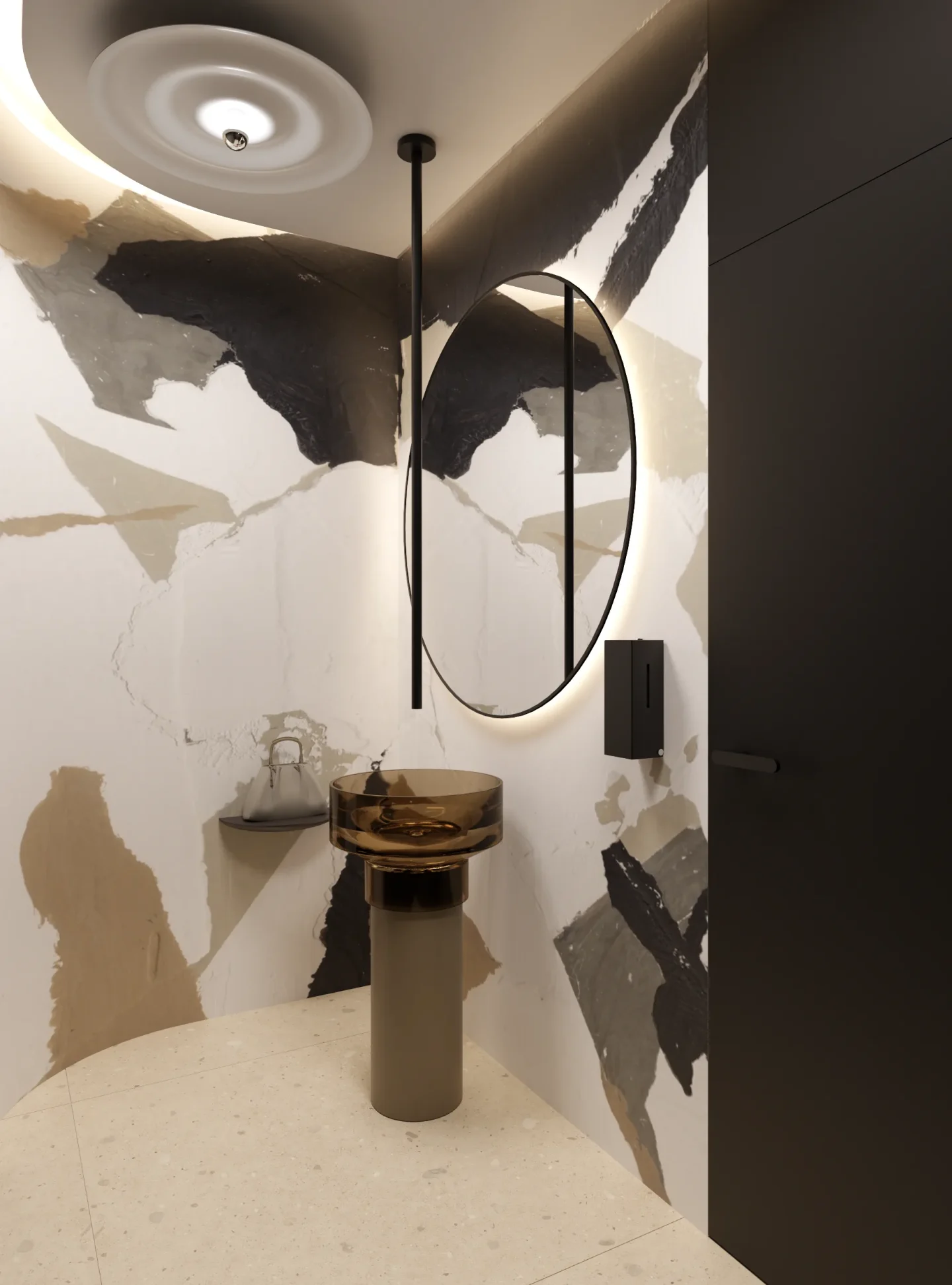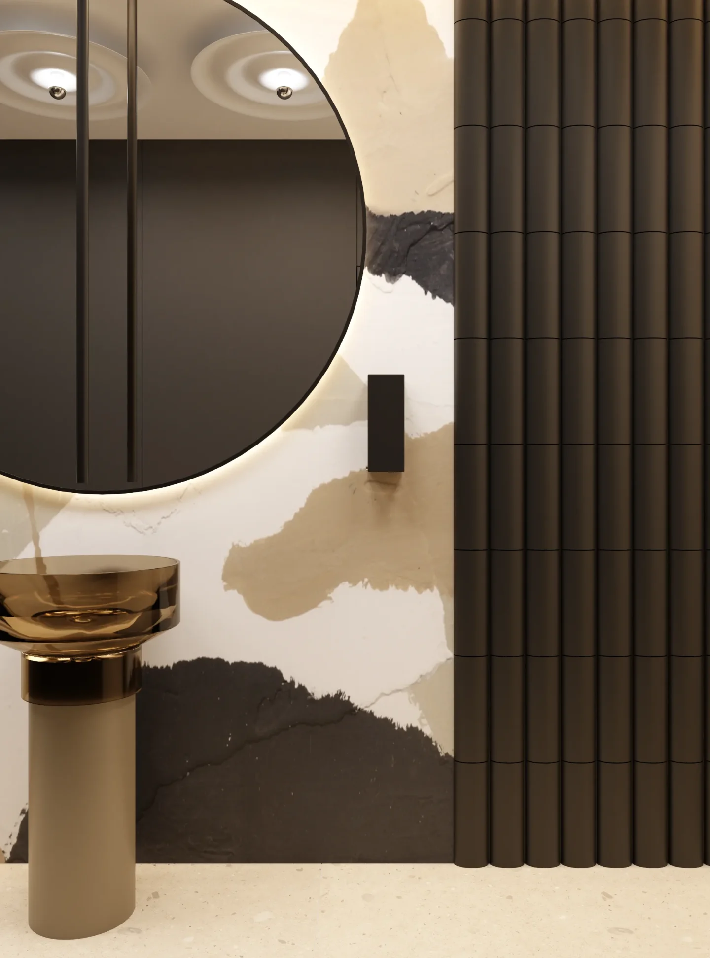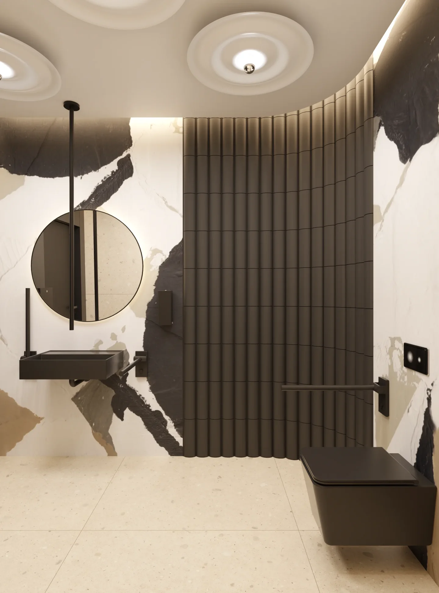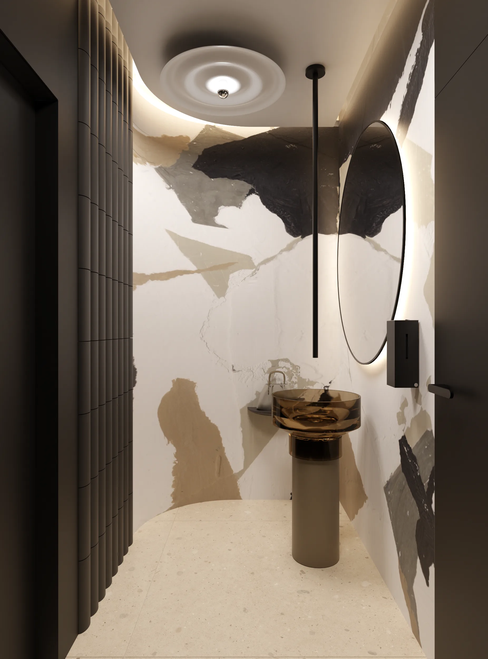 Tajemniczości i klimatu wnętrzom toalet nadają płytki wielkoformatowe w kolorze czerni. Sale konferencyjne podzielone są mobilnymi ścianami i w miarę możliwości można otwierać lub dzielić przestrzeń. W korytarzu do sali konferencyjnej ukryty został aneks kuchenny za wysokimi frontami, które licują się z płytami na ścianie i w razie potrzeby ukrywają całkowicie roboczą przestrzeń. Długą ścianę korytarza do toalet pokrywa wielkoformatowa grafika ścienna, drzwi do toalet ukryte są na ścianie wyłożonej płytkami wielkoformatowymi w kolorze czerni.