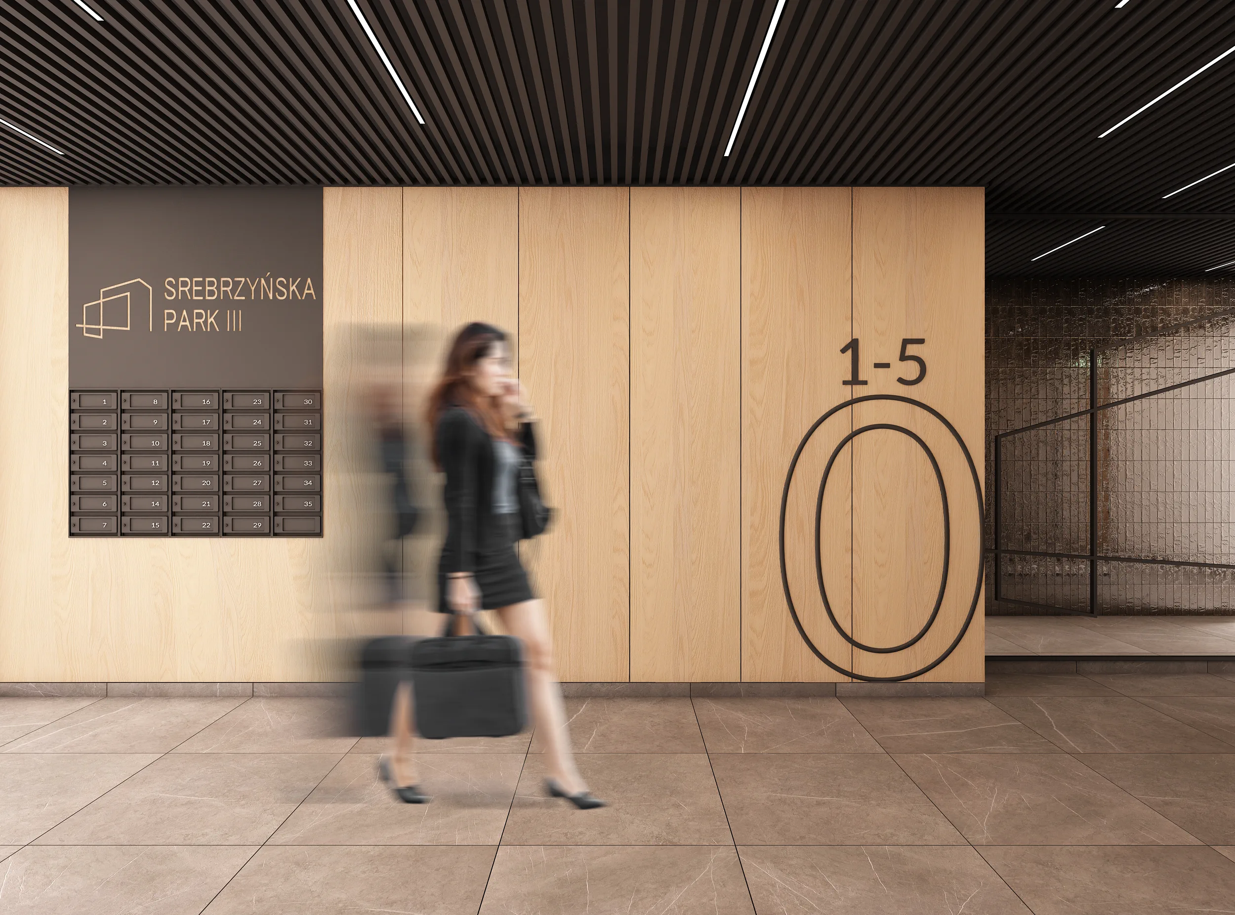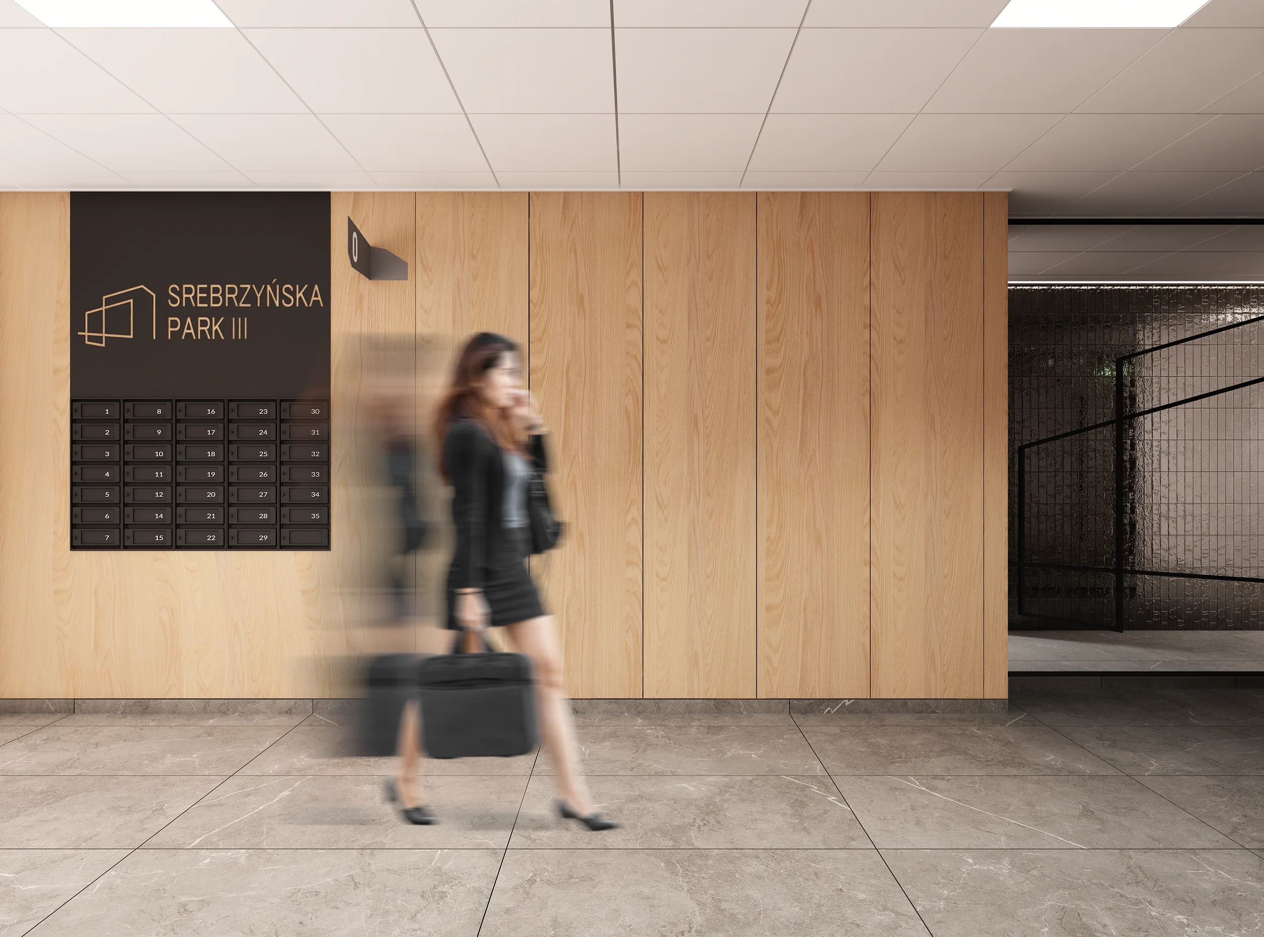 Połączenie szarych płytek imitujących kamień na podłogach z czarnymi błyszczącymi płytkami w formie małych cegiełek ułożonych na ścianach wind, dodaje wnętrzom elegancji. Całość ocieplają elementy wykonane z płyty o wzorze drewna. Skrzynki pocztowe z elementem z logo inwestycji zostały zaprojektowane na zamówienie.