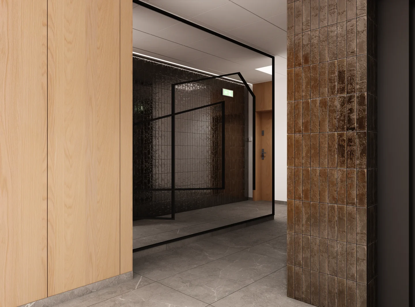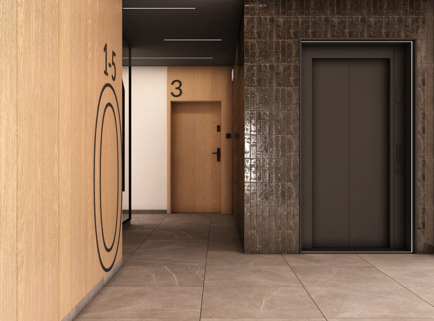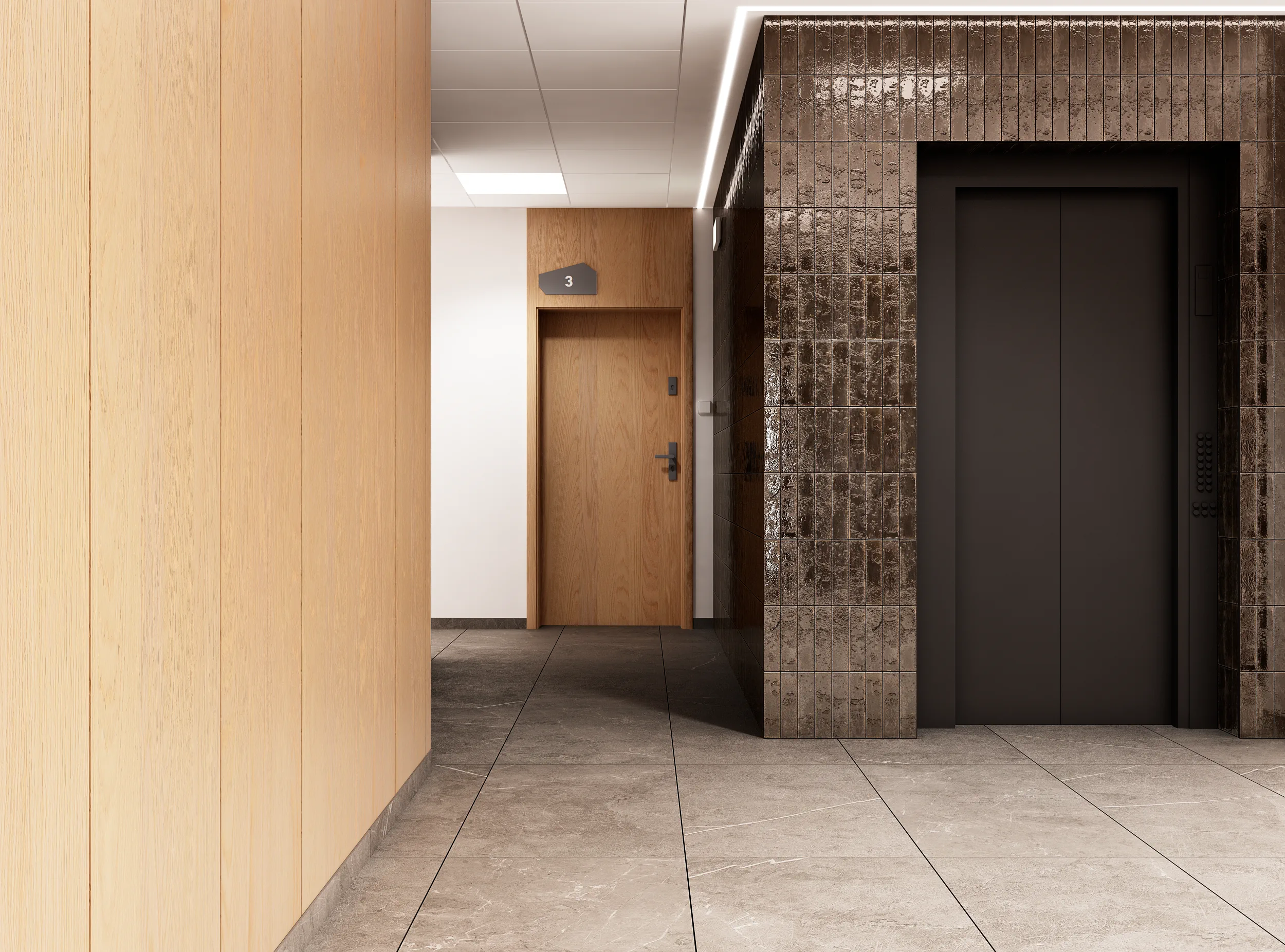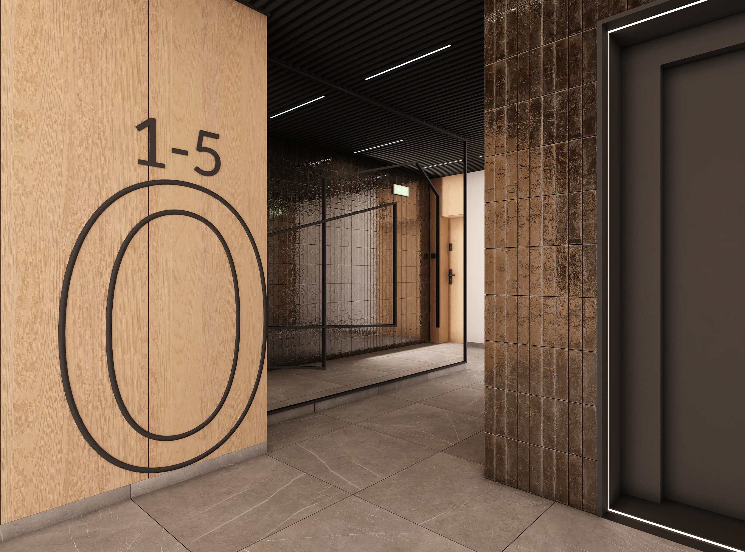 Połączenie szarych płytek imitujących kamień na podłogach z czarnymi błyszczącymi płytkami w formie małych cegiełek ułożonych na ścianach wind, dodaje wnętrzom elegancji. Całość ocieplają elementy wykonane z płyty o wzorze drewna. Skrzynki pocztowe z elementem z logo inwestycji zostały zaprojektowane na zamówienie. W korytarzach na parterze zaprojektowaliśmy duże lustra z logo inwestycji. Drzwi do mieszkań mają kolor ciepłego drewna, a ich opaski przedłużone są do sufitu tworząc świetne tło dla numeracji mieszkań.