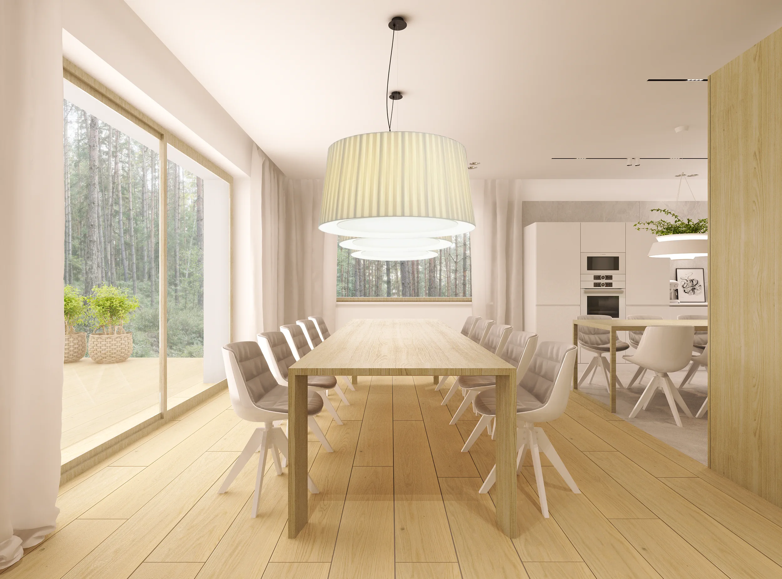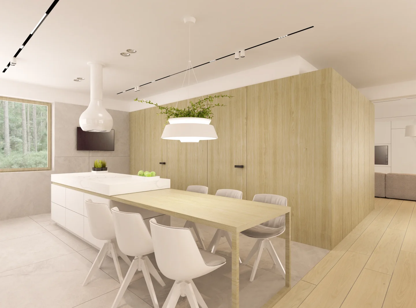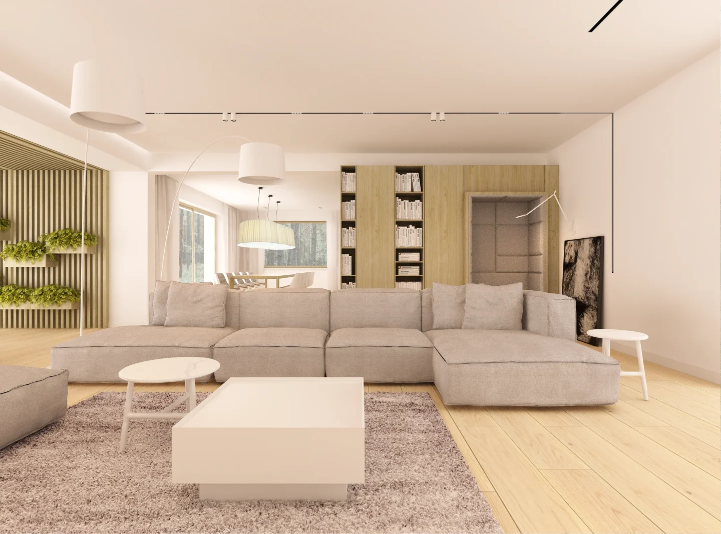 Przytulności dodają również zastosowane tkaniny na meblach tapicerowanych oraz zasłony. Wybór mebli też ma ogromne znaczenie przy projektowaniu ponadczasowych wnętrz. Właściciele postanowili zaufać nam w pełni i wyposażyć dom w proponowane przez nas elementy aranżacji. We wnętrzu pojawiło się dużo pięknych, dobrze zaprojektowanych mebli. A takie meble posłużą na pewno na długi czas i nie staną się niemodne za kilka lat. Ważna rolę we wnętrzach pełni oświetlenie. Na sufitach pojawia się oświetlenie techniczne, które pełni podstawową rolę w doświetleniu wnętrz.