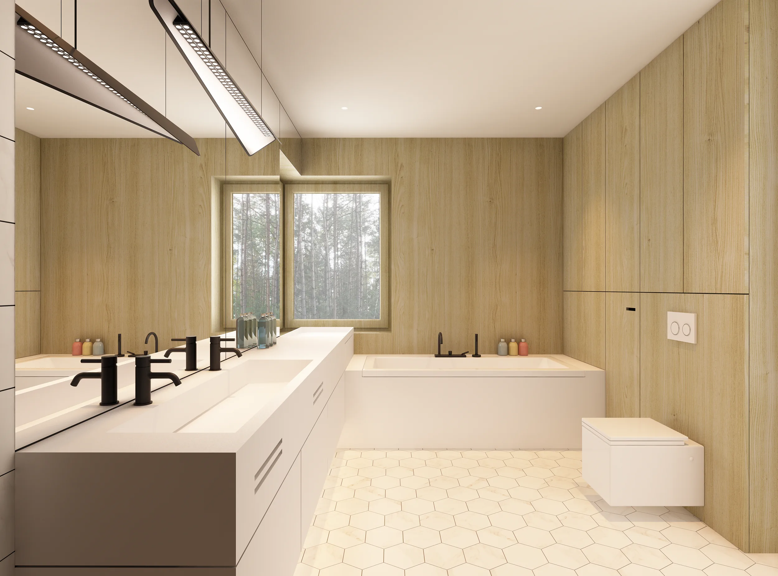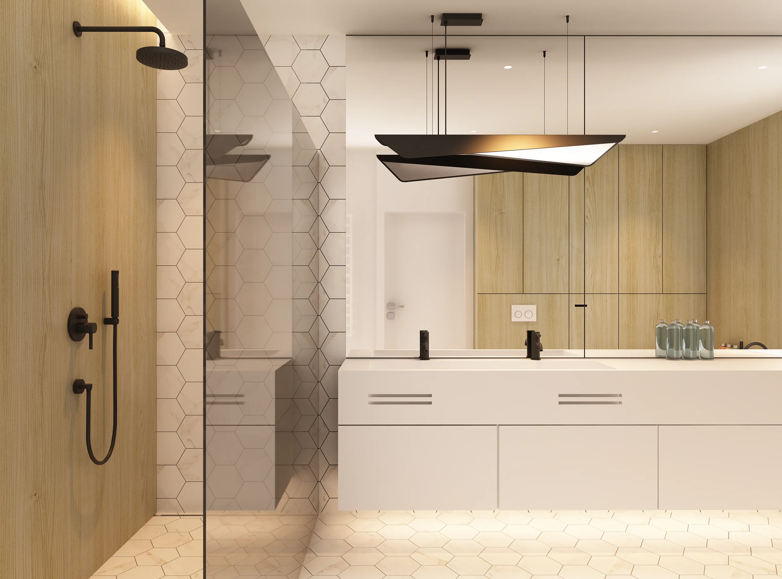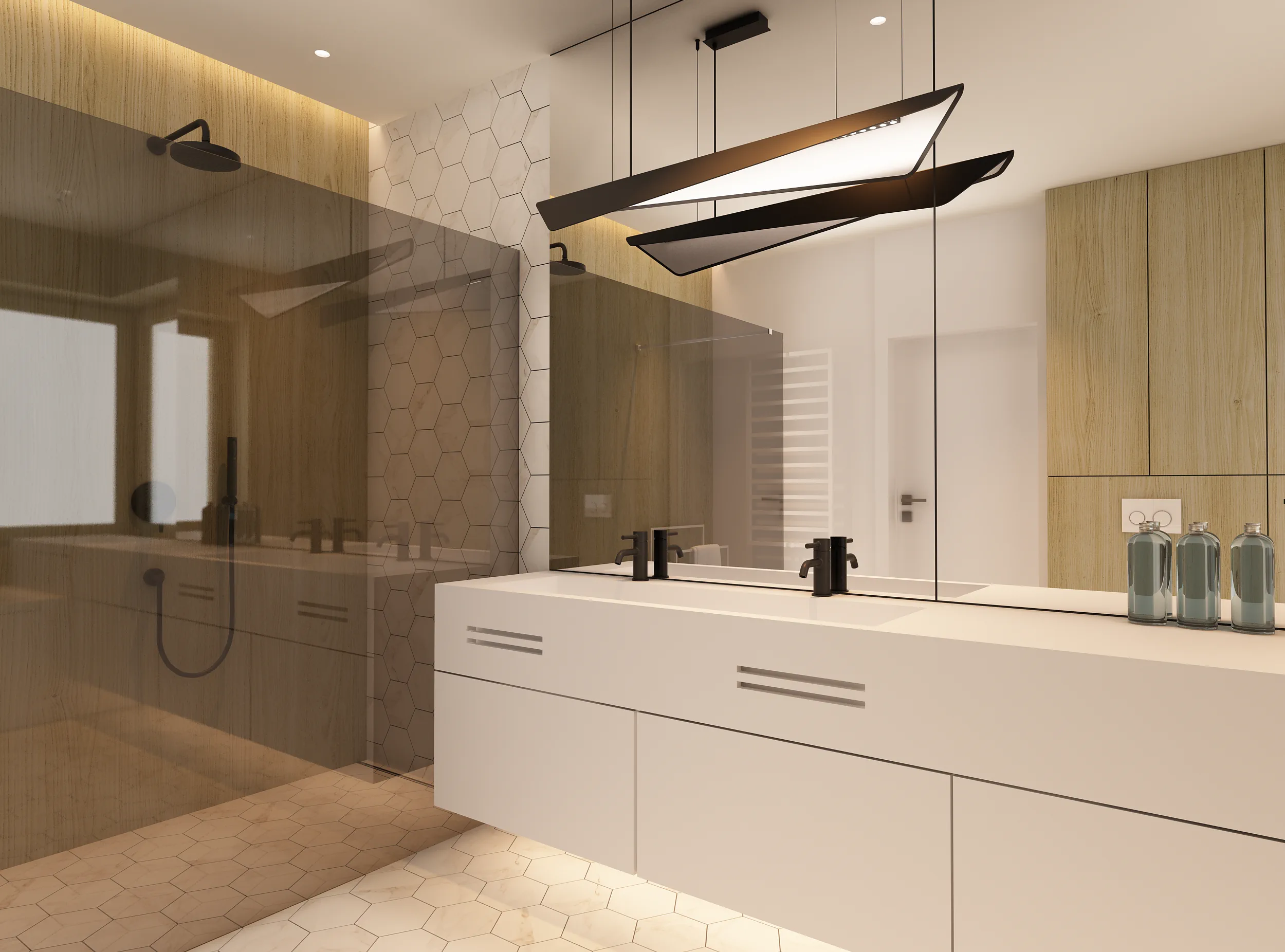 Za pomocą systemu wbudowanych szyn oraz wypinanych lamp liniowych i reflektorów mamy możliwość dostosować charakter oraz ilość natężenia oświetlenia w zależności od naszych potrzeb. Dodatkowo pojawiają się lampy dekoracyjne, które nadają klimatu i charakteru w poszczególnych strefach domu. W łazienkach pojawią się te same materiały które zastosowane są w całym domu: biało szary marmur, również w postaci płytek o kształcie heksagonów, ciepłe drewno, jako uzupełnienie czarna armatura oraz dodatki.