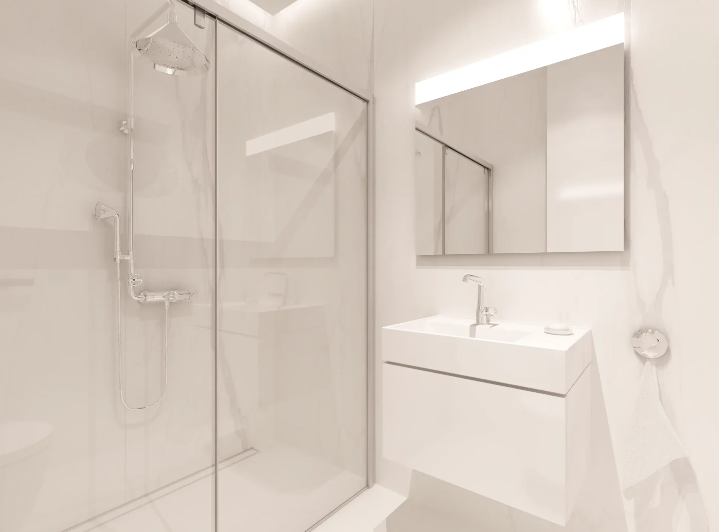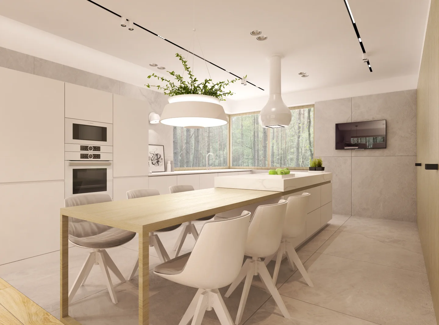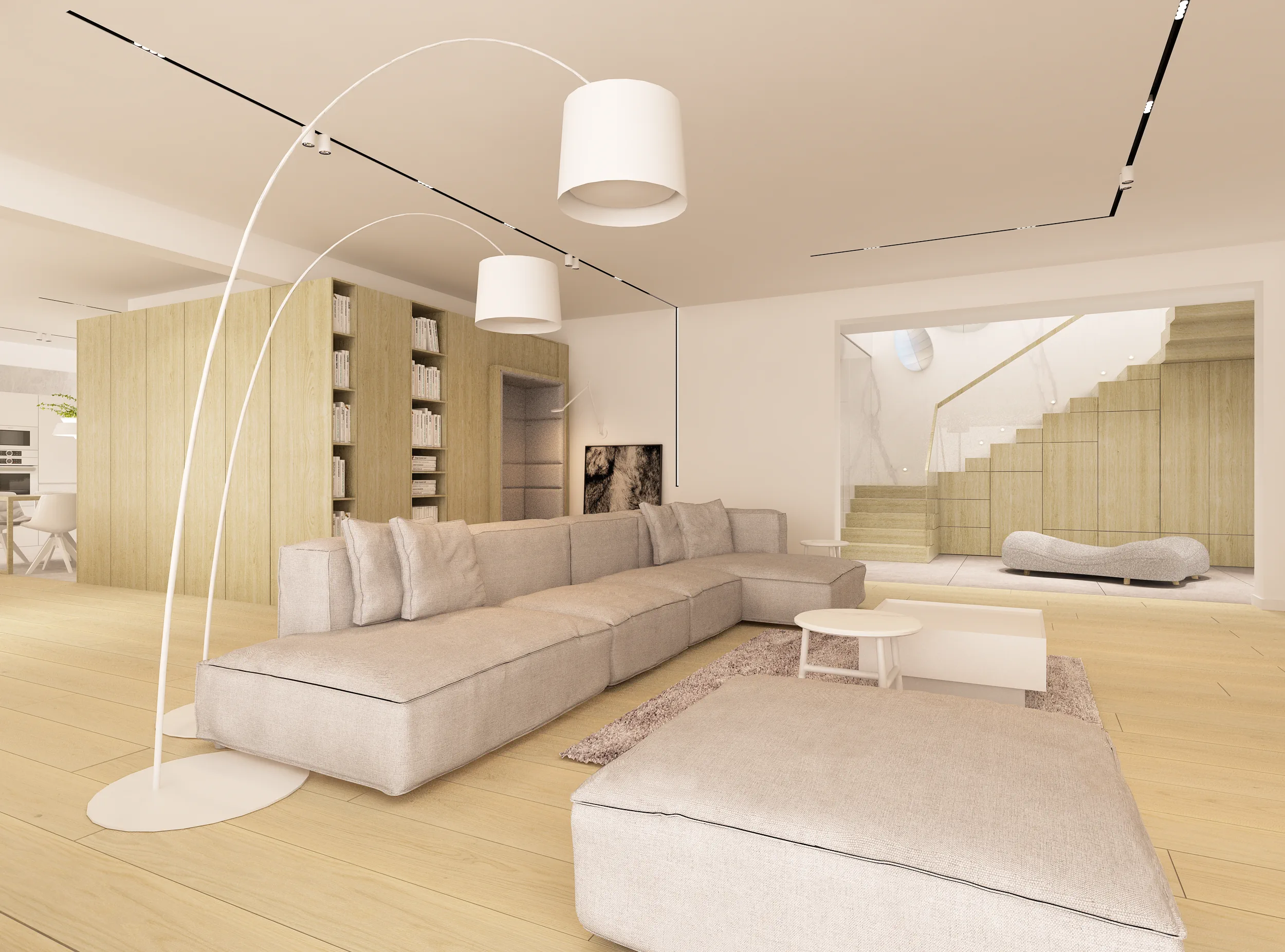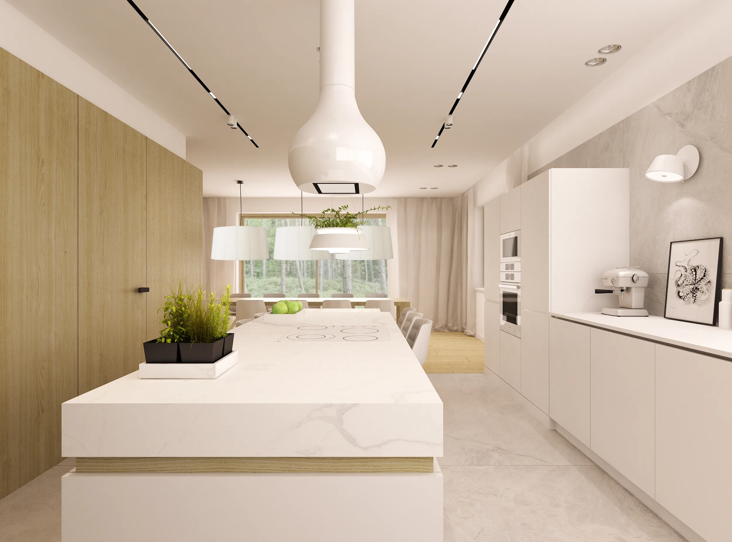 Za pomocą systemu wbudowanych szyn oraz wypinanych lamp liniowych i reflektorów mamy możliwość dostosować charakter oraz ilość natężenia oświetlenia w zależności od naszych potrzeb. Dodatkowo pojawiają się lampy dekoracyjne, które nadają klimatu i charakteru w poszczególnych strefach domu. W łazienkach pojawią się te same materiały które zastosowane są w całym domu: biało szary marmur, również w postaci płytek o kształcie heksagonów, ciepłe drewno, jako uzupełnienie czarna armatura oraz dodatki.