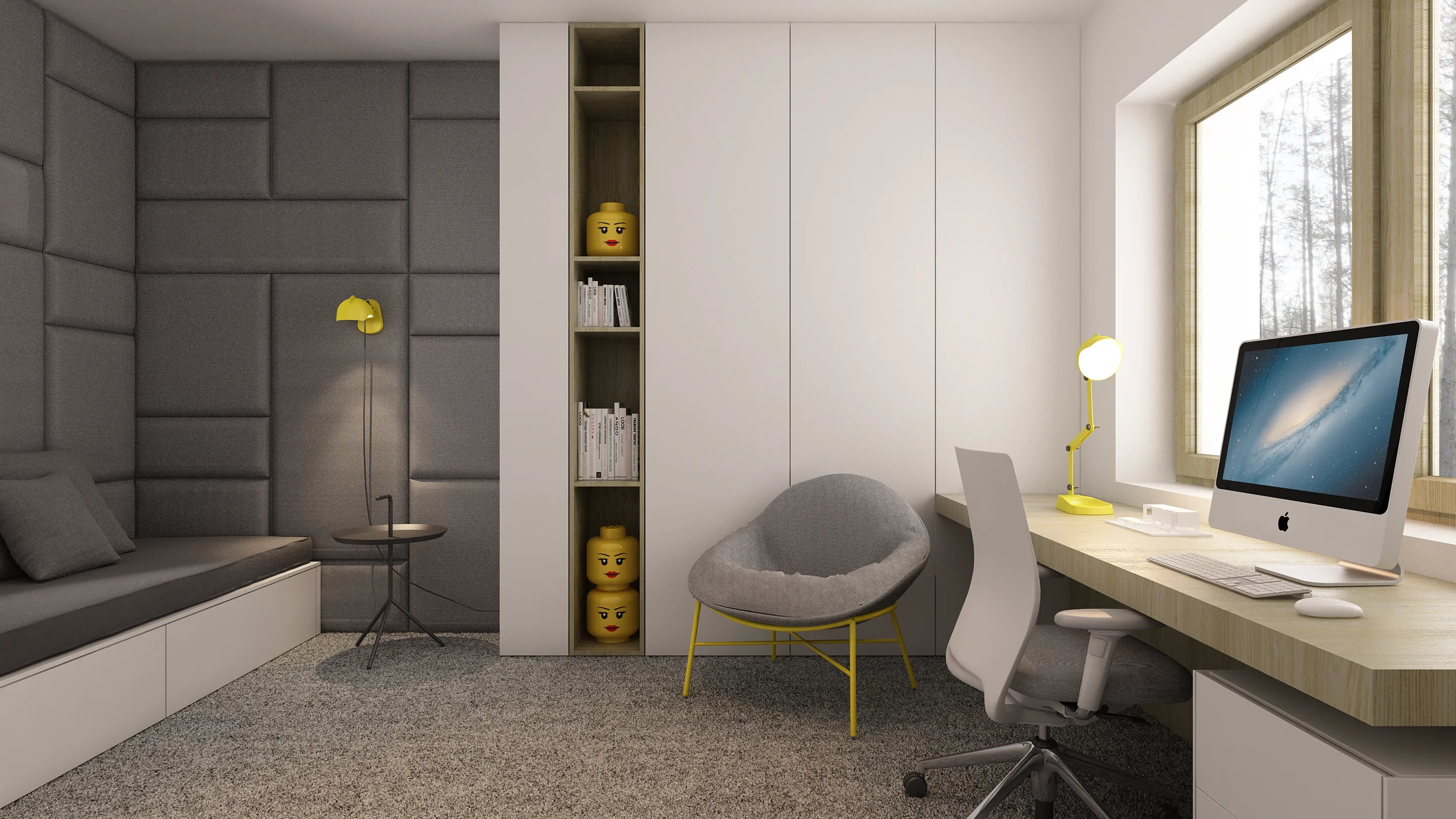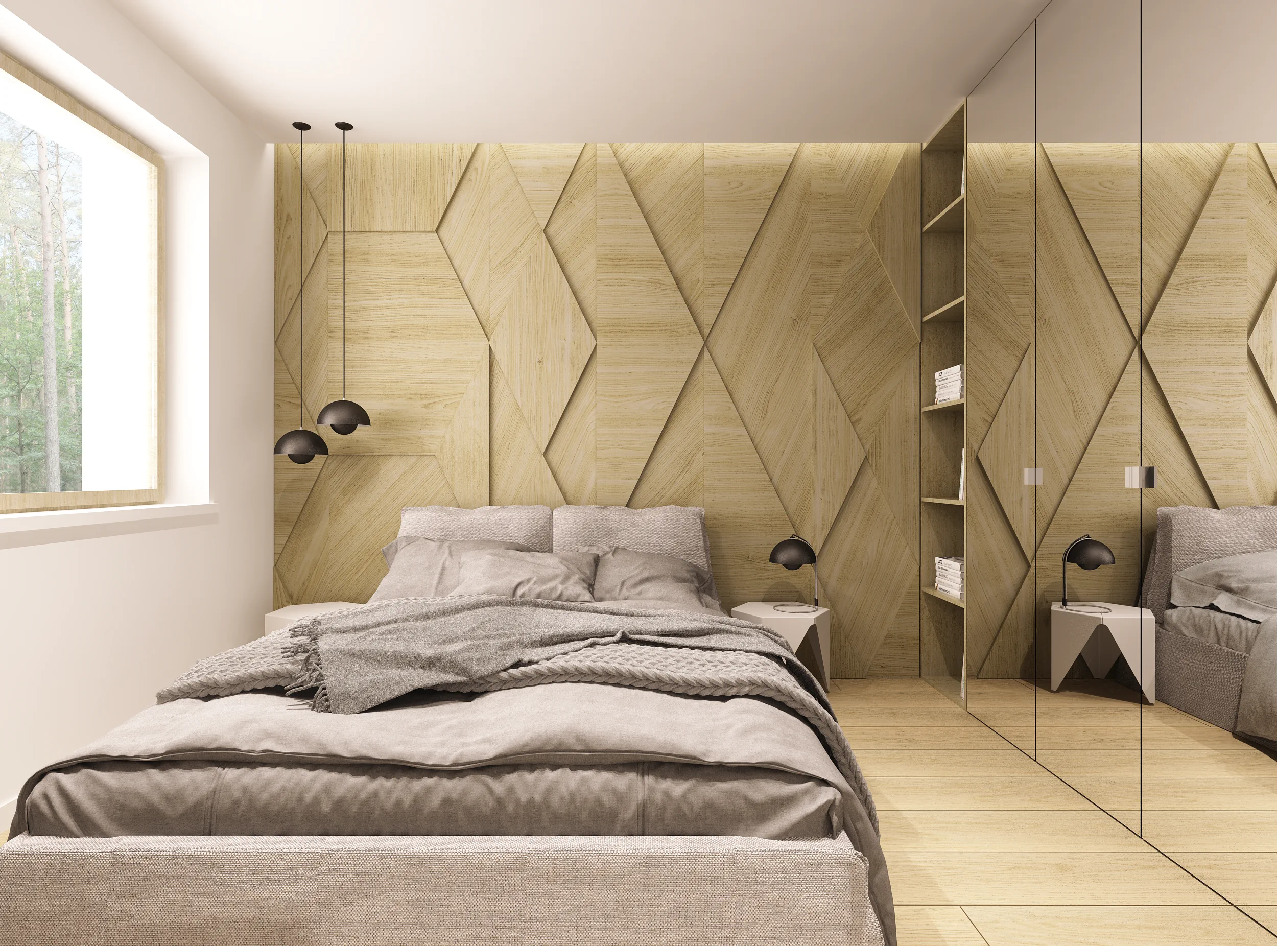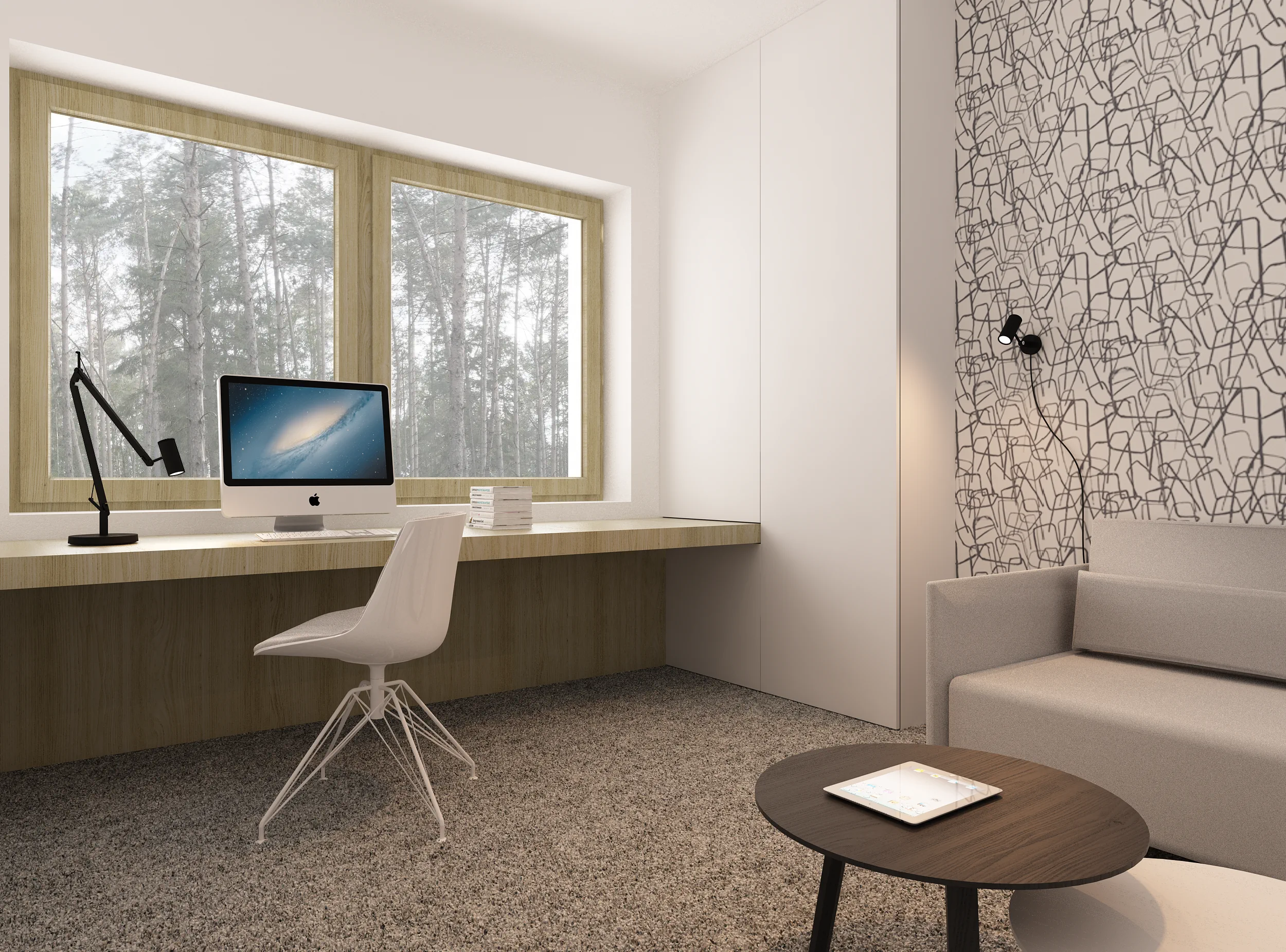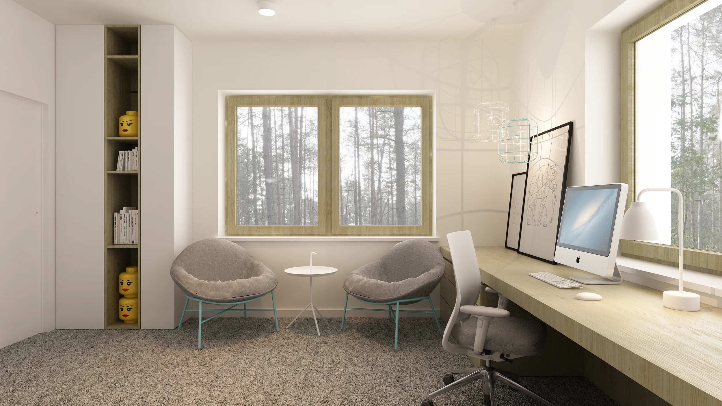 Pokoje dzieci udało się urządzić zachowując charakter wnętrz domu. Dodaliśmy jedynie niewielkie akcenty kolorystyczne, które dobrze sprawdzają się na tle zastosowanych materiałów. Ciekawym elementem domu jest strefa wypoczynkowa, w której zaprojektowaliśmy lamele drewniane na ścianie oraz suficie z ukrytym oświetleniem, oraz wiszące donice w których pojawiła się kojąca zmysły zieleń.