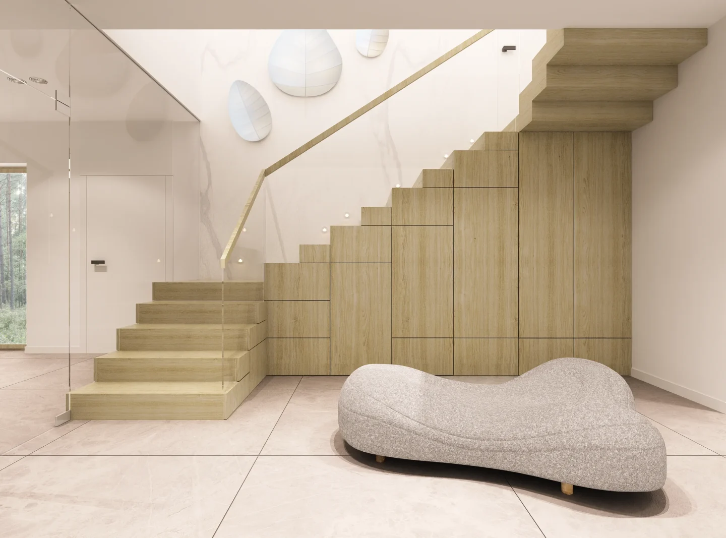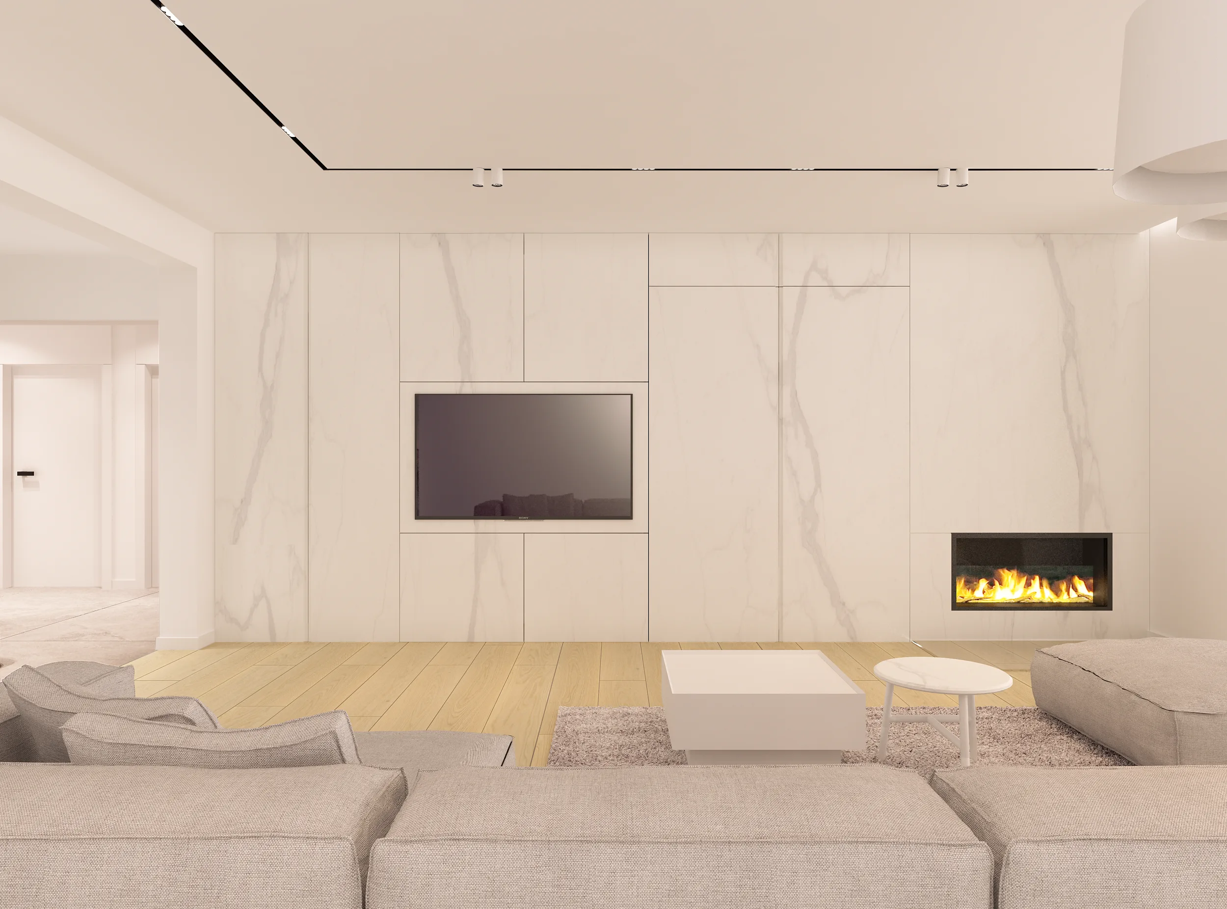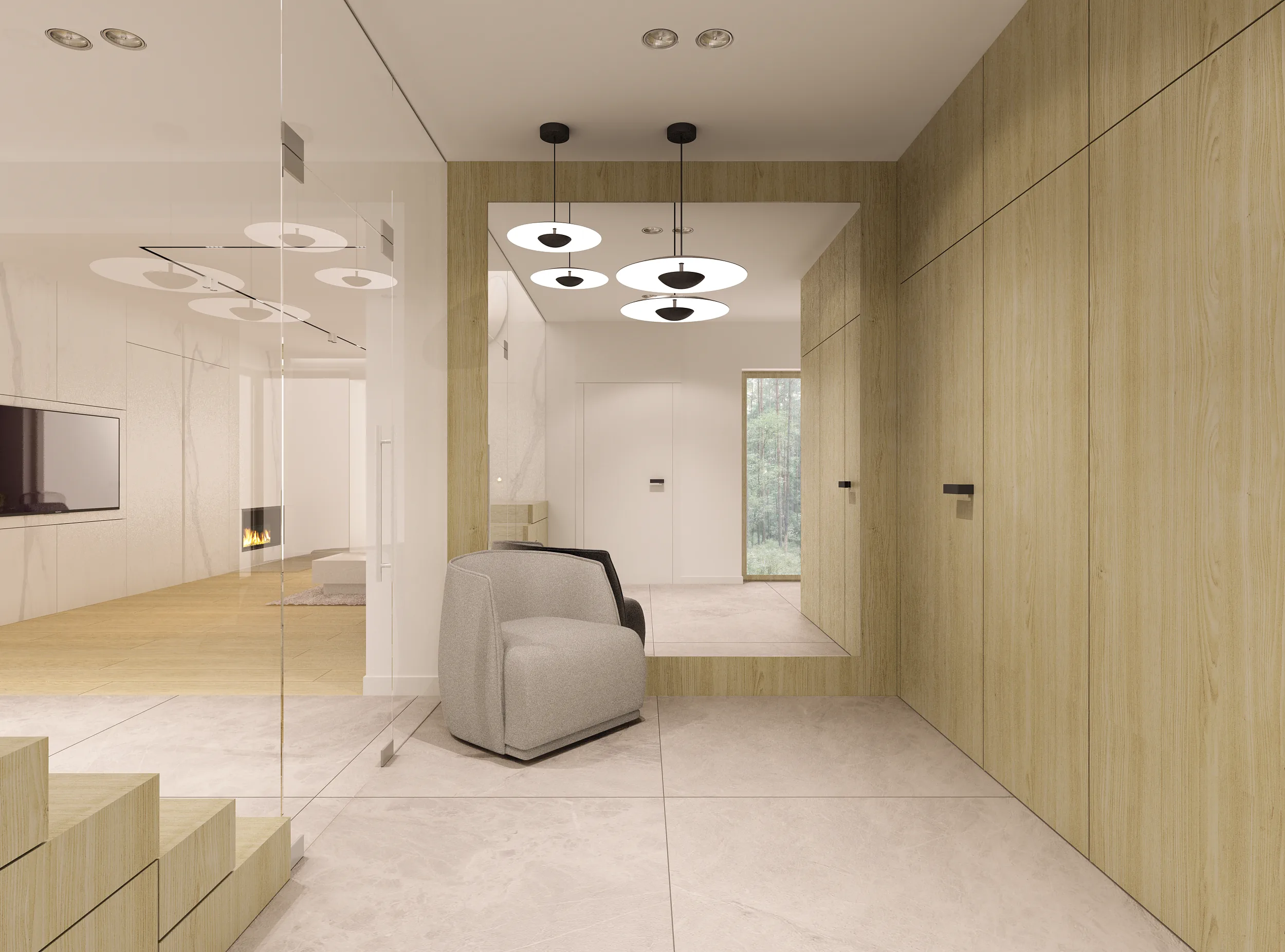 Ponadczasowy design gwarantują też naturalne materiały i powierzchnie takie jak biały matowy marmur z szarymi żyłami, podłogi w odcieniu jasnego szarego kamienia, naturalne deski podłogowe oraz fornirowane elementy na ścianach w kolorze ciepłego drewna. Nowoczesny charakter wnętrz widoczny jest w zaprojektowanych pod wymiar zabudowach które kryją szafki, schowki, przejścia do następnych pomieszczeń. Do wykonania elementów stolarskich wykorzystano spieki wielkoformatowe oraz naturalne okleiny drewniane.