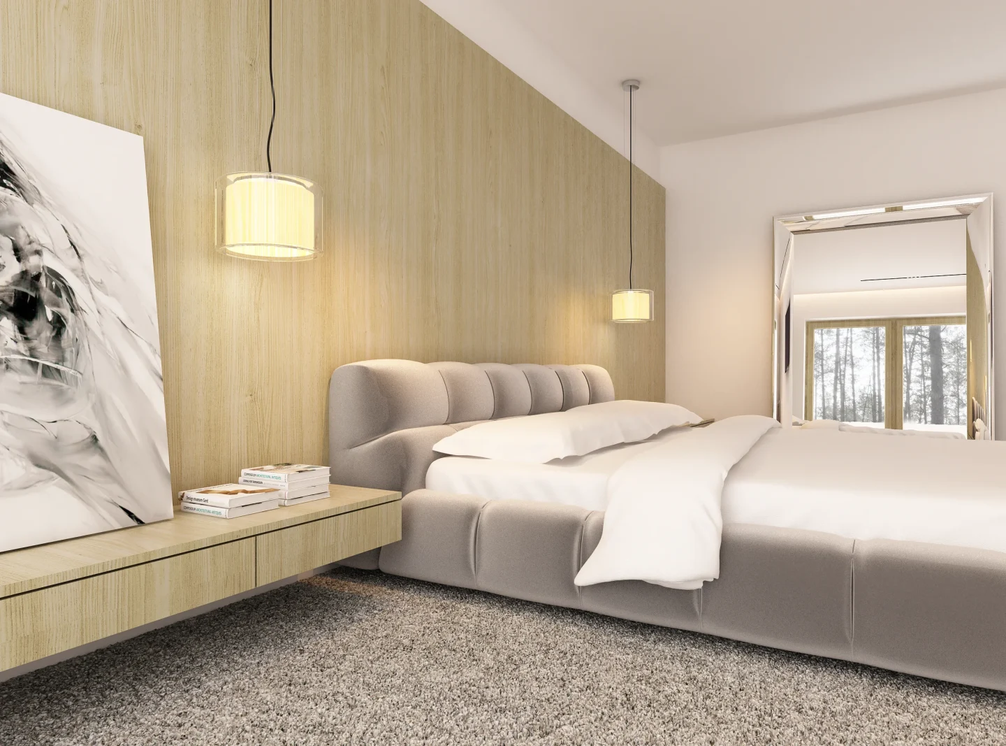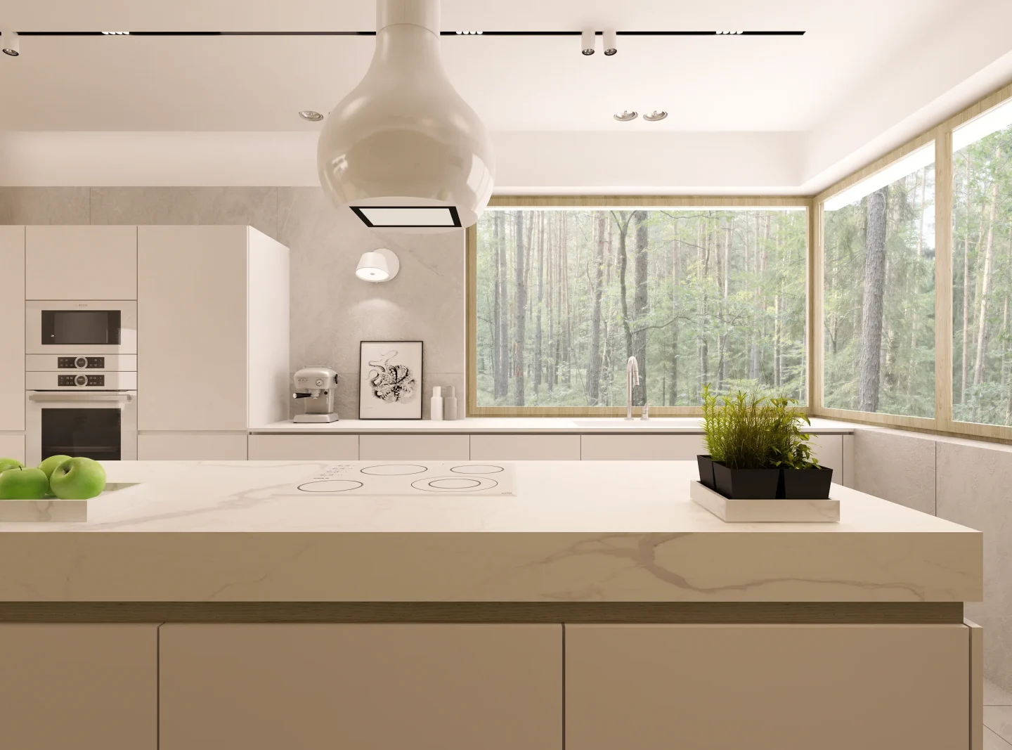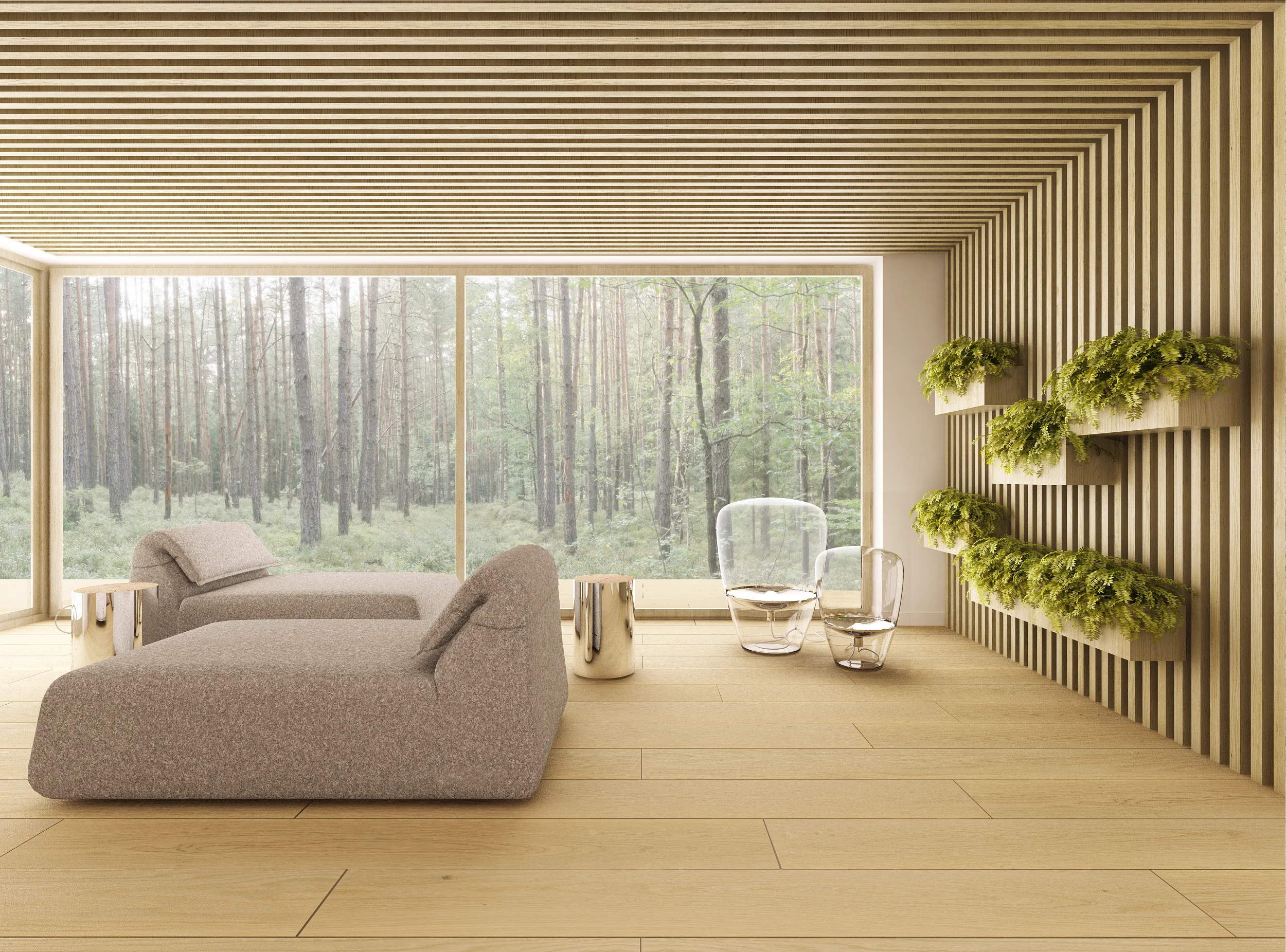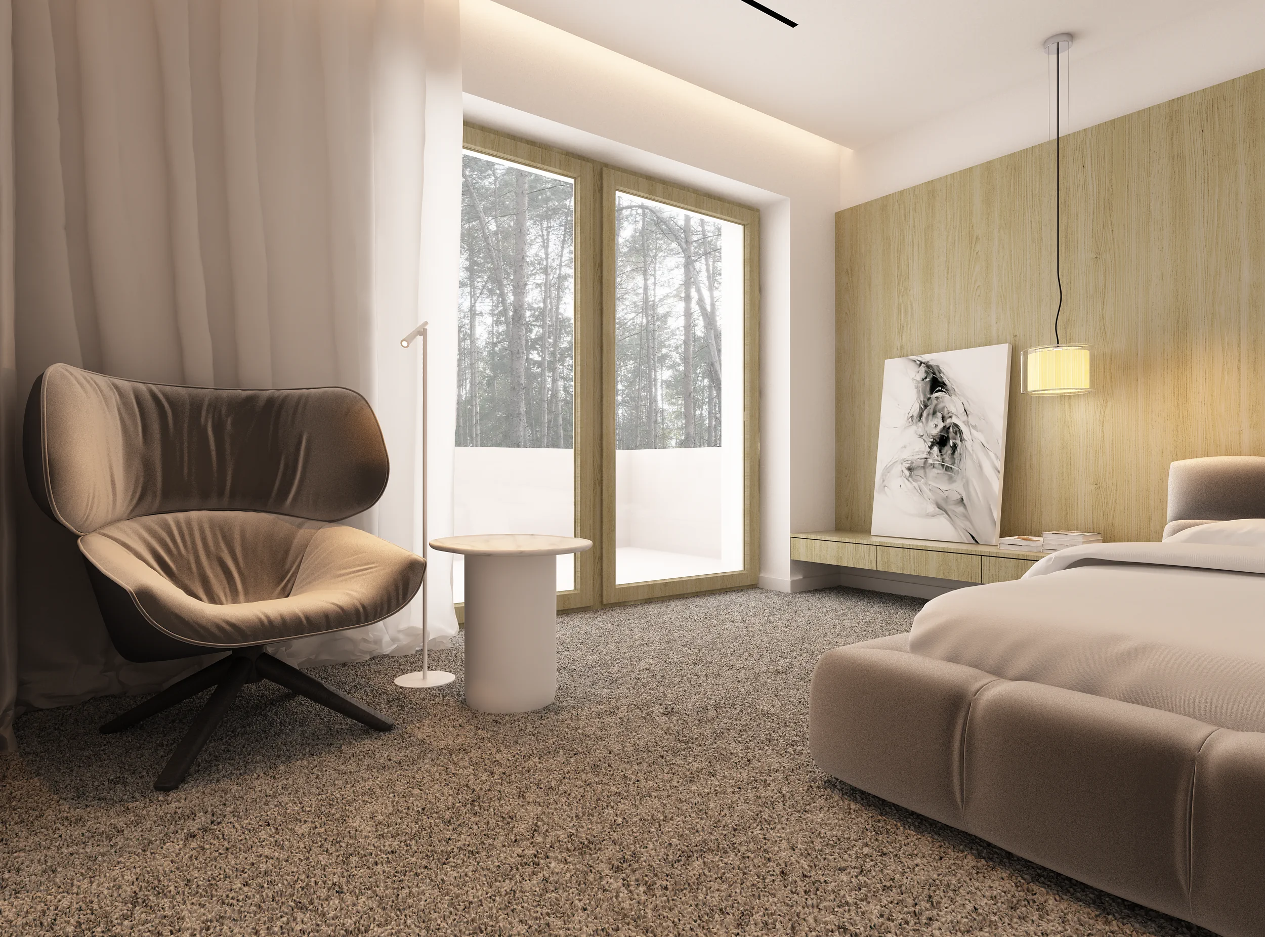 Ponadczasowy design gwarantują też naturalne materiały i powierzchnie takie jak biały matowy marmur z szarymi żyłami, podłogi w odcieniu jasnego szarego kamienia, naturalne deski podłogowe oraz fornirowane elementy na ścianach w kolorze ciepłego drewna. Nowoczesny charakter wnętrz widoczny jest w zaprojektowanych pod wymiar zabudowach które kryją szafki, schowki, przejścia do następnych pomieszczeń. Do wykonania elementów stolarskich wykorzystano spieki wielkoformatowe oraz naturalne okleiny drewniane.