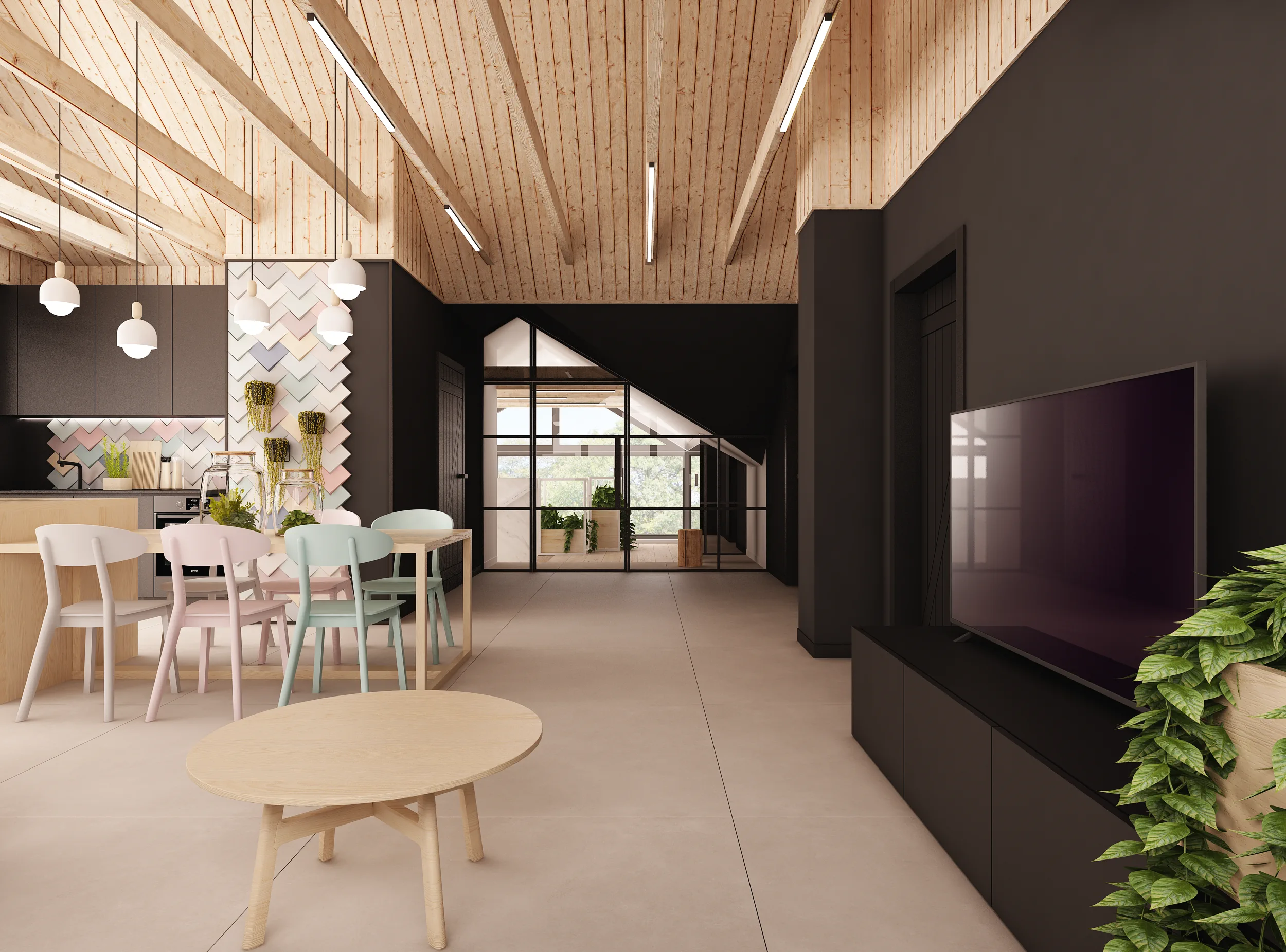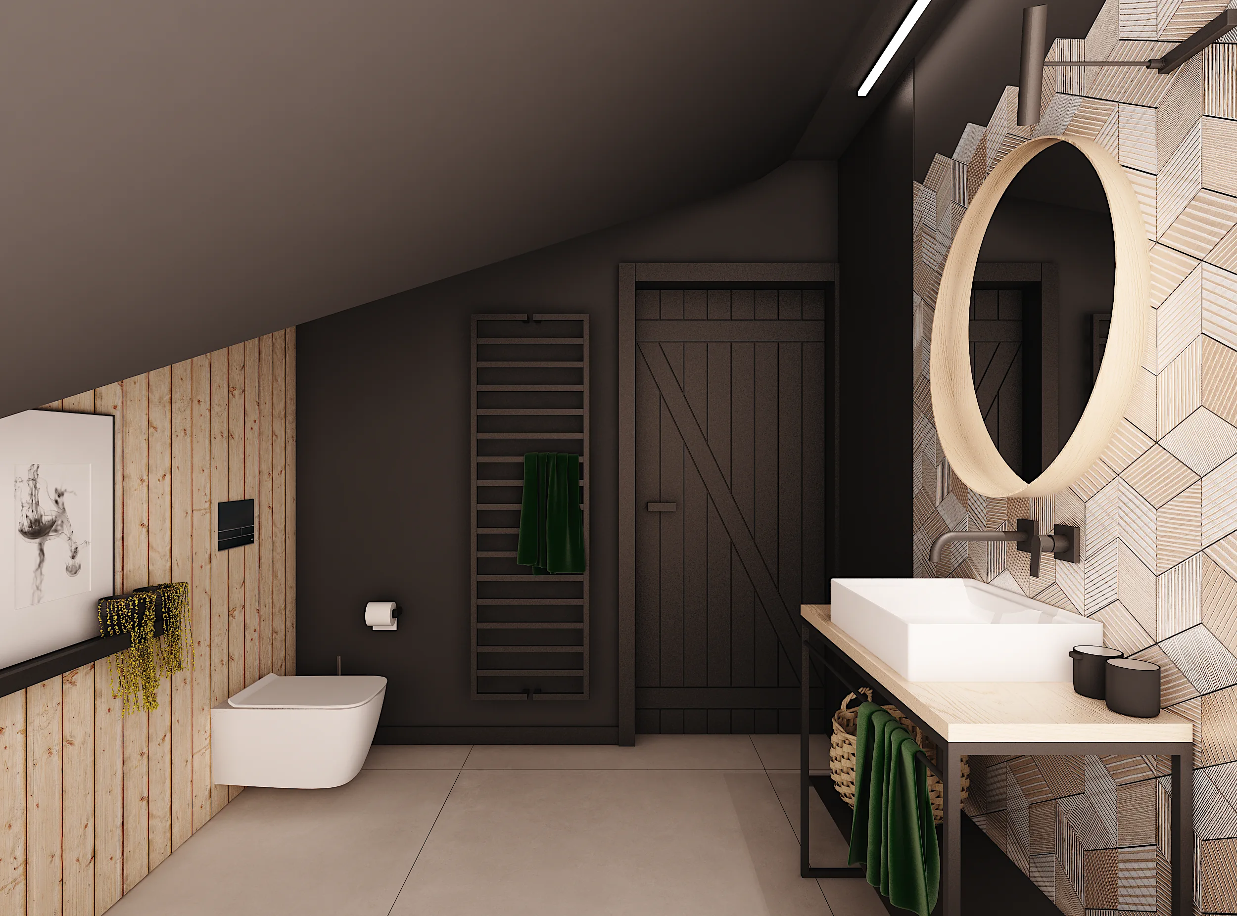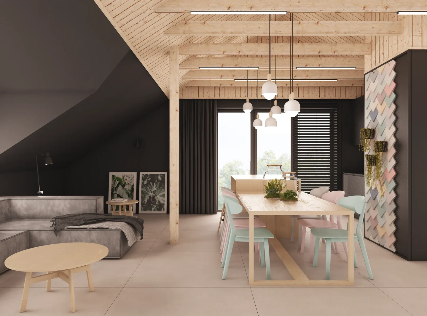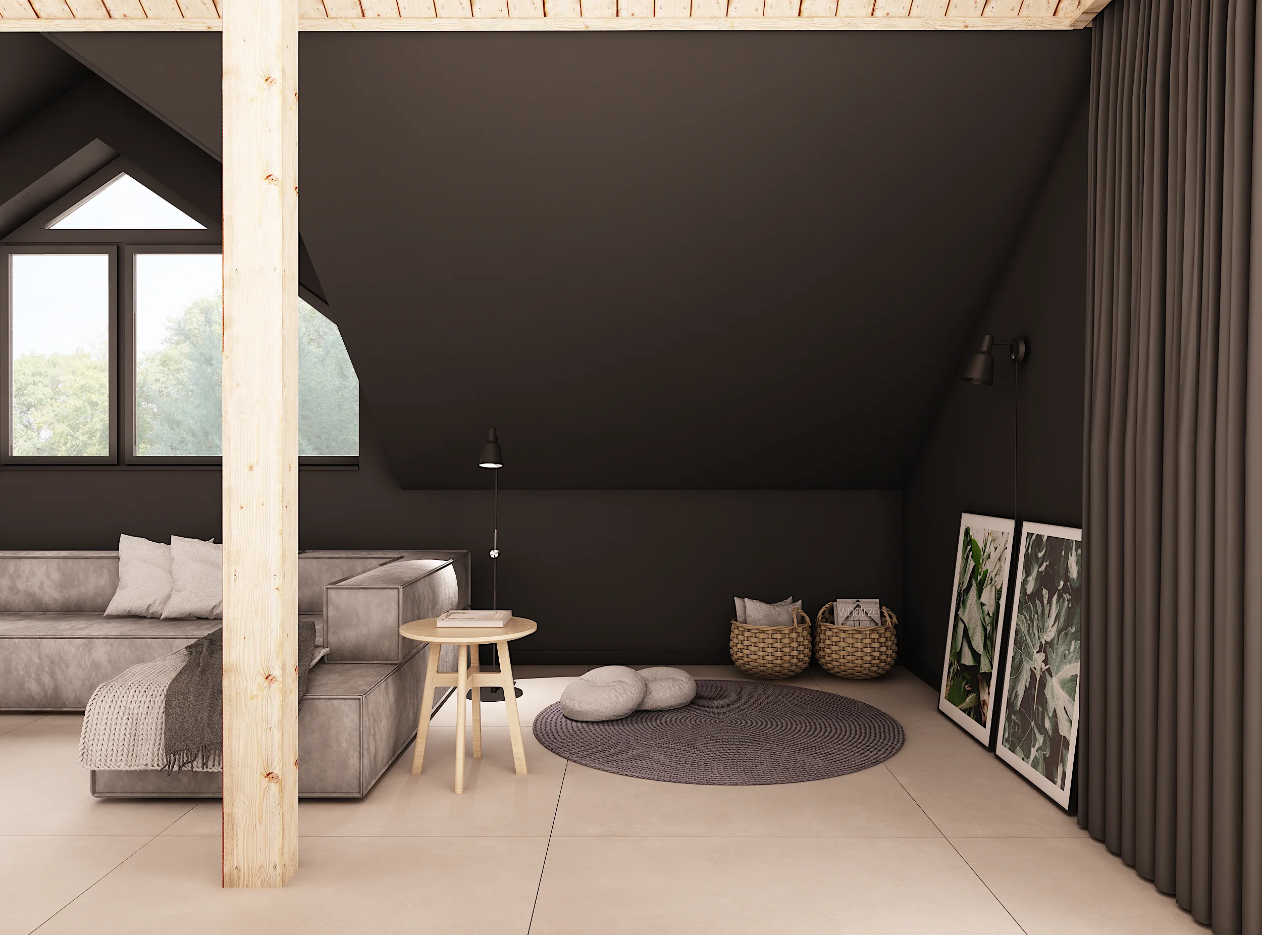 Część otwarta poddasza wydawała nam się dość zagmatwana i wysoka, dlatego pojawił się pomysł z odcięciem części dachu i wyłożeniem jej deskami żeby ocieplić charakter pozostałej części pomalowanej na kolor czarny, który jest świetnym tłem dla drewna, jednocześnie uspokaja bryłę, pozwala ukryć w mroku wszystkie załamania ścian i sufitów. W takim wnętrzu gdzie sufit gra główną rolę, świetnie sprawdzi się neutralna podłoga, my zaproponowaliśmy płytki które imitują spokojny jasny szary beton.