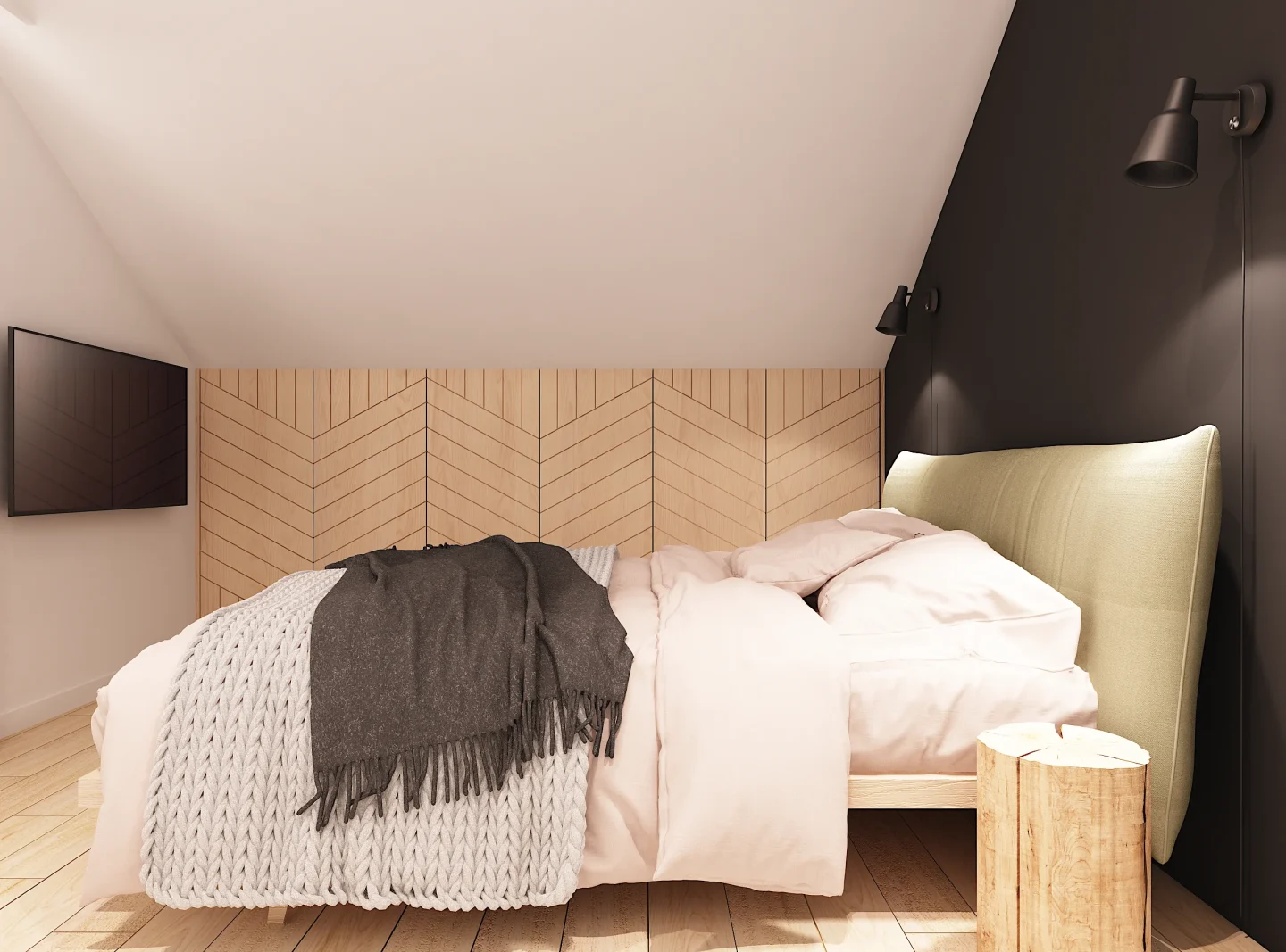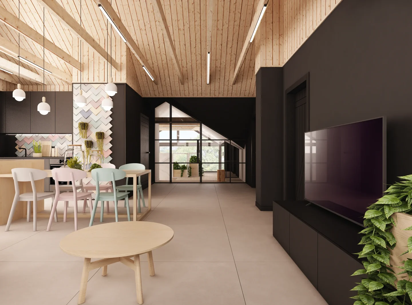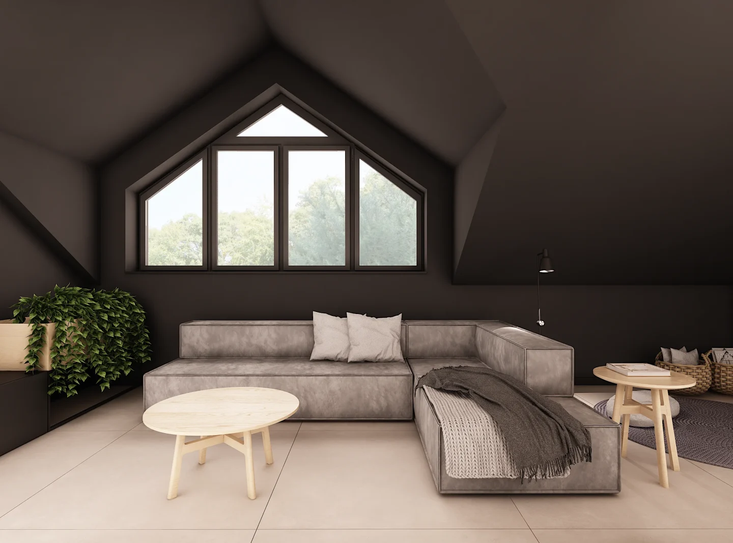 Część otwarta poddasza wydawała nam się dość zagmatwana i wysoka, dlatego pojawił się pomysł z odcięciem części dachu i wyłożeniem jej deskami żeby ocieplić charakter pozostałej części pomalowanej na kolor czarny, który jest świetnym tłem dla drewna, jednocześnie uspokaja bryłę, pozwala ukryć w mroku wszystkie załamania ścian i sufitów. W takim wnętrzu gdzie sufit gra główną rolę, świetnie sprawdzi się neutralna podłoga, my zaproponowaliśmy płytki które imitują spokojny jasny szary beton.