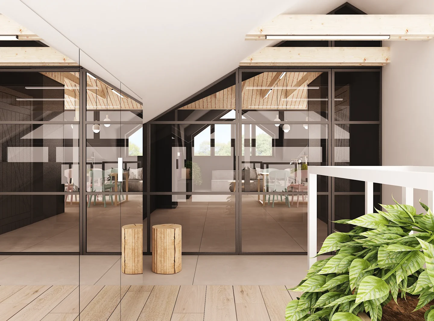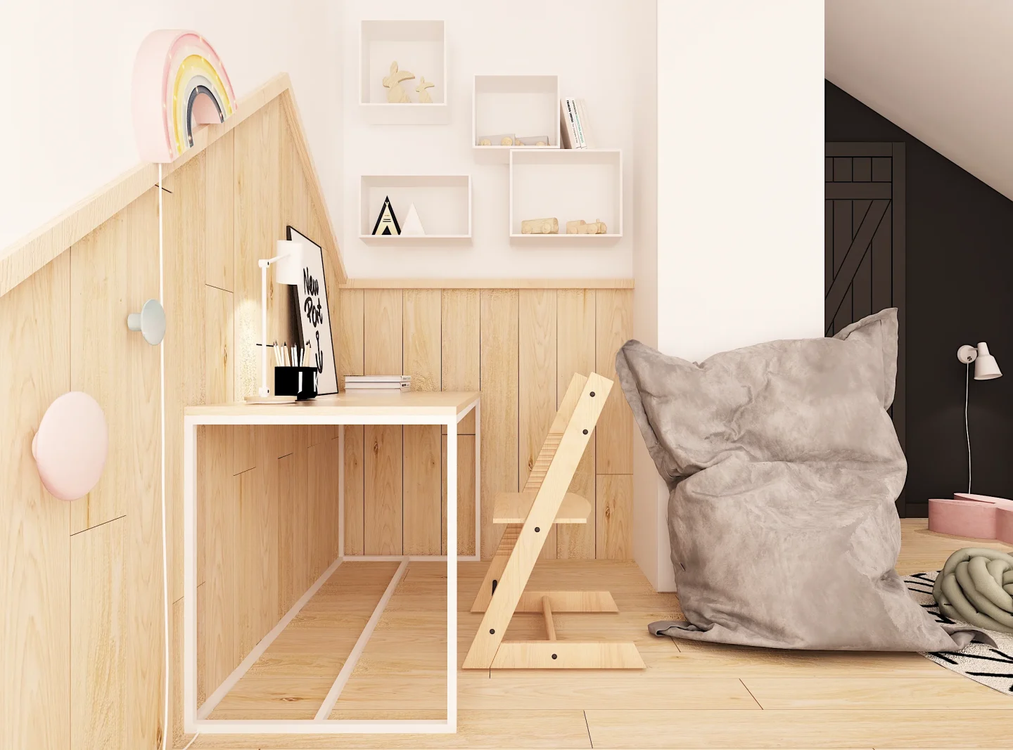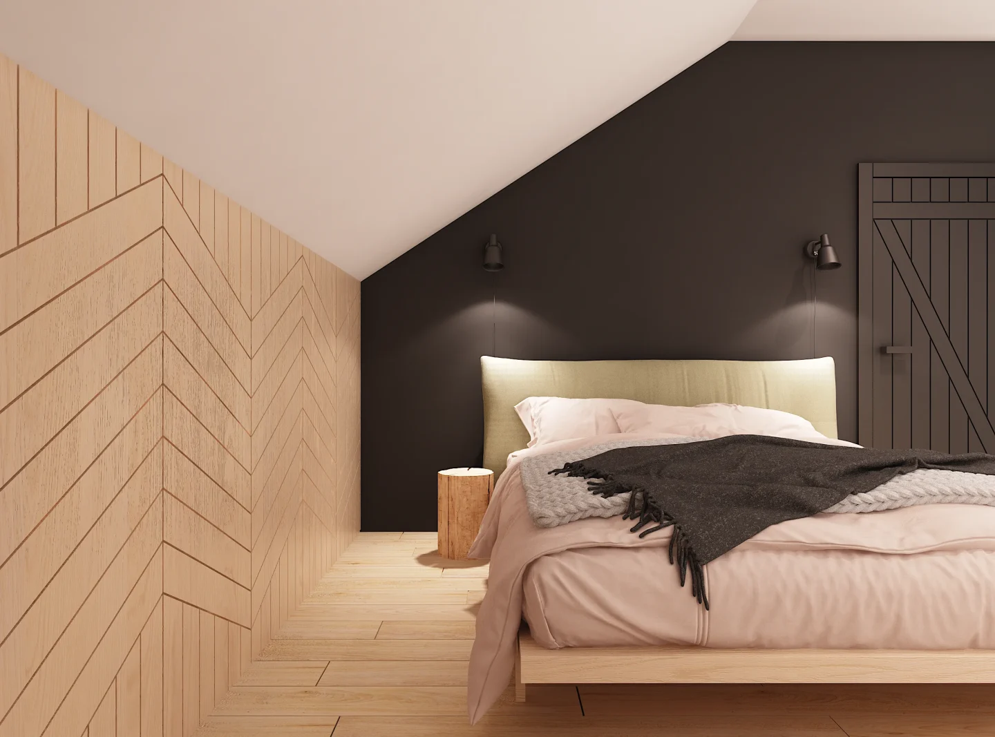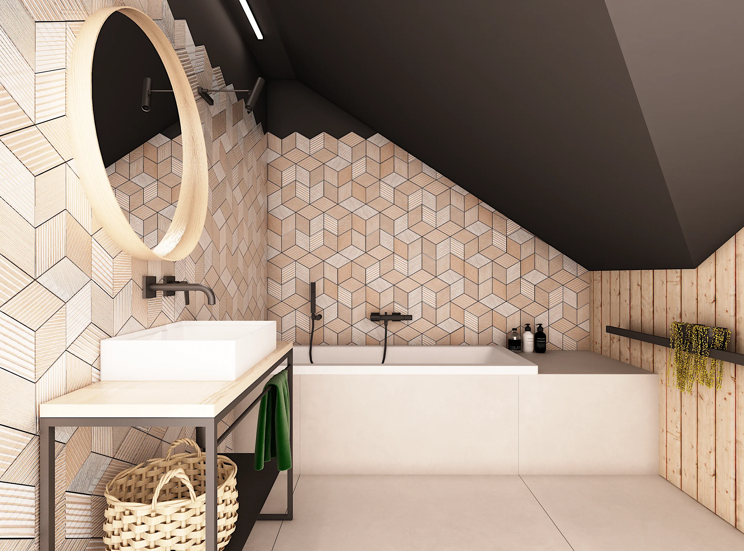 Część otwarta poddasza wydawała nam się dość zagmatwana i wysoka, dlatego pojawił się pomysł z odcięciem części dachu i wyłożeniem jej deskami żeby ocieplić charakter pozostałej części pomalowanej na kolor czarny, który jest świetnym tłem dla drewna, jednocześnie uspokaja bryłę, pozwala ukryć w mroku wszystkie załamania ścian i sufitów. W takim wnętrzu gdzie sufit gra główną rolę, świetnie sprawdzi się neutralna podłoga, my zaproponowaliśmy płytki które imitują spokojny jasny szary beton.