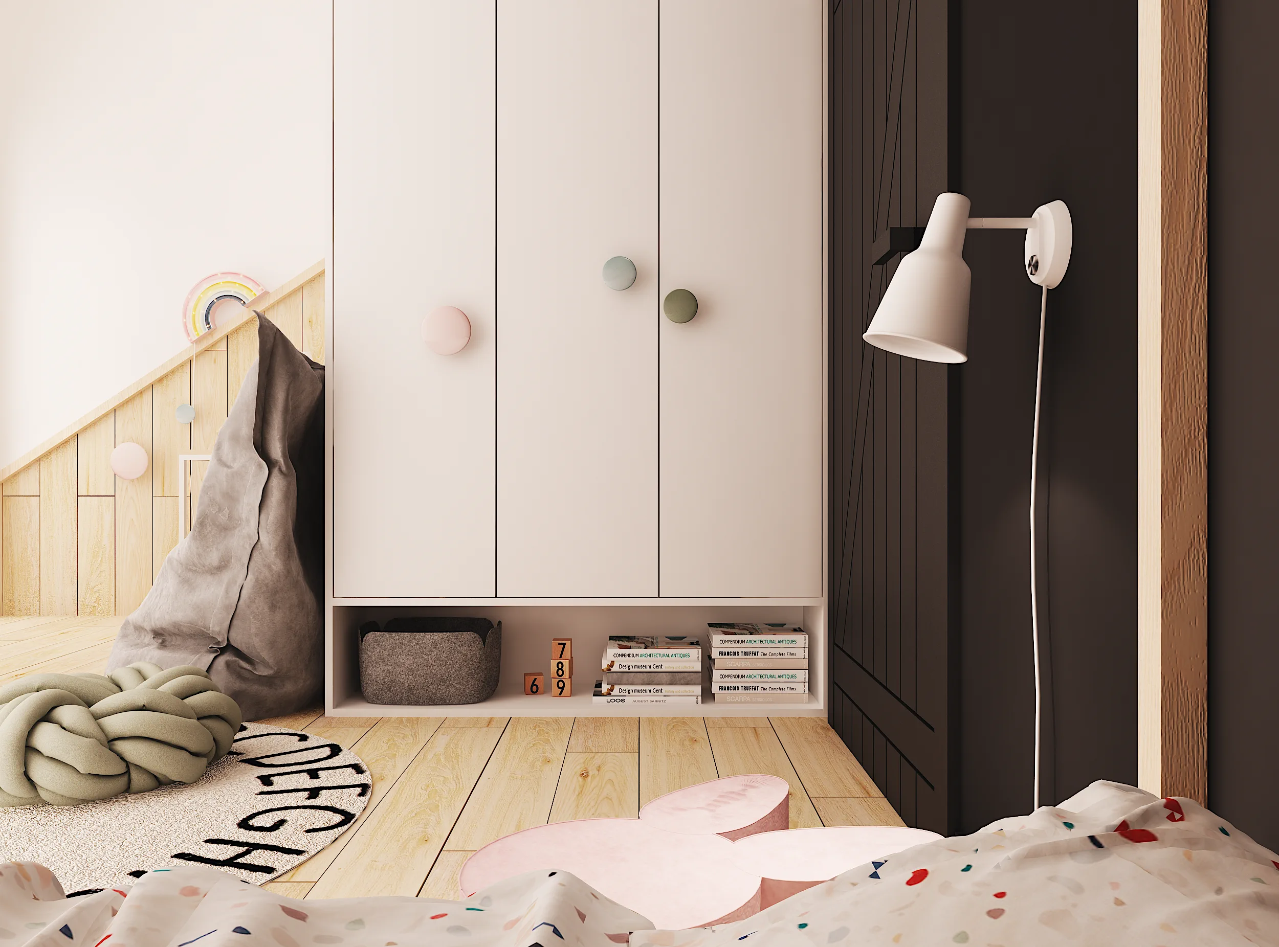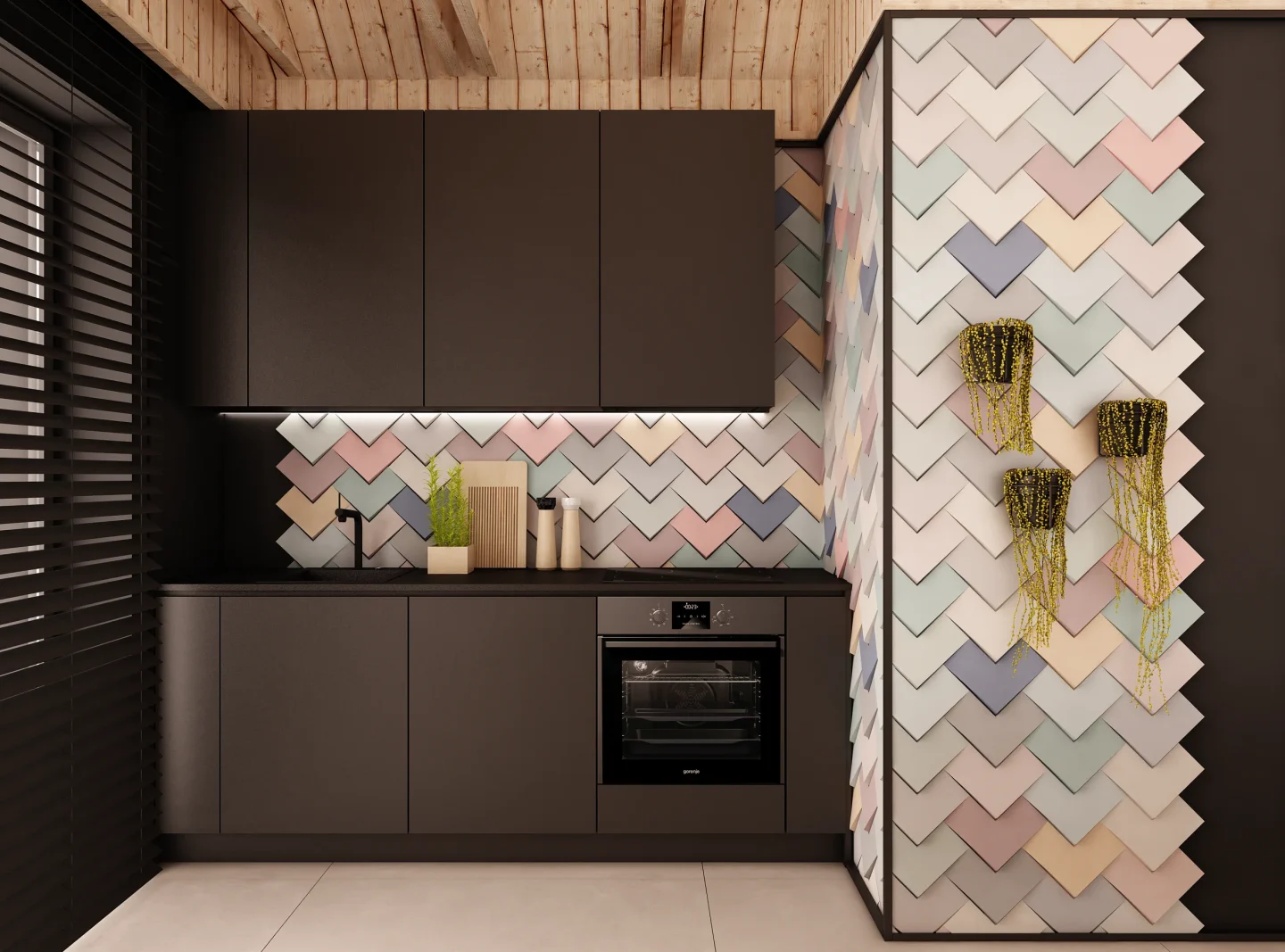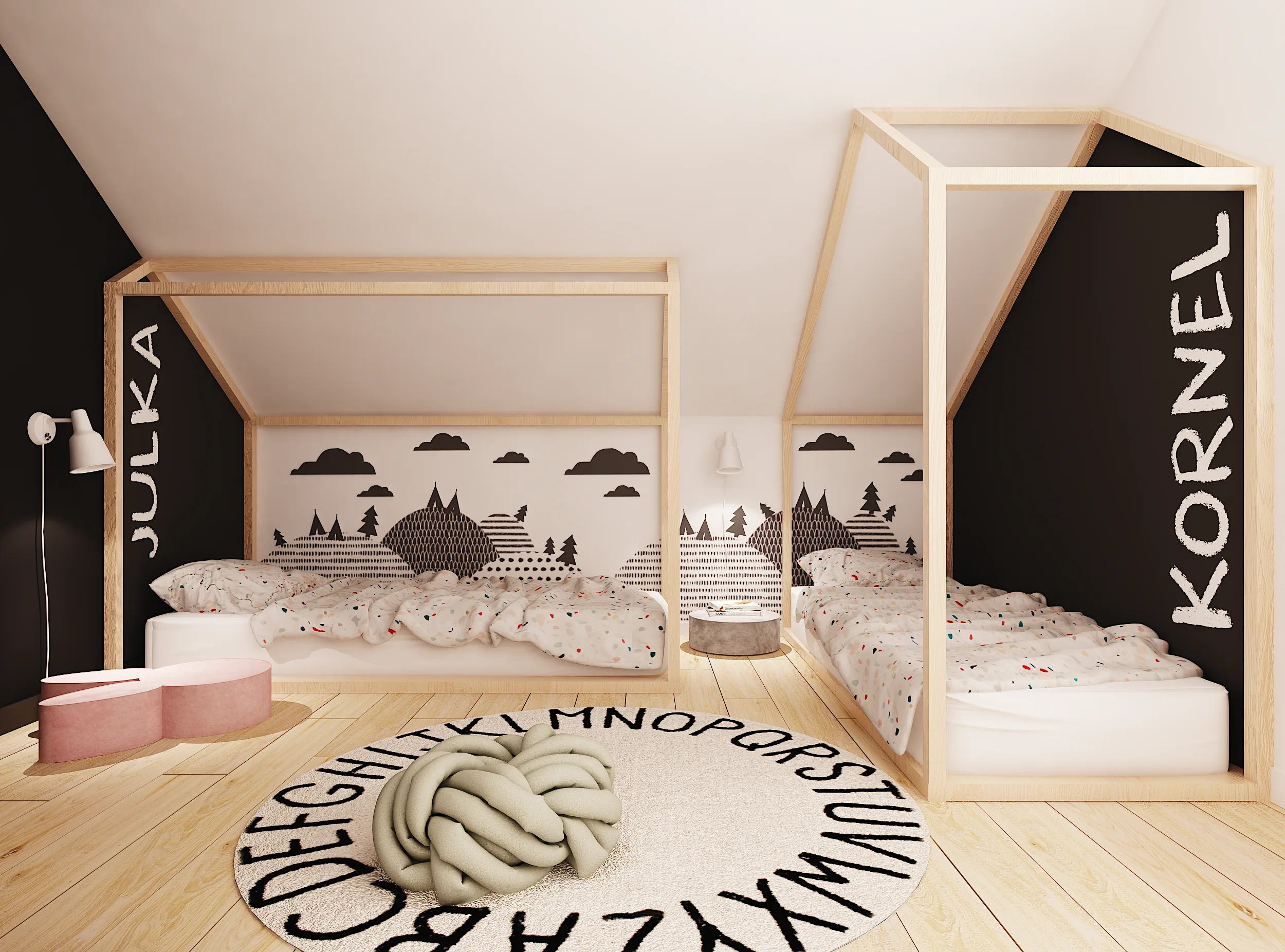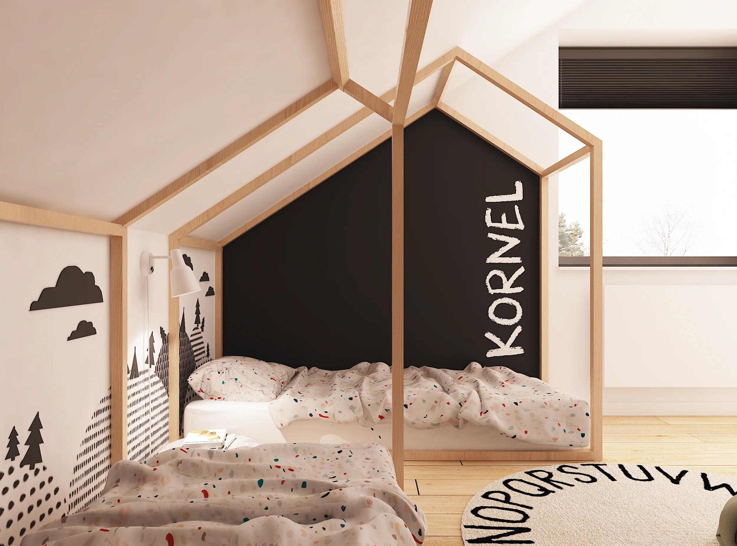 Na życzenie inwestorów do wnętrza zostały wprowadzone kolory. Tym razem postawiliśmy na ciekawe dekoracyjne płytki trójwymiarowe w pastelowej kolorystyce, do których dobraliśmy różne kolory krzeseł. Łazienka jest kontynuacją materiałów i kolorystyki części otwartej. Pojawiają się w niej dekoracyjne płytki w odcieniach bieli i beżu które ocieplają wnętrze, skupiają uwagę na ścianie z umywalką. W pokoju dzieci oraz sypialni pojawia się więcej bieli, drewniana podłoga, delikatne kolorowe akcenty, czerń jest tutaj jedynie tłem które podkreśla ciepło drewna.