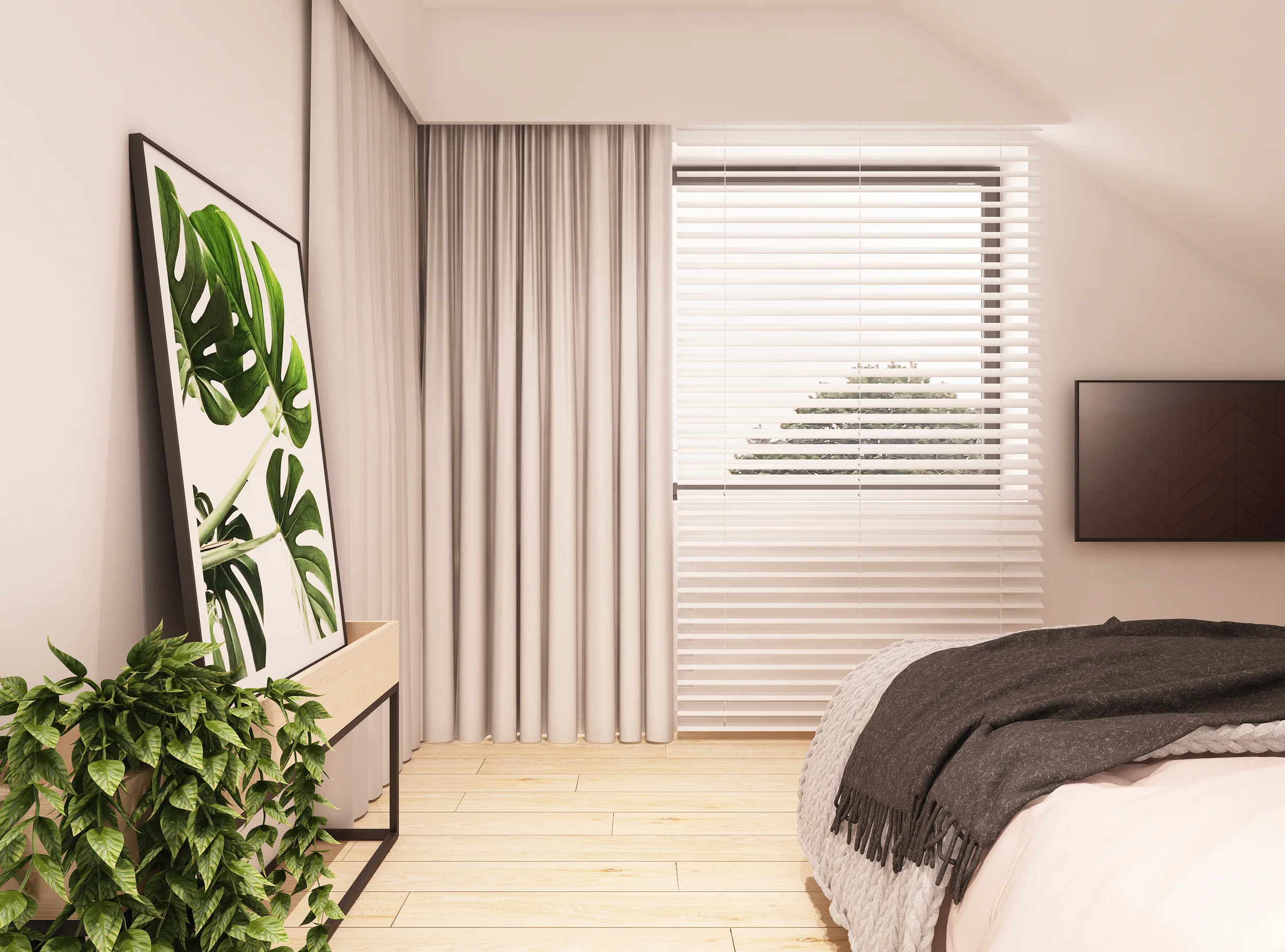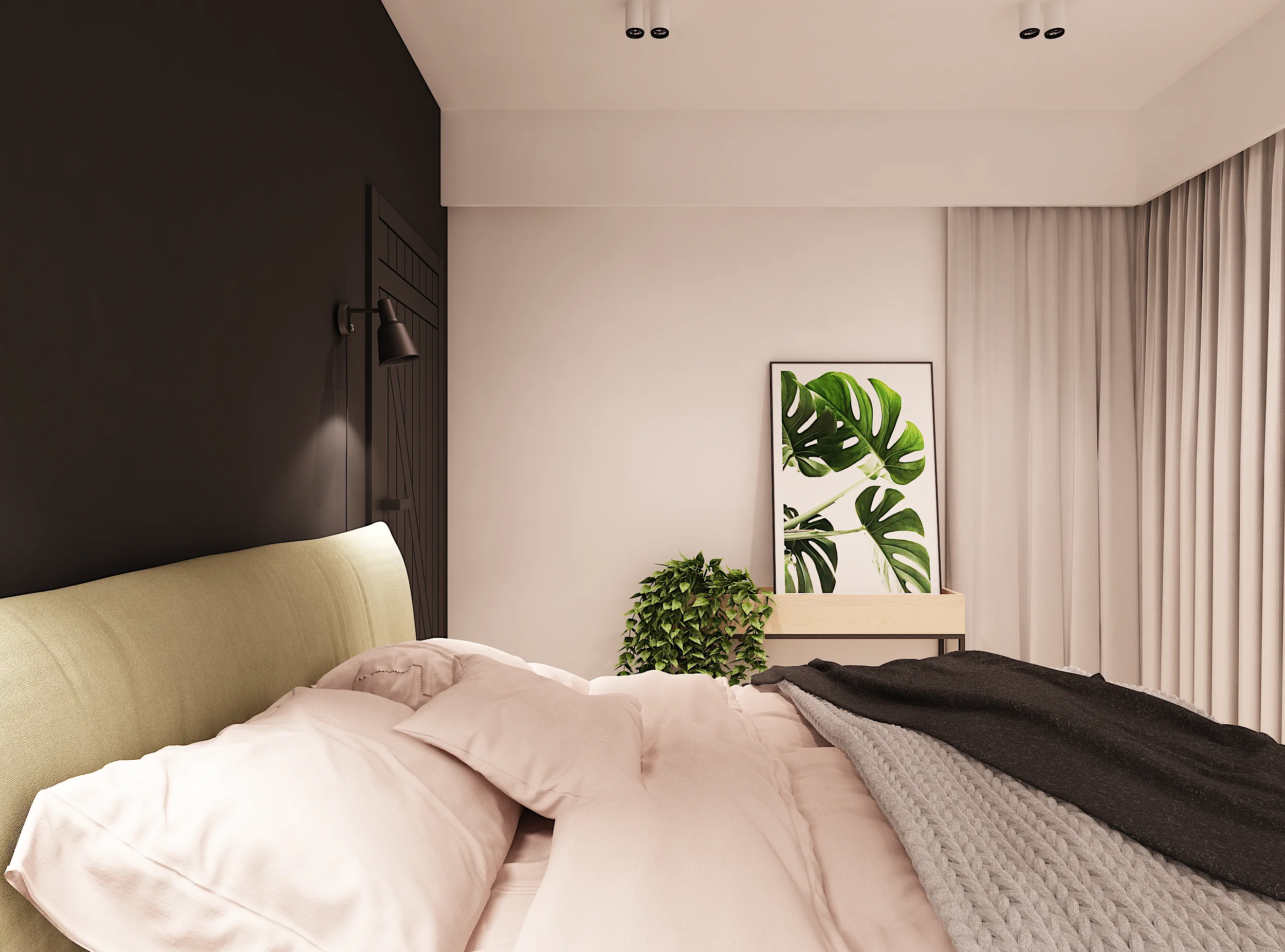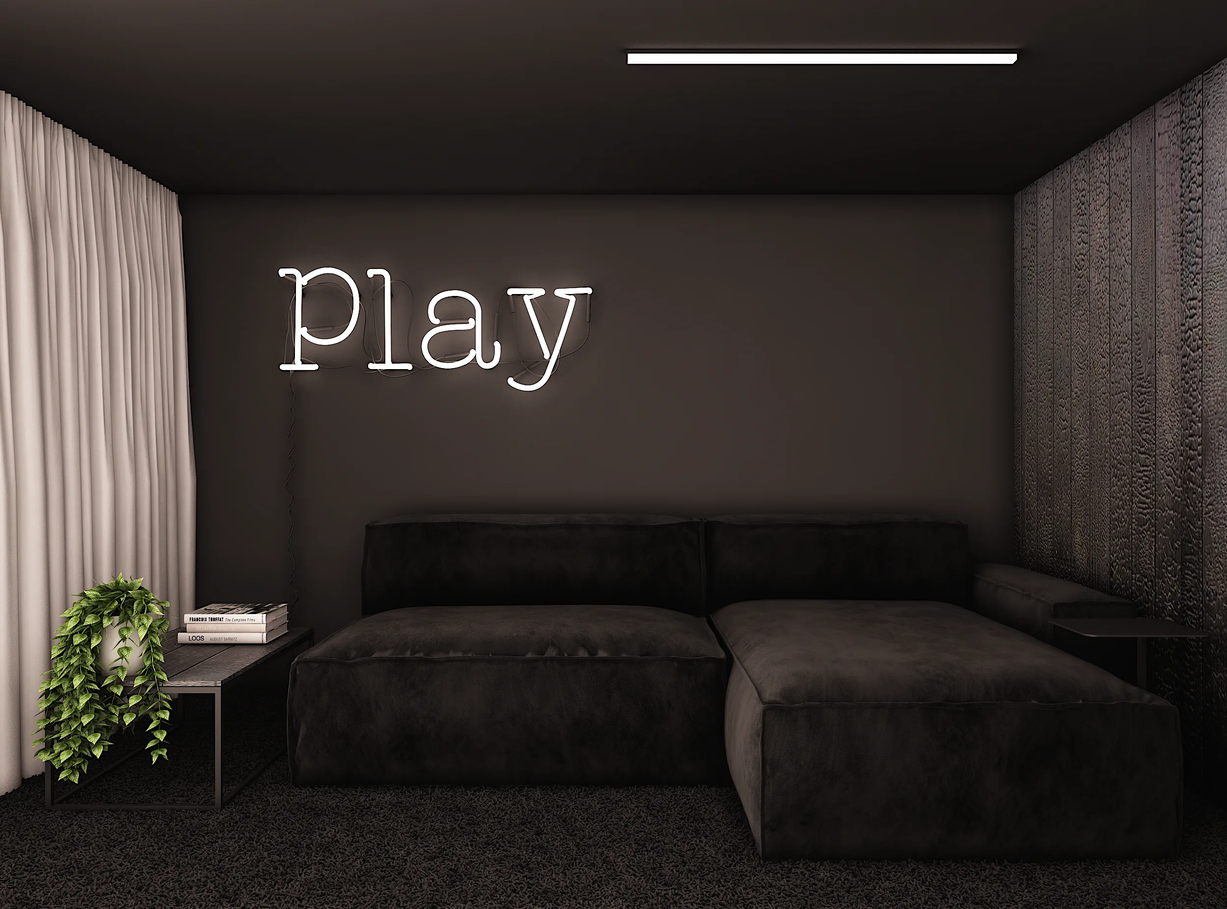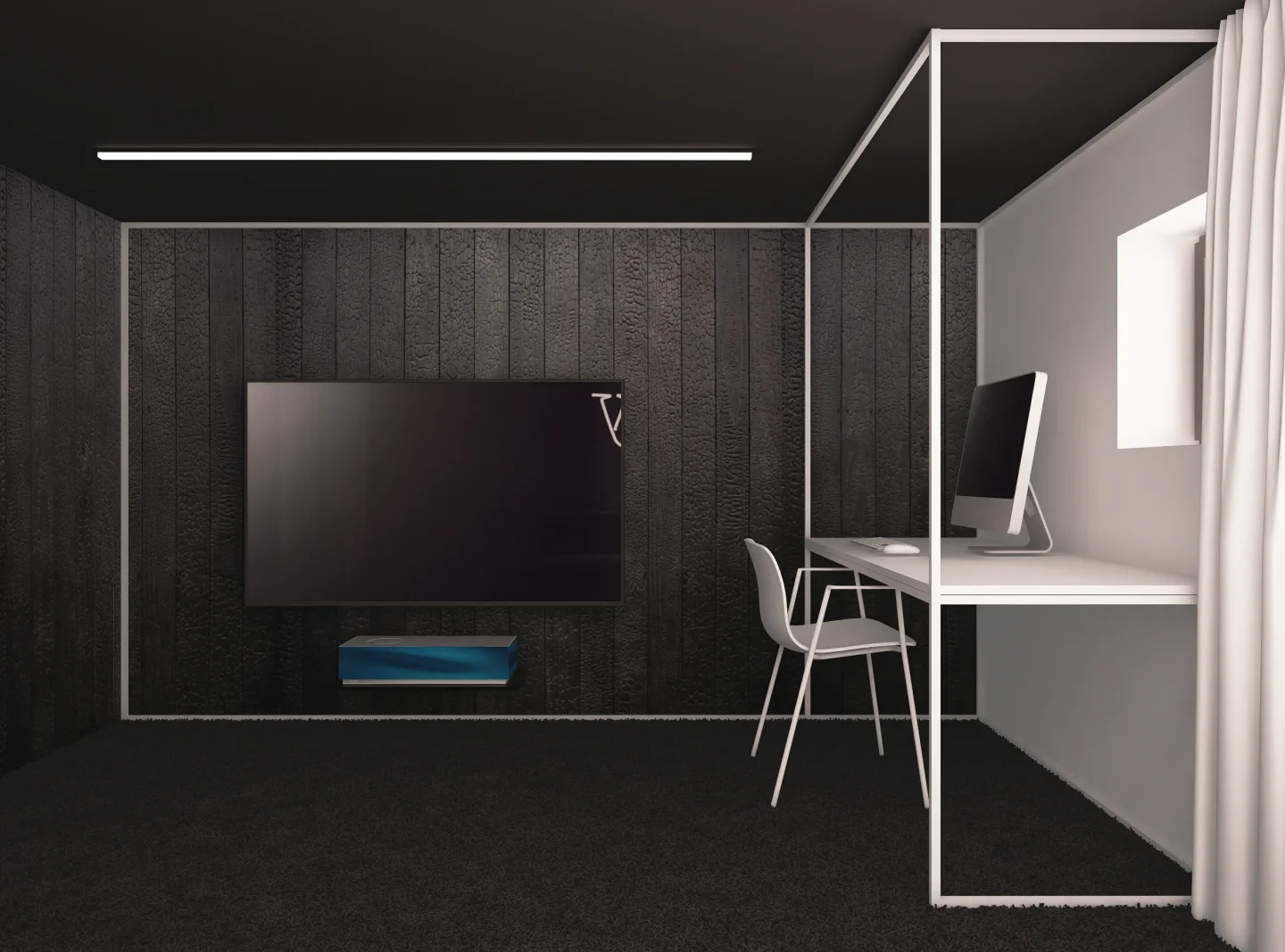 Pokój telewizyjny i gabinet jednocześnie to bardzo niskie pomieszczenie, dlatego ściany, podłoga i sufit zostały wykończone materiałami w kolorze czerni. Na ścianach pojawiły się spalone deski, a na podłodze czarna wykładzina, sofa też jest w kolorze czarnym. Jedynie stelaż biurka odcina się kolorystycznie od czarnych ścian, łącząc ze ścianą i zasłoną w kolorze białym. Charakteru kinowego dodają oprawy liniowe na suficie oraz świecący neon na ścianie za sofą.
