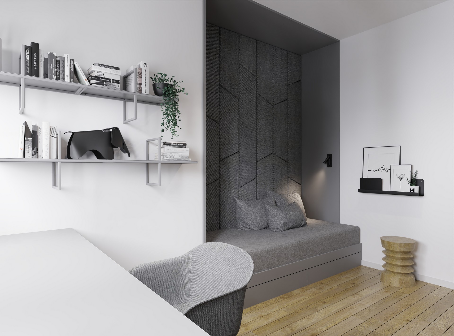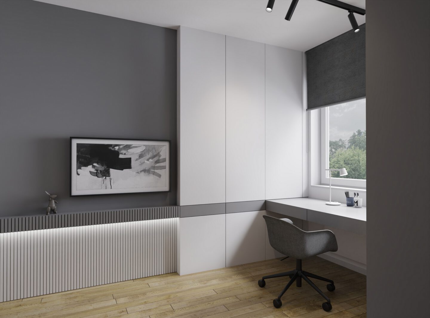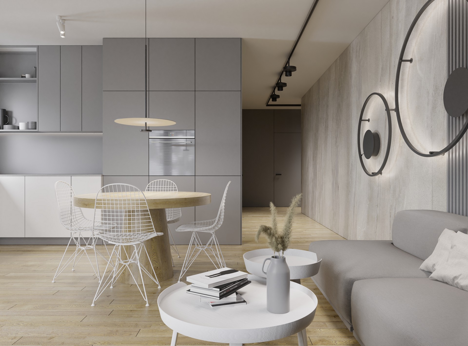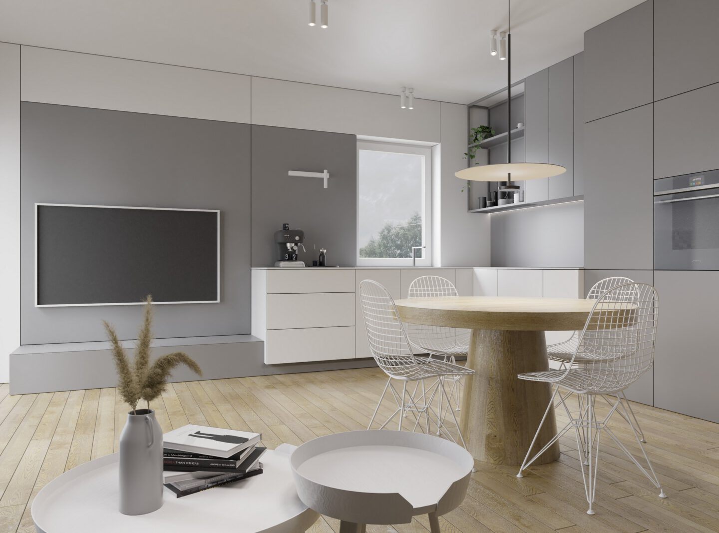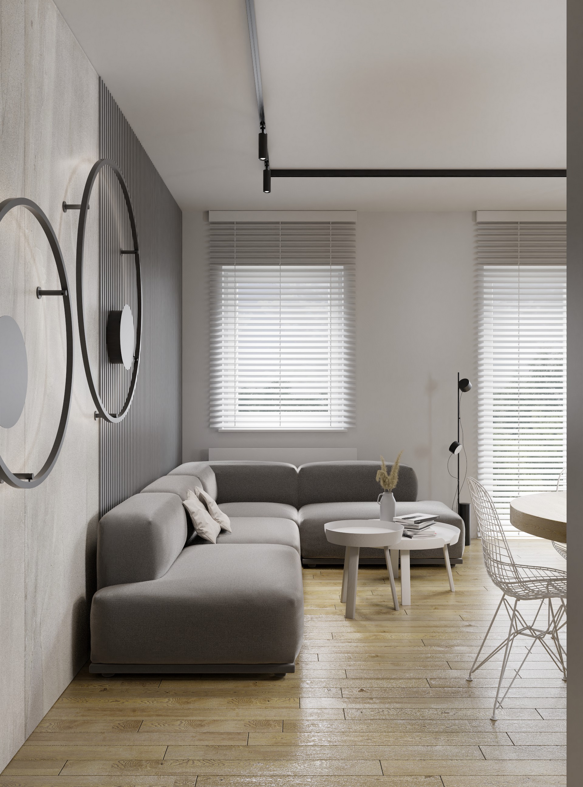 Zadanie projektowe polegało na stworzeniu prostej, minimalistycznej przestrzeni przeznaczonej dla rodziny 2+1. Inwestorom zależało na stworzeniu wnętrza monochromatycznego ale jednocześnie przytulnego. W odpowiedzi na wytyczne zaproponowaliśmy jako bazę kolor biały, odcienie szarości oraz czarne detale. Przytulny charakter wnętrza udało się otrzymać dzięki zastosowaniu dębowych desek podłogowych o ciepłym wybarwieniu i miękkim meblom tapicerowanym.