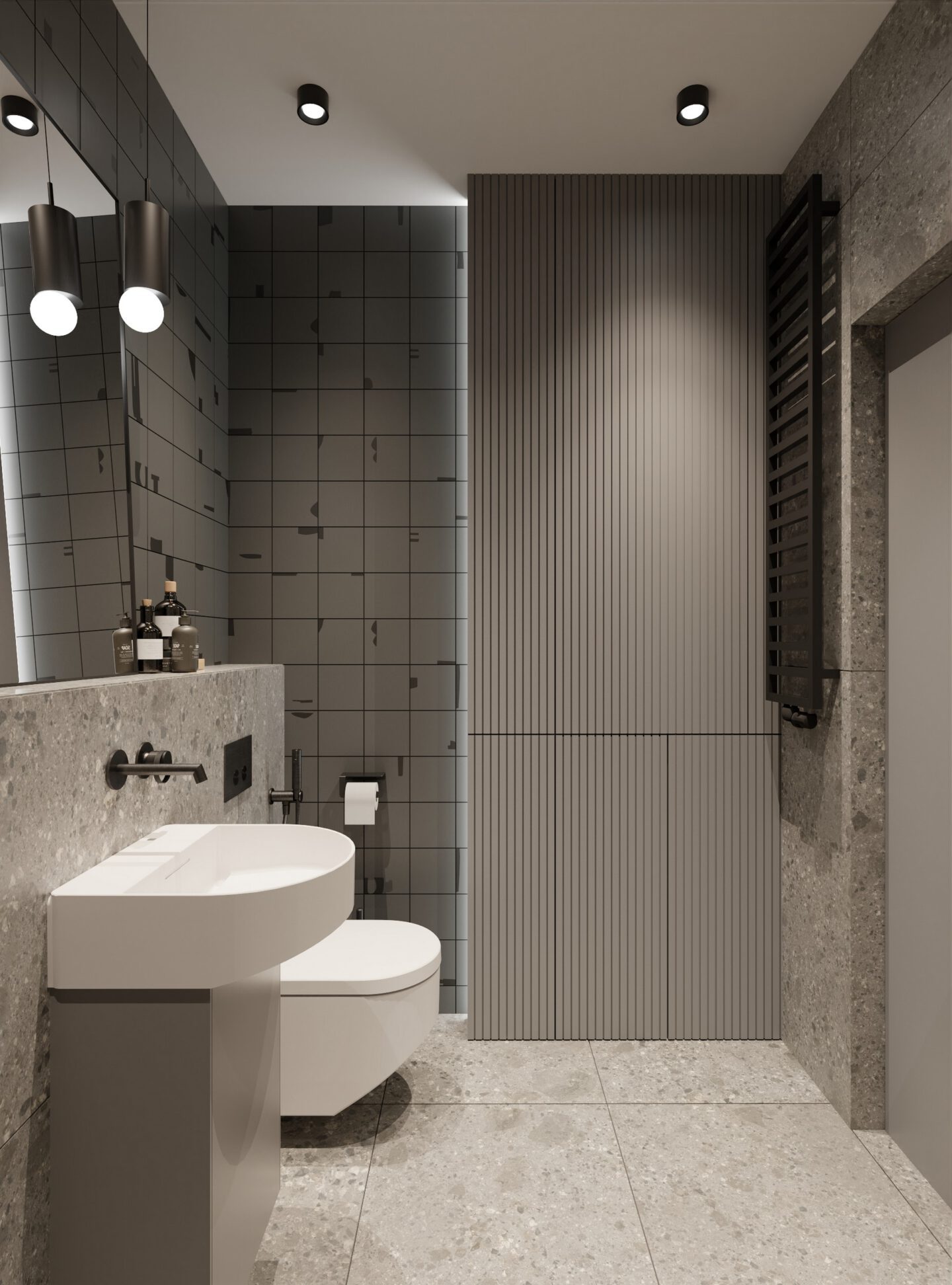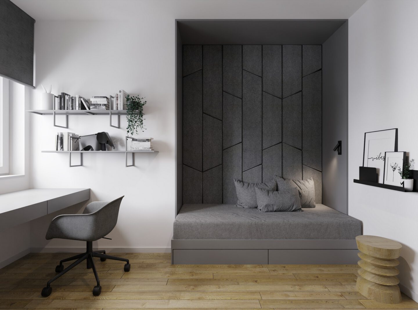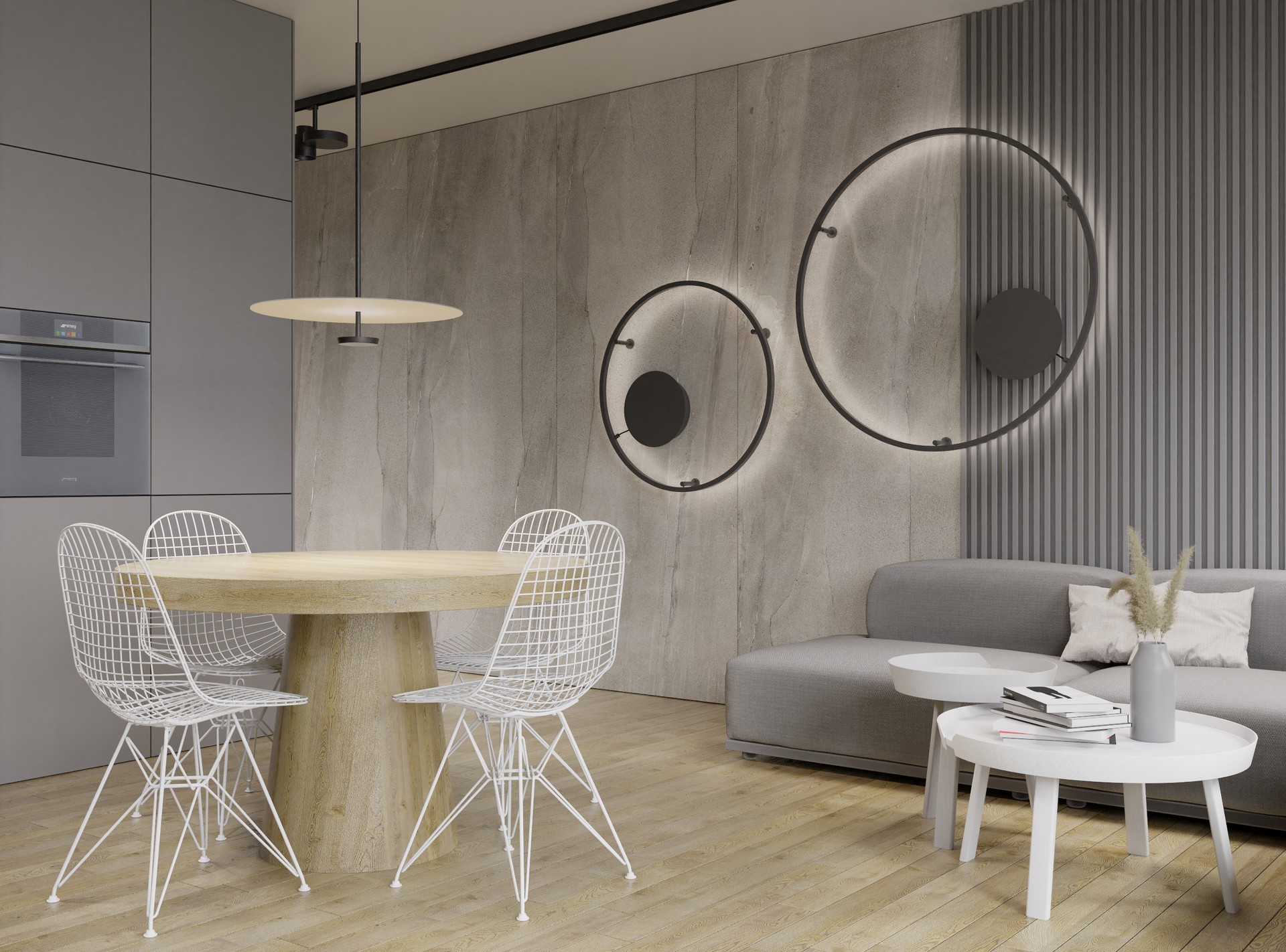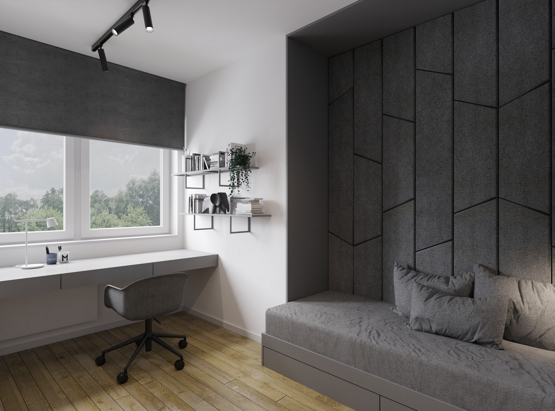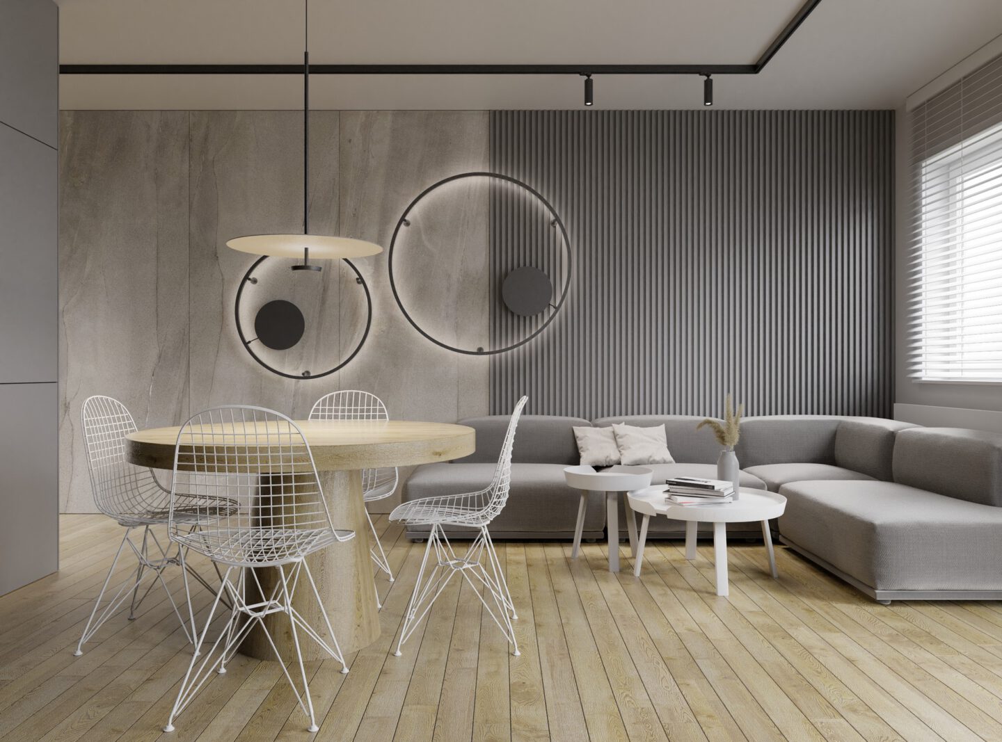 Zadanie projektowe polegało na stworzeniu prostej, minimalistycznej przestrzeni przeznaczonej dla rodziny 2+1. Inwestorom zależało na stworzeniu wnętrza monochromatycznego ale jednocześnie przytulnego. W odpowiedzi na wytyczne zaproponowaliśmy jako bazę kolor biały, odcienie szarości oraz czarne detale. Przytulny charakter wnętrza udało się otrzymać dzięki zastosowaniu dębowych desek podłogowych o ciepłym wybarwieniu i miękkim meblom tapicerowanym.