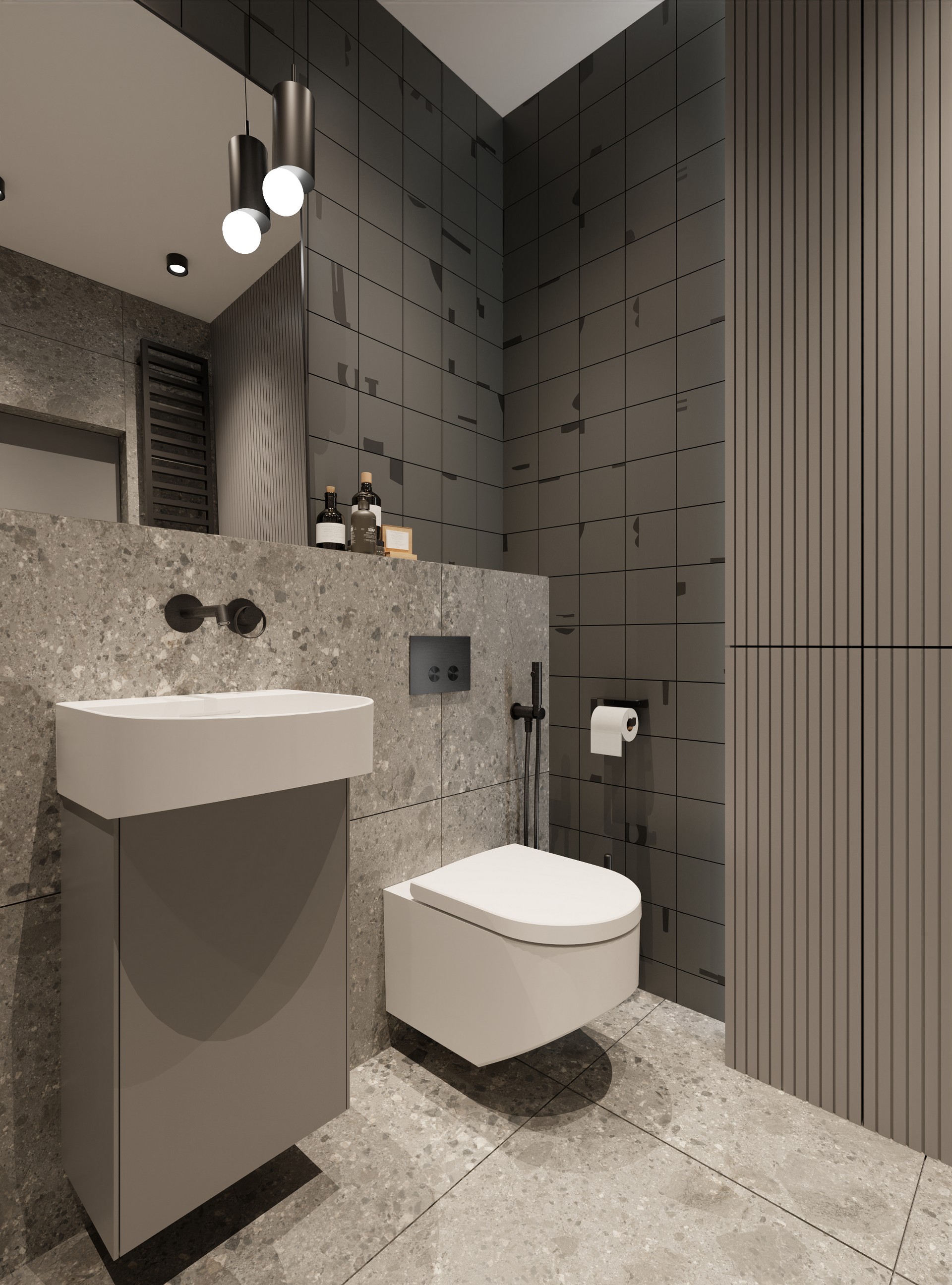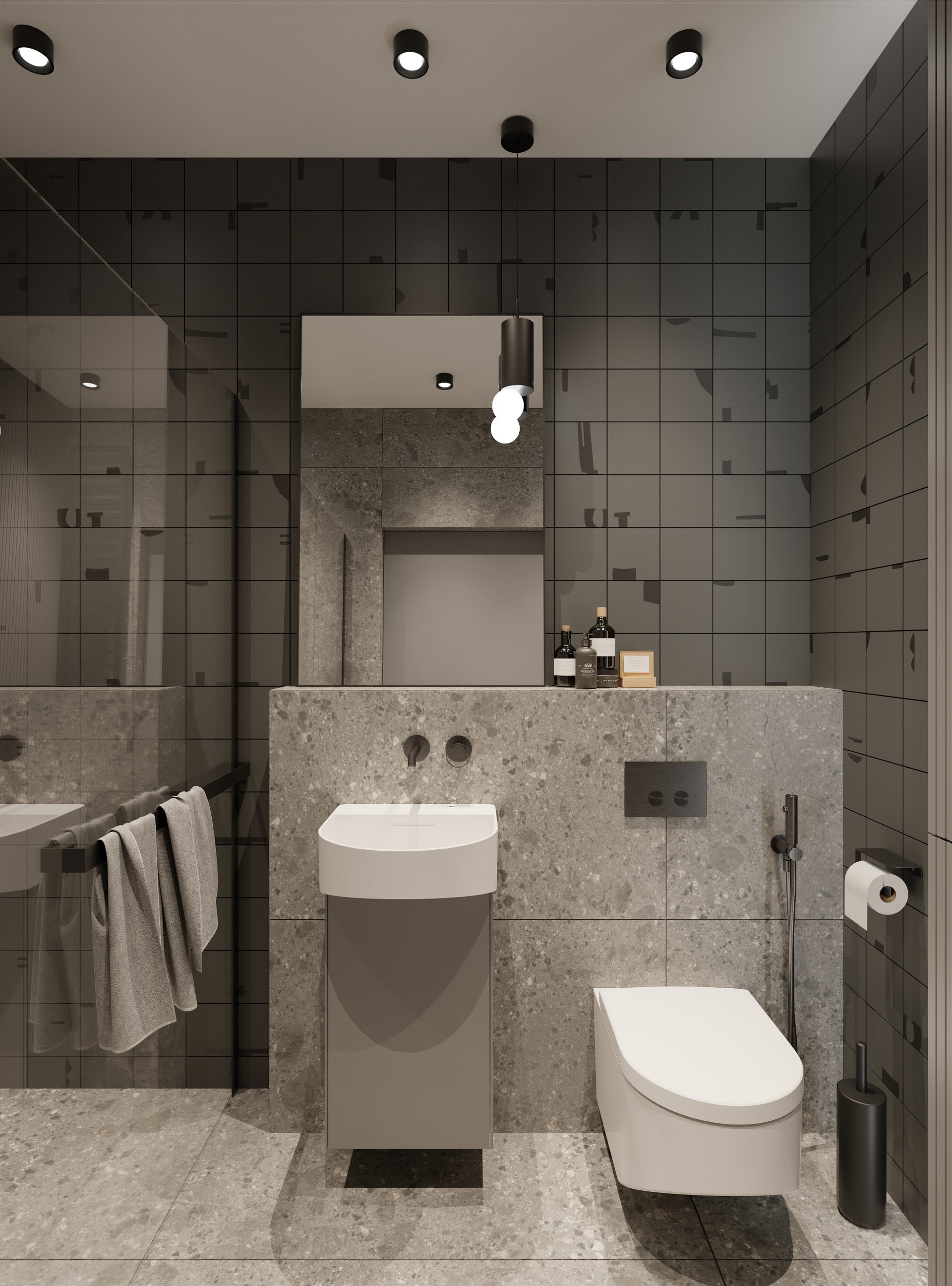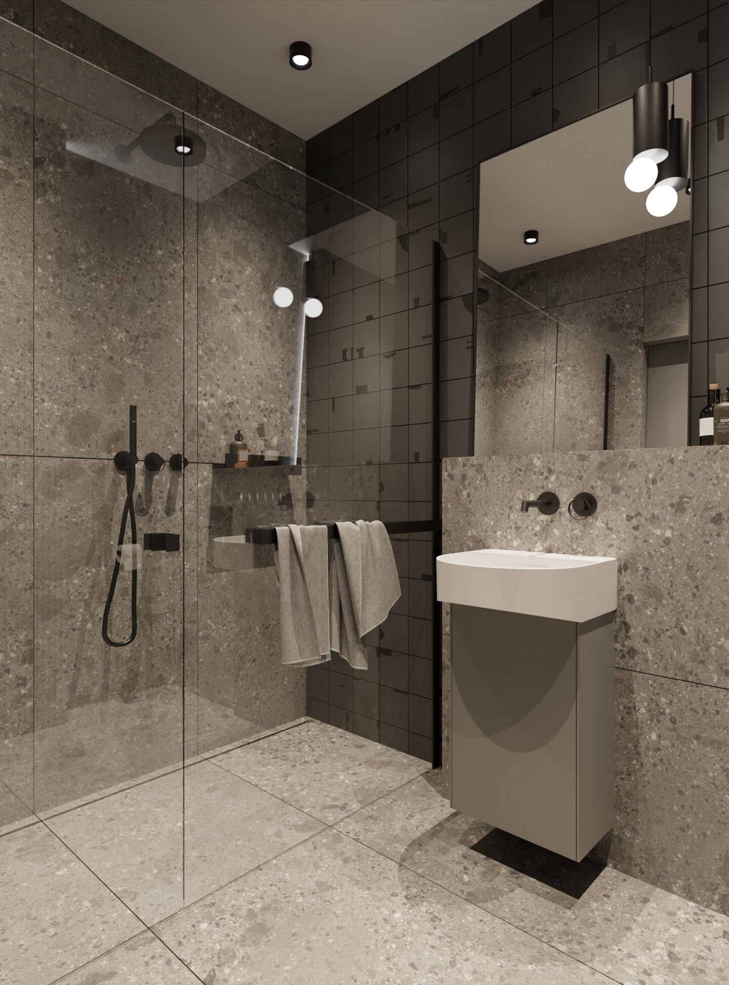 Atutem projektu łazienki jest duża, wygodna kabina prysznicowa oraz pojemna szafa, której oprócz pralki jest miejsce na artykuły chemiczne oraz kosmetyki. Bazę materiałową w łazience stanowią płytki gresowe o wzorze kamienia tłuczonego. Ciekawym uzupełnieniem są małe, szare, minimalistyczne płytki tworzące nieoczywisty geometryczny wzór. Całości dopełnia dobrej jakości czarna armatura.lny/zielona ściana.