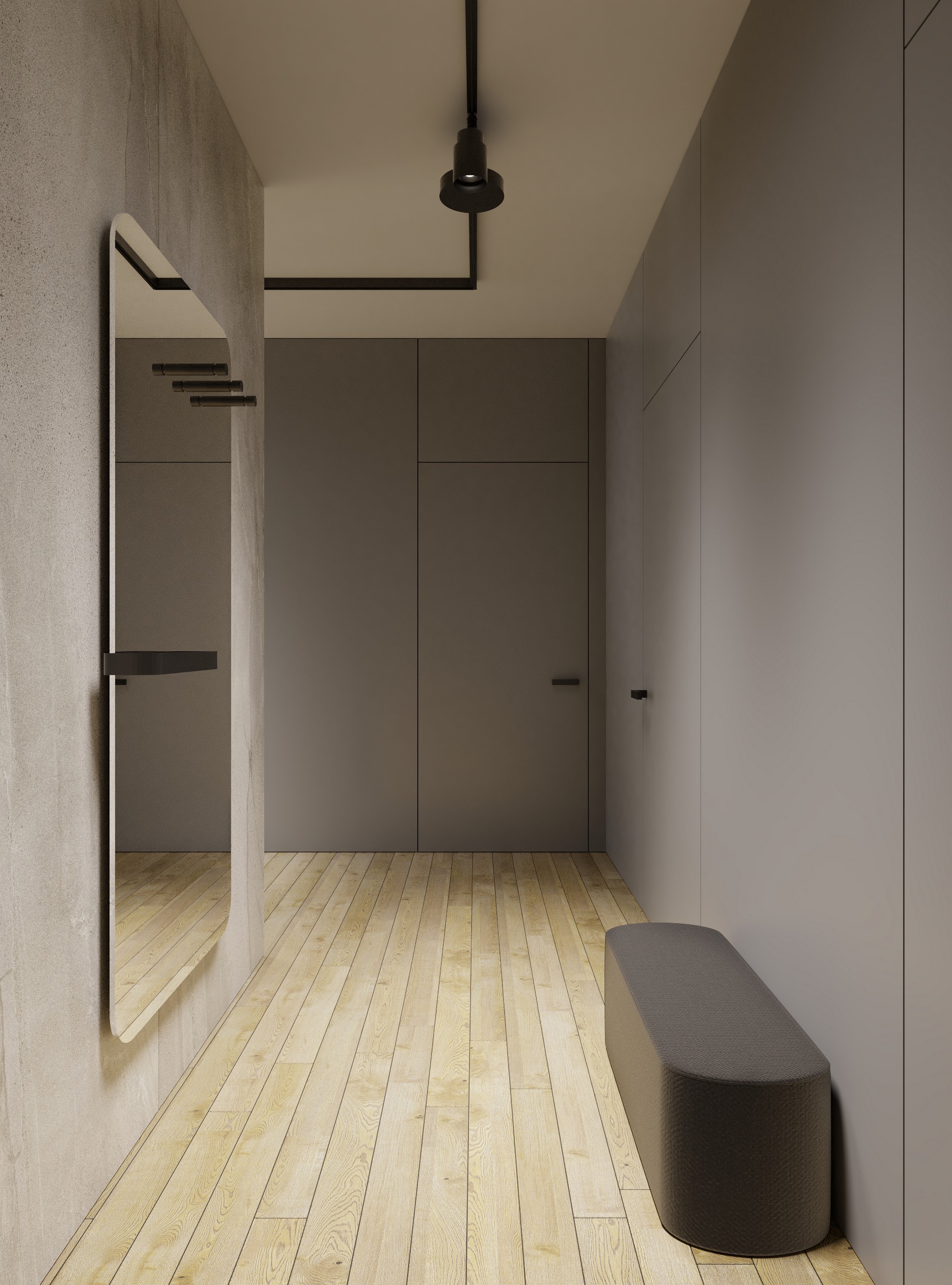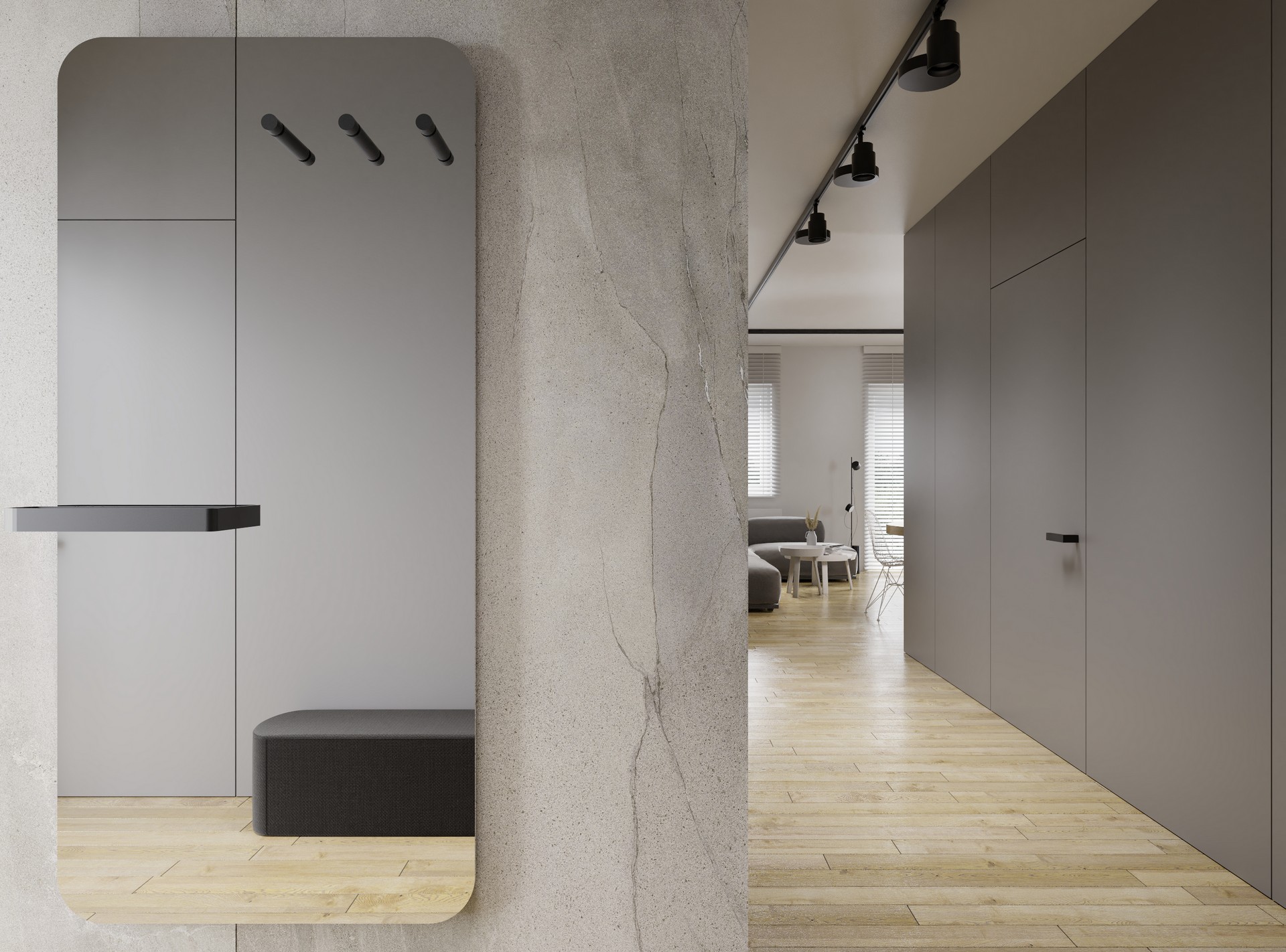 Minimalistyczną forma i spójność wnętrza została osiągnięta dzięki zastosowaniu tych samych materiałów i rozwiązań w obrębie całego mieszkania. Cztery pary drzwi wewnętrznych w korytarzu postanowiliśmy „ukryć” stosując skrzydła licowane z płytą mdf lakierowaną na szary półmat przyklejoną do ściany.